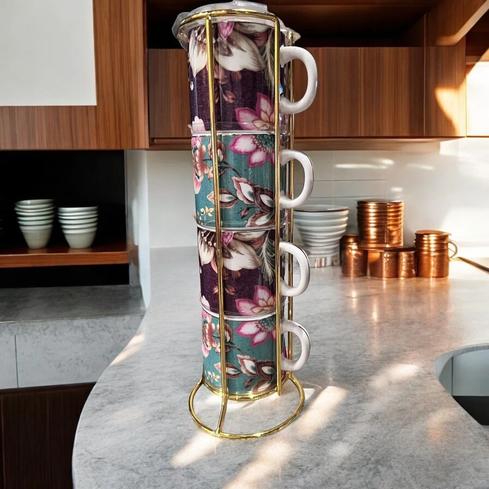 Enhance your tea, coffee, or espresso drinking experience with these stackable cups from Grace's Teaware. The floral pattern and multicolor design add a touch of elegance to your table setting. Made of high-quality porcelain, these cups are durable and perfect for daily use. The set includes four cups and a stand, making it ideal for serving tea, coffee, or espresso to your guests. These cups are stackable, making them easy to store and transport. Perfect for home or office use, these cups are a great addition to your kitchen, dining, or bar collection. Cups are smaller in size approx. 4 to 5 oz.
