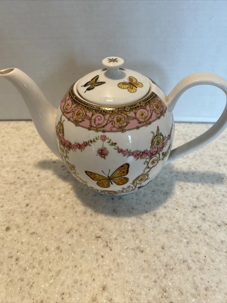 This beautiful teapot from Grace Teaware is perfect for any tea lover. With a charming pink butterfly design, this ceramic teapot stands at 5 inches tall and is ready to serve. The toleware style adds a touch of vintage charm to any tea time. Whether you're collecting or just enjoying a cup of tea, this Grace Teaware teapot is a must-have. The brand is known for their quality ceramics, and this teapot is no exception. Add a pop of color to your kitchen with this adorable pink teapot.