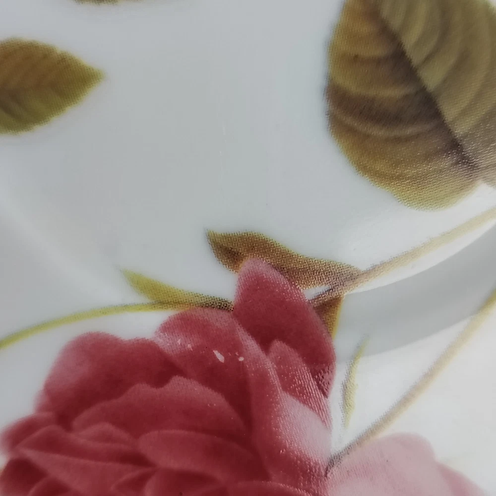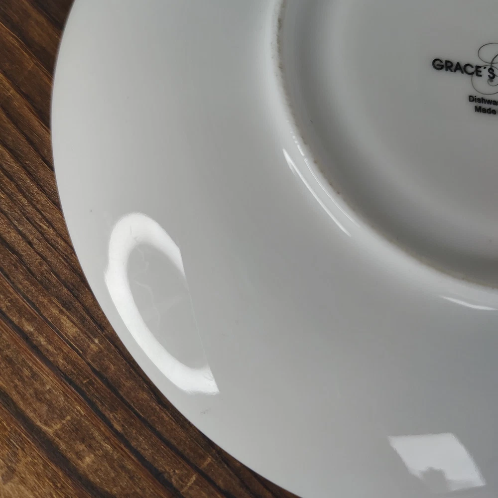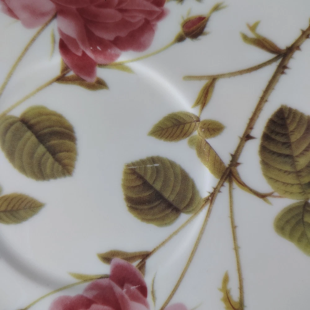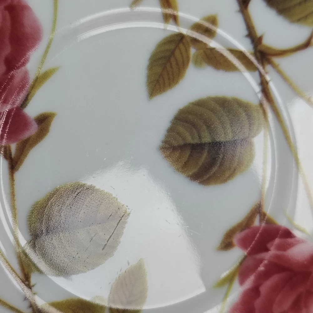 Some scratches on the saucer and on the teacup. Please see measurements and review all pictures provided which show condition and zoom in to get a closer look. Let me know if you have any questions! : )