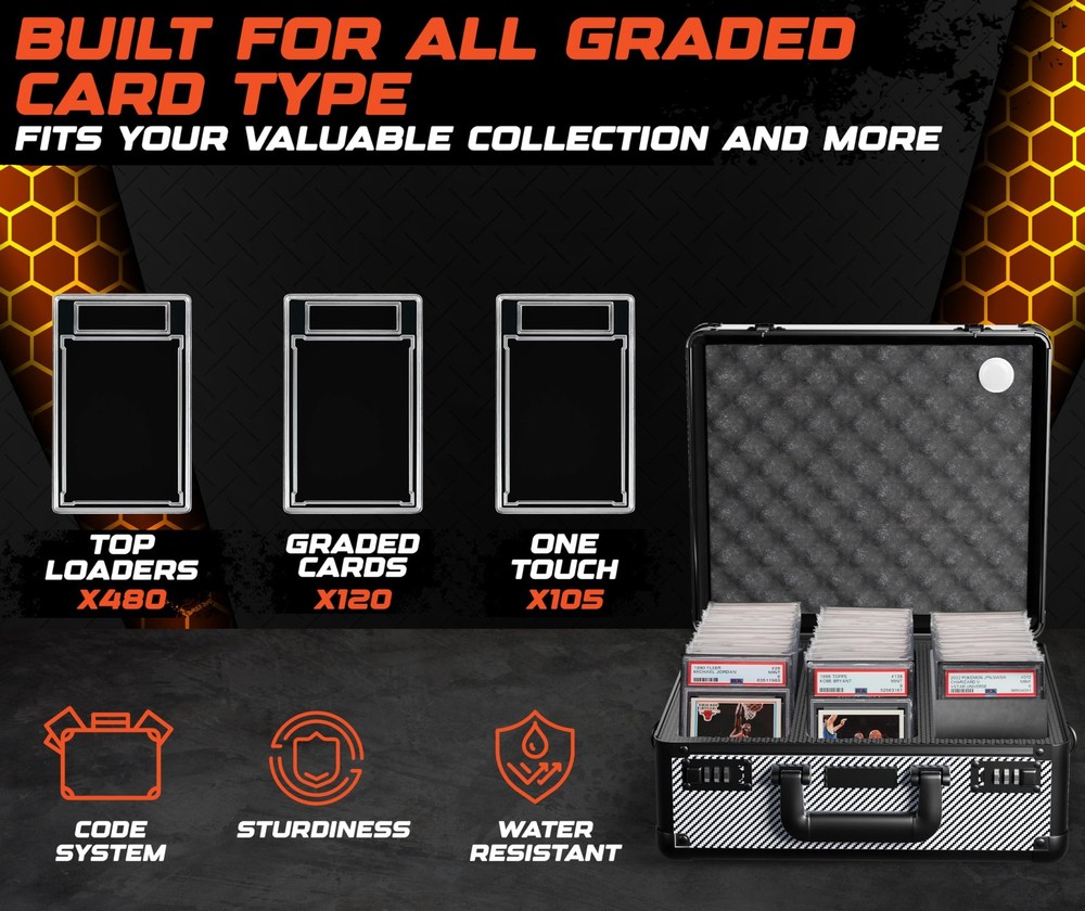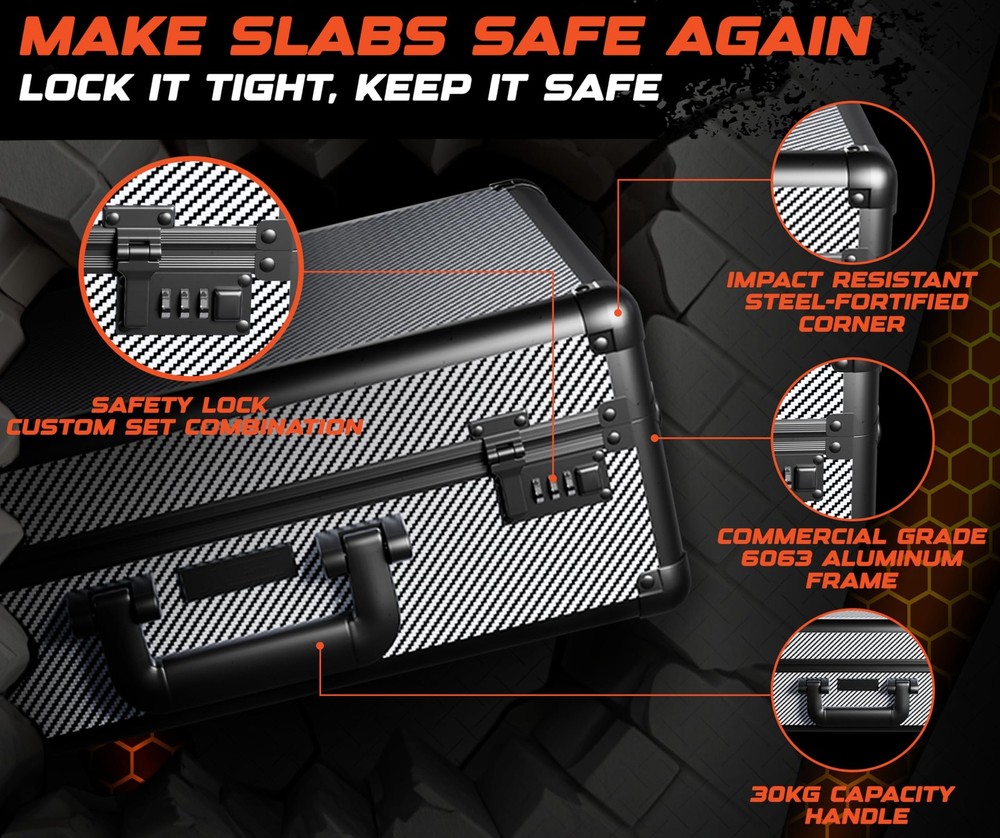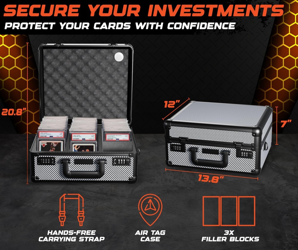 graded card storage box is built for serious collectors who need protection they can count on. card slab case, PSA slabs, trading cards, photocards. durable shell shock absorbent foam help protect your collection from dust, moisture impact. Whether used as a baseball card hard case or as a trading card case, keeps your valuables in great shape at home on the go. Designed for Convenience & Durability Crafted from commercial grade aluminum with reinforced steel corners, this card carrying case is made to last. outer shell resists damage while maintaining a lightweight feel. A detachable shoulder strap adds hands-free convenience, integrated AirTag holder helps card collection box wherever you travel. This model also features dual combination locks, delivering secure storage you'd expect from a premium slab case for graded cards. Custom Interior for Better Organization sports card case, you’ll find soft lining, shock-resistant foam filler blocks. These elements work together to hold cards in place minimize shifting during transit. interior adapts to fit a range of slab sizes, ideal card storage case for collectors with diverse card types evolving collections. 2, 3, 4 compartment layouts to match your trading card storage box. Reliable Storage for Collectors of All Levels building your collection managing hundreds of slabs, this hard sports card box offers peace of mind practical organization. trading card storage case, a sports card storage solution, growing collection. container protection performance. box holder organizer boxes hard display loader toploader collector sport briefcase playing supplies collectible small binder bulk accessories game holders deck collecting gifts carry albums sleeves thick organizers protector container best ideas sportscard row binders plastic waterproof empty cabinet rigid trade suitcase trading-card backpack long topload almacenamiento deportivas graduadas comerciales transporte tradong estuche para tarjetas Heavy-Duty Sports Card Case - and protect your valuable slabs with this reinforced aluminum trading card storage case, designed for sports card storage box use. Fits PSA, BGS, SGC, and more. Built for Sports Card Collectors - Whether you collect football, baseball, or need a slab case compatible with collectible card games, this sports card box keeps everything secure with soft foam and a durable, lockable design. Slab Case for Graded Cards On the Go - Features a comfortable handle, optional shoulder strap, and AirTag holder so your card carrying case is always easy to track and ready for travel. Secure and Adjustable Fit - Custom-cut foam keeps slabs snug to prevent movement or damage. This card slab case also works with top loaders and raw cards, making it a flexible card storage case. Display-Ready and Gift-Worthy - A sleek, pro-level card collection box with a combination lock, premium build, and black carbon-fiber style – ideal as a trading card case or sports card storage gift.