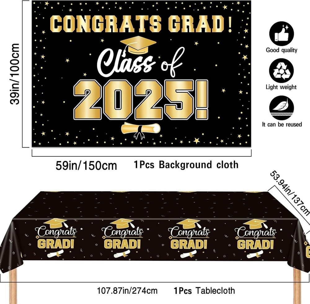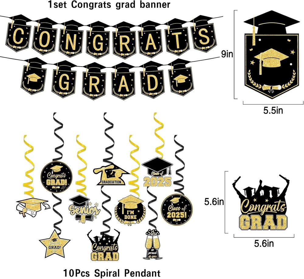 2025 Graduation Party Decoration: It will decorate an unforgettable graduation party. Create a stylish graduation party with a series of black "Congratulations to Graduates" banners, latex balloons, background cloth, tablecloths, desktop honeycomb decorations, and hanging swirl, reflecting the outstanding achievements of your class of 2025. High School & College Celebrations Party Supplies: Decorate your graduation party with our exquisite and beautiful graduation party set, which will make every corner of your celebration space full of vitality. Create unforgettable photo backgrounds. These essential graduation decorations for 2025 add grand and spectacular colors to any graduation party. Complete Graduation Party Supplies: Our decoration kit meets everything needed for graduation parties and is a must-have item on any graduation party supplies list. Our 2025 graduation decoration brings elegance and fun to the celebration, effortlessly blending with other party essentials to create a seamless and stunning visual feast. Graduation Party Package Including: Grad Banner*1, class of 2025 backdrop*1, tablecloth*1, honeycomb*4, balloons*18 and hanging swirl*10