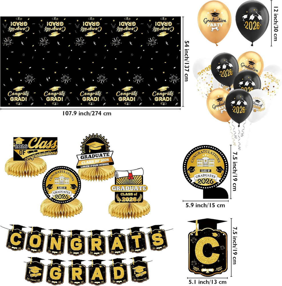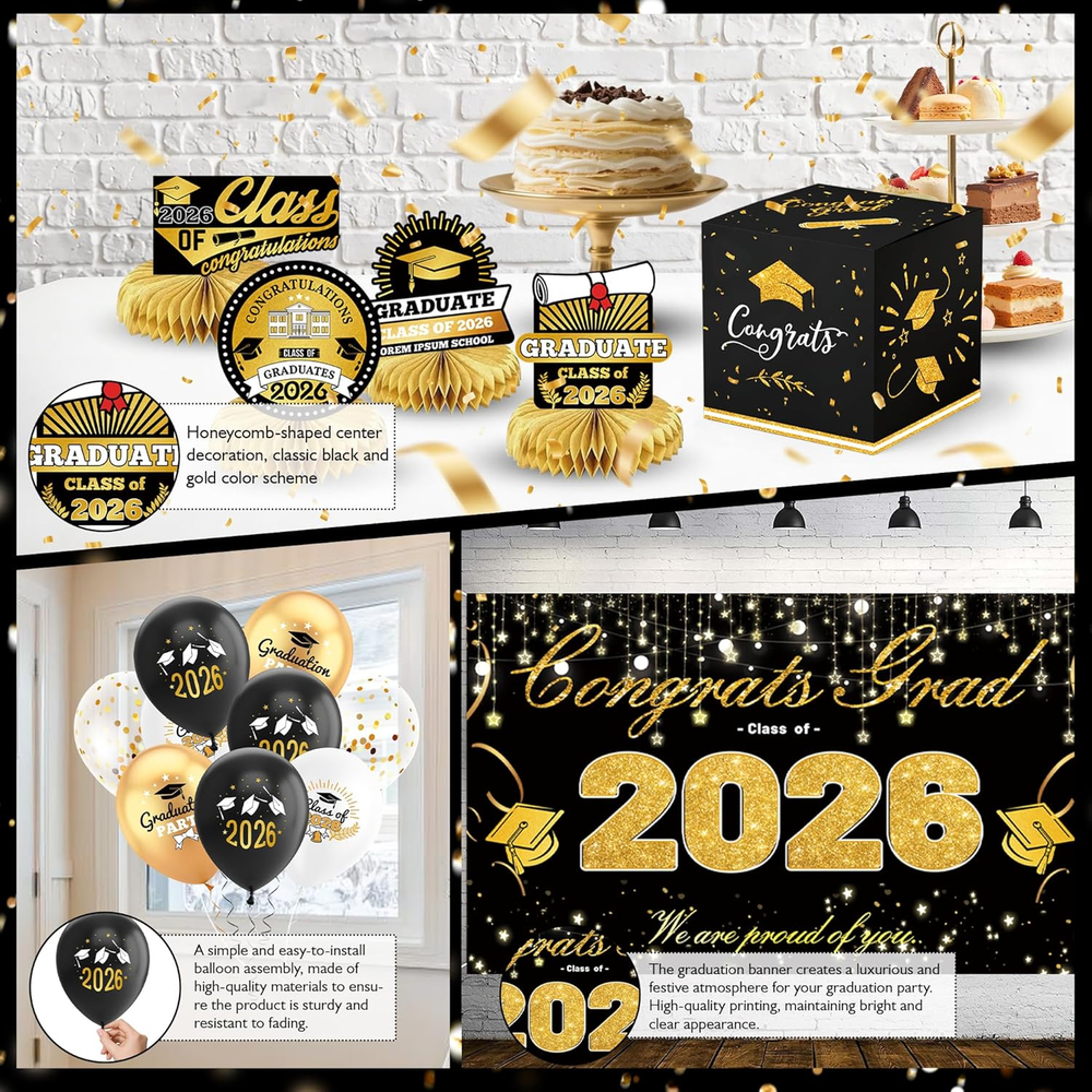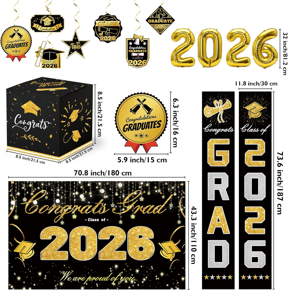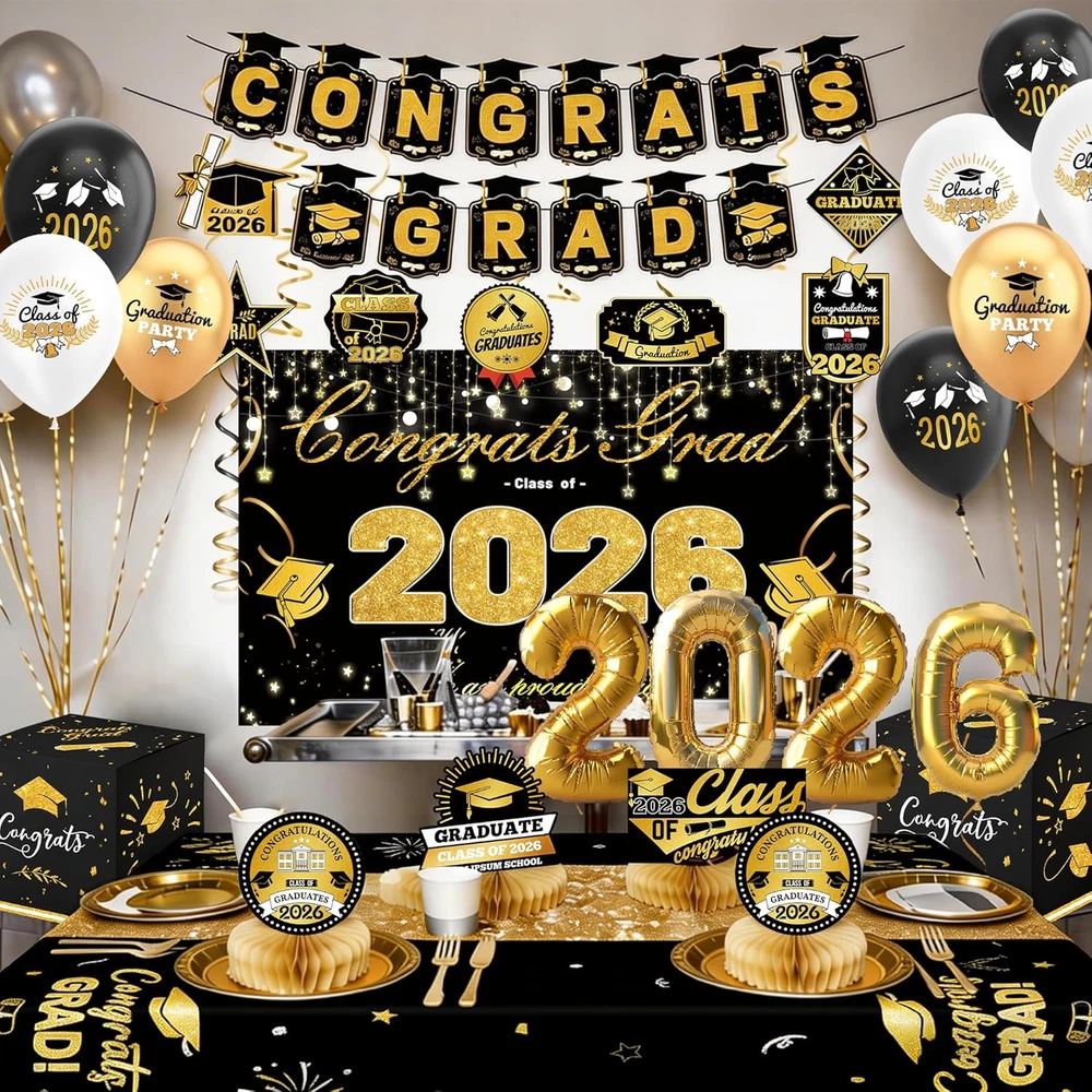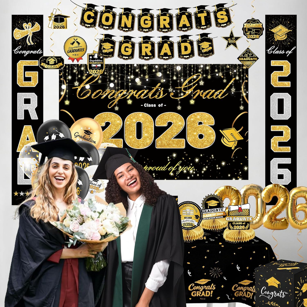Store New Arrivals Add to Favorite View Feedback Contact Fast deliveries to the customer's home Quality customer service John Make the customers happy! Graduation Decorations 2026-Black and Gold Party Supplies,Class of 2026 Backdrop,Congrats Grad Banner,Tablecloth,Porch Banner,Balloons & Grad Card Box for College High School Description Accurate 2026 Graduation Banner: This 2026 graduation set features a large backdrop and banner with precise "Congrats Grad" lettering. Each piece is designed with new, trendy graduation elements for the Class of 2026, ensuring clear, error-free printing and vibrant colors that provide a professional look for your photo background. Elegant & Secure Graduation Card Box: Keep your congratulatory cards and gift envelopes safe in style. This set includes a beautifully designed, sturdy card box that perfectly matches the 2026 theme. It’s not just a functional organizer but also a stunning centerpiece for your gift table. Durable Latex Balloons & Swirls: The collection includes balloons made from reinforced latex material and stylish hanging swirls. The thickened balloon construction is suitable for both air and helium, while the metallic swirls add a multi-dimensional decorative effect to your ceiling or entrance. Odorless & Quality Materials: We prioritize your experience by using materials that undergo a deodorizing process. The latex balloons and printed fabrics are odorless and safe for indoor use, ensuring a pleasant environment for students, faculty, and guests during the entire graduation ceremony. Simple & Quick Installation: Designed for convenience, all party components are easy to assemble. The backdrop comes with hanging points, and the banners are pre-spaced to save time. You can quickly set up a complete celebration environment in your living room, backyard, or classroom without extra tools. Product description Color Black and Gold Pattern Solid Material Latex, Paper, Polyester, Cardboard, Cardstock Theme Graduation Occasion Graduation Included Components Balloon, Banner, Tablecloth ABOUT US We offer the best prices around on high quality products. Our E-store includes media such as books, movies, music and games while offering electronics, toys, sporting apparel, clothing, tools, general home, garden items and more. SHIPPING We are always working hard to ensure your package arrives as soon as possible. Please understand that some factors like weather, high postal traffic, and the performance of shipping companies are outside of our control. We offer free shipping to the lower 48 states and ship within 2 business days of payment, usually sooner. We do not accept P.O. Boxes. Please provide a physical address. For shipping outside of the continental USA, we only use eBay's Global Shipping Program. The item is shipped to KY and then sent to the rest of the world. International customers are responsible for all duties and taxes. Continue to 'check out' to calculate costs for shipping the item to your country. Messages regarding eBay's Global Shipping Program MUST be directed at eBay EXCLUSIVELY. RETURNS We offer a 30-Day Return Policy on items in which you are not completely satisfied with. You have the option of a full-refund or an exchange of the item. No returns are available on items shipped outside of the USA PAYMENT We accept PayPal. CONTACT US This page content is yet to come Please ad us to your favorite seller and visit again later Thank You CUSTOMER SATISFACTION We try our very best to make sure every customer is completely satisfied. If there's a problem, message us! We're happy to help. WE ACCEPT