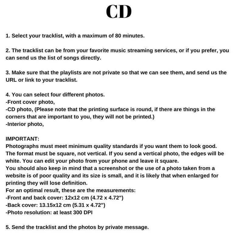 Mark the end of an unforgettable chapter with a CD full of songs that capture your best memories together. NSTRUCTIONS CD 1- Choose your tracklist, up to a maximum of 79 minutes of music. 2- You can share your playlist from your favorite music streaming platforms, or simply send it to us directly, listing the artist and song title for each track. 3- If you're sending a playlist link, make sure it is public, so we can access and view it without issues. Choose Up to 3 Photos for Your Custom CD: -Cover photo (this will be the front of the jewel case) -CD photo (printed directly onto the disc - keep in mind it's a circular surface) Important: Anything placed in the corners might not appear due to the round format. -Interior photo (the image displayed when the case is opened) A IMAGE REQUIREMENTS: Photos must be high quality and square format. . If you send vertical images, white borders will appear on the sides. You can easily crop and adjust your photo using your phone before sending. Avoid using screenshots or photos from websites, as they are usually low resolution and may appear pixelated when printed. For best printing results: Cover & Inside Dimensions: 12 x 12 c m (4.72 x 4.72 inches) Minimum Resolution: 300 DPI We can create your mixtape on CD, cassette, or USB, whichever you prefer. CP HOW TO SEND YOUR CONTENT: Please send your tracklist and images via private message after placing your order. • Orders are prepared and shipped in less than 24 hours after receiving all materials.