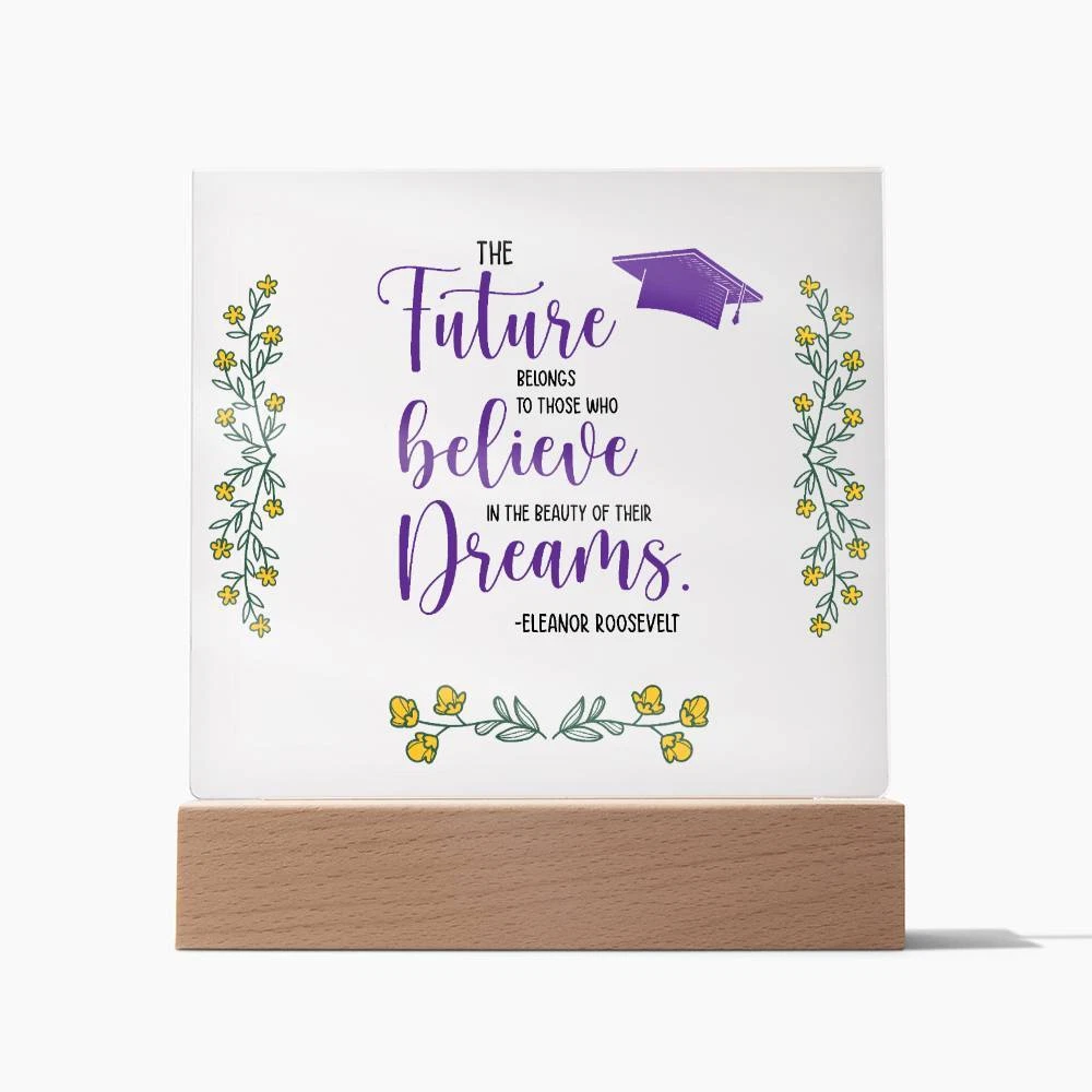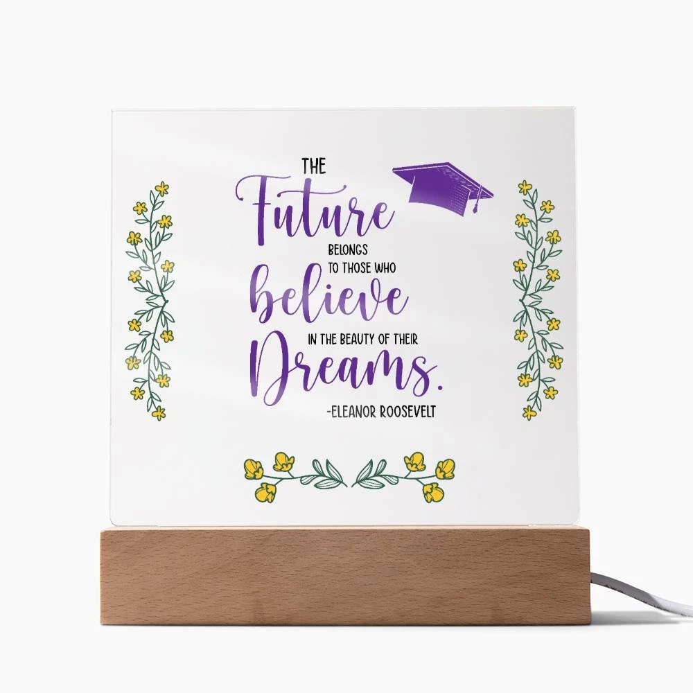 Celebrate your graduate's achievement with our unique Graduation Quote Plaque Gift. Perfect for graduation parties, this gift combines modern technology with a heartfelt message that will surely touch their hearts. Our Square Acrylic Plaque is made of premium crystal-clear acrylic, making it an eye-catching centerpiece for any room. With its sleek wooden base, this plaque is elevated to truly stand out and become a conversation starter. Upgrade to the LED wooden base for an even more memorable presentation. Made from high-quality acrylic, our plaque features a professionally printed design that will last for years to come. It's a truly unique and sentimental gift that your graduate will cherish. Product specifications: - Premium acrylic construction - Size with wooden base: 6.5" (165mm) height x 5.9" (150mm) width - Acrylic Depth: 0.1" (5mm) - Wooden base: 1.2" (30mm) height x 5.9" (150mm) width x 1.8" (45mm) depth - Optional wooden base with colorful built-in LED lights - Sharp, detailed printed design Each order is carefully packaged and ready to be treasured for a lifetime. Let your loved one know how much they mean to you by purchasing this meaningful gift today. Celebrate their hard work and dedication with our Graduation Quote Plaque Gift.