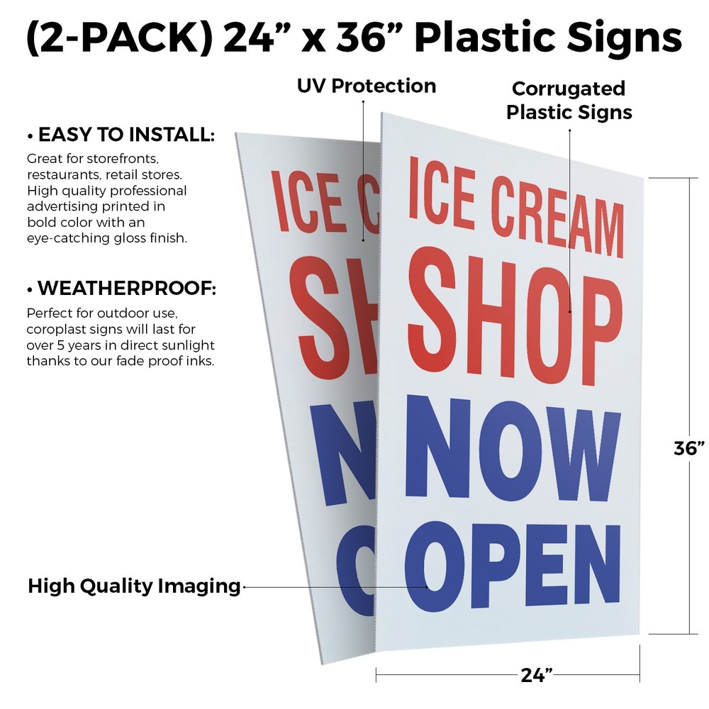 Ice Cream Shop Now Open (2-Pack) 24 Inch x 36 Inch Plastic Signs | Sign Insert 4mm Corrugated Plastic Signs Storefront Window Poster | Grand Opening, Refreshing Desserts, Local Favorites | Made in USA Universal 2 eBay Template by Finest Design Vinyl Banners Aluminum Signs Safety Signs Yard Signs Designer Aluminum Signs Novelty Signs Vinyl Banners Aluminum Signs Safety Signs Yard Signs Designer Aluminum Signs Novelty Signs Description Ice Cream Shop Now Open Heavy Duty A-Frame Sidewalk Sign Grand Opening Fresh SignMission Deluxe A-Frame Signs Heavy-Duty - Portable - Reusable - Weather Resistant A-Frames, also known as sandwich board signs, are an easy and affordable way to advertise your business or event. The durable thick plastic frame allows them to be placed both indoors and outdoors in any conditions except extreme weather. They are also extremely easy to set up, take down, and move from one location to another as needed. Our Signicade Deluxe A-Frame is available with two installation options: Decals Installed – The sign graphics are printed on high-quality vinyl decals that come pre-installed on the frame. Corrugated Plastic Signs Installed – Includes two 4mm corrugated plastic sign inserts that are attached using self-adhesive Velcro (included). Need to switch up your messaging? Extra sets of inserts are available in both decal and corrugated plastic options. Order multiple sets and change your message in just a few minutes! Simply search for SignMission 24” x 36” sign inserts to get additional replacements. Product Features & Specs (2) 4mm Corrugated Plastic Signs OR Pre-Installed Decals Self-Adhesive Velcro (For corrugated plastic option) White Heavy-Duty Frame 18 lbs. + 10 lbs. if Sand/Water Added 24” x 36” Removable Sign Graphics Indoor / Outdoor Use Double-Sided A-Frame Features Weatherproof: The combination of high-quality plastic and added weight from sand/water makes these signs perfect for outdoor use. Rain or shine, your A-Frame sign can endure it all. Maximum Visibility: Because every A-Frame is double-sided, you can make sure everyone sees your message. Portable: The collapsible A-Frame and convenient handle make it easy to move your sign from one location to another. Reusable: Store your signs and use them as you always have, swap inserts to change your messaging, and use your A-frame signs for years to come. Weight: 18 lbs. (Weight does not reflect when the frame is filled with water or sand, which can add 10 additional lbs. when full.) Details: Durable heavy-duty plastic frame with a regressed double-sided sign area (24”x36”). Foldable with a molded handle for easy grip and carrying. Fillable frame for greater stability. Swappable corrugated plastic graphics or pre-installed decals. Portable. Uses: Indoor/Outdoor. Trade shows. Sidewalk advertising. Daily specials and menus for restaurants. Point-of-purchase displays. Event and foot traffic. Directional signage. Estimated Lifespan: 5+ years with proper placement and care. Size: 45"H x 25"W x 3"D - Frame; 24" x 36" Graphic Area.