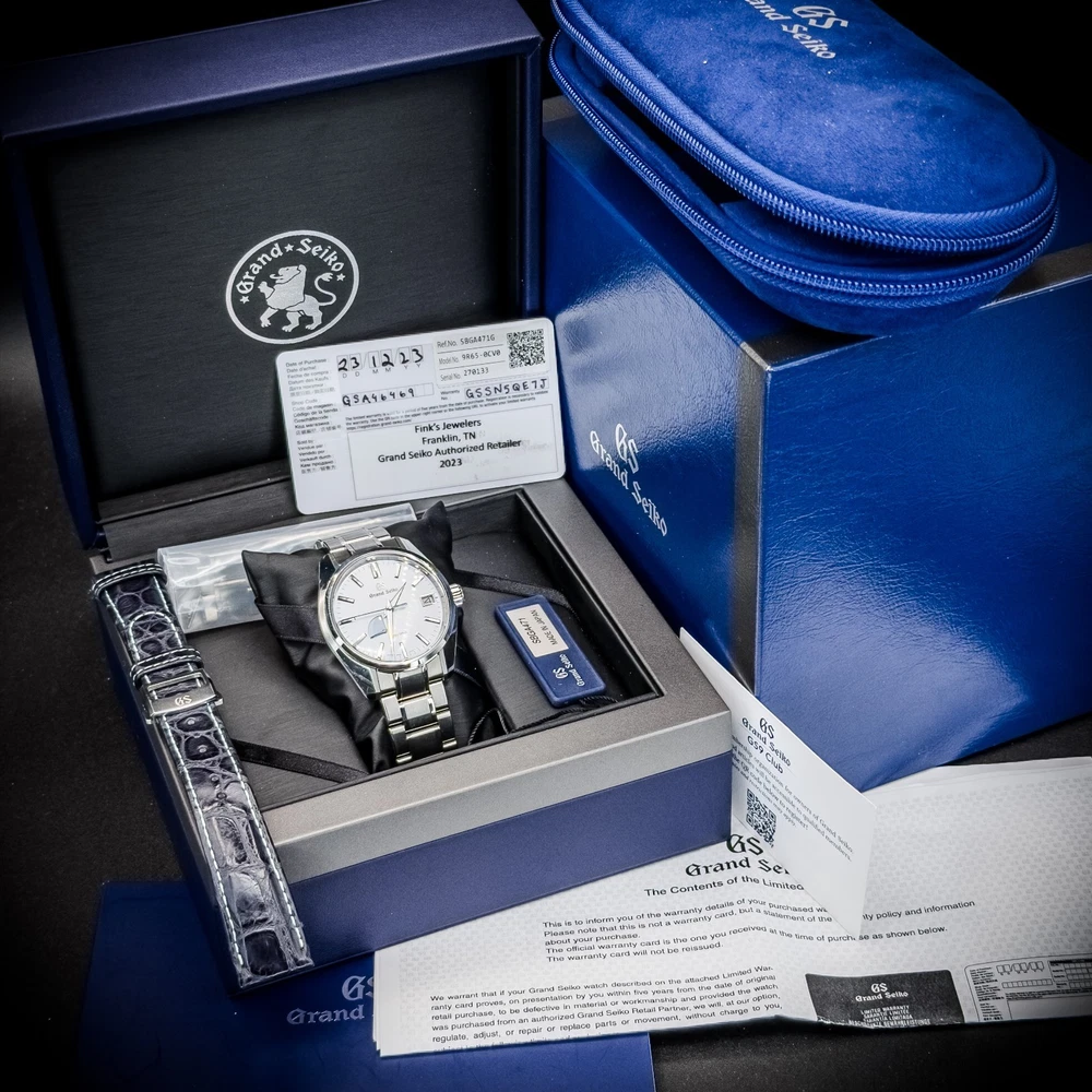 Grand Seiko “Soko Frost” US Exclusive SBGA471G Full AD Set Dec 2023 Excellent Condition Unpolished Under Warranty through 2028 1 Owner. 40.2mm Titanium Case | Spring Drive Caliber 9R65 | 72-Hour Power Reserve | Textured “Skyflake” Blue Dial | Sapphire Crystal | 100m Water Resistance | Titanium Bracelet + Blue Alligator Strap Description Exclusively released for the US market, the SBGA471G “Skyflake” brings Grand Seiko’s artistry to a light blue dial inspired by winter skies. Housed in a 40.2mm high-intensity titanium case and powered by the ultra-smooth Spring Drive 9R65, this reference blends precision, elegance, and lightness in one unmistakable design. This single-owner 2023 example comes unpolished, in Excellent condition, and includes a complete set from the AD including both the original bracelet with all links and factory blue alligator strap with deployant clasp. Condition Excellent Pre-Owned – Light wear from careful use, minor surface marks. Unpolished with sharp lines. Running smoothly with accurate Spring Drive glide. 5Y transferable warranty from date of purchase. One Owner. Complete Set Includes Grand Seiko Inner and Outer Boxes Warranty Card (5Y Transferrable Warranty from Date of Purchase, Dec 23, 2023) Operating lnstructions & Booklet Bracelet with All Links Blue Alligator Strap with Deployant Clasp Blue Factory Travel Case Shipping Ships from Scottsdale, AZ – Priority Overnight via FedEx Hundreds of Deals, References, Reviews, etc. Buy with confidence.