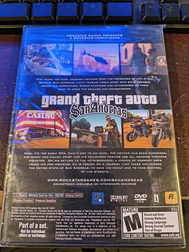 This product is a sealed PlayStation 2 copy of "Grand Theft Auto: San Andreas" from 2004. Published by Rockstar Games, this action and adventure game is part of the Grand Theft Auto series. The game includes elements of boxing, extreme sports, and car racing, making it a diverse and engaging experience for players. With a mature rating, this complete edition includes the manual and is sure to provide hours of entertainment for fans of the genre.