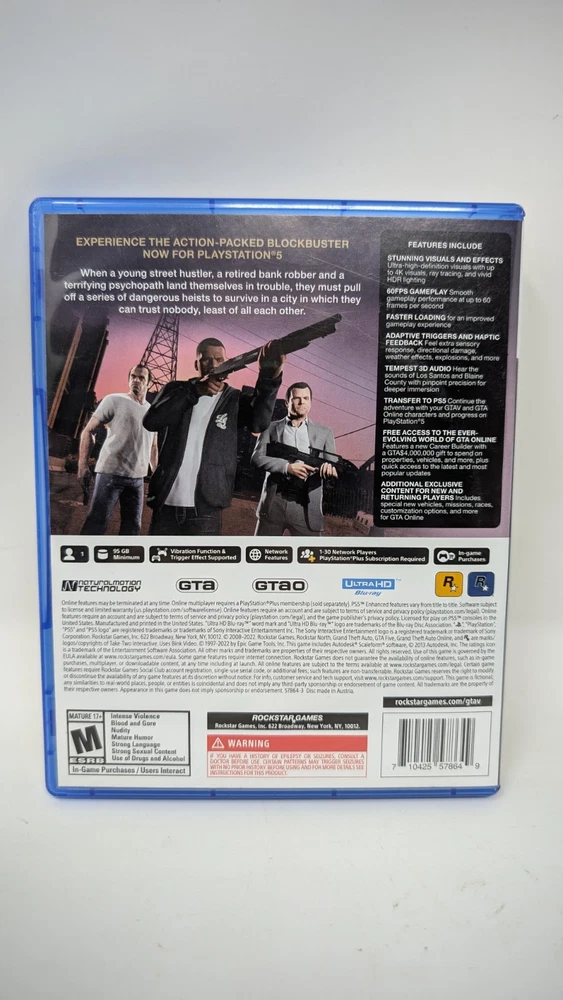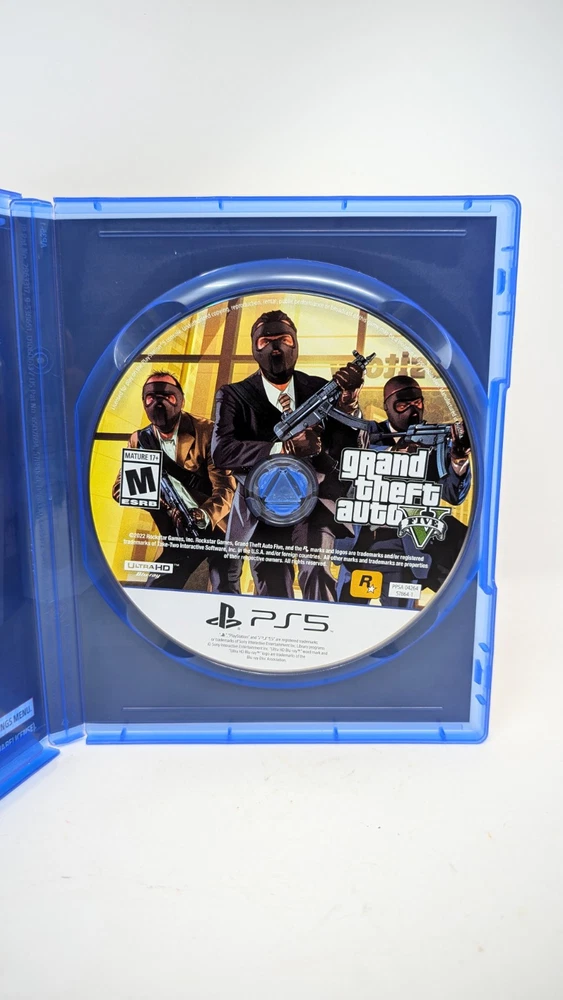 These are only listed in good condition because they all have some sort of sticker residue on them (as can be seen in the photos). However, the discs are all in very good to like new condition with very little or no signs of use. Any downloadable codes are assumed to have already been used, but I technically don't know for sure. Embark on an epic journey through the sun-soaked streets of Los Santos with Grand Theft Auto V for the Sony PlayStation 5. The Standard Edition invites players to experience a vast and vibrant world filled with heists, car racing, and boxing. Navigate the complex criminal underworld in this action-adventure game that's packed with shooting and crime-solving challenges. With its immersive gameplay and stunning visuals, GTA V is a must-have for fans and newcomers alike. Enjoy the freedom to explore the open world at your own pace, or dive into the intense action of the game's myriad missions. Whether you're completing daring heists or simply enjoying the rich narrative, the game's features like multiplayer and online playability ensure that the fun never stops.