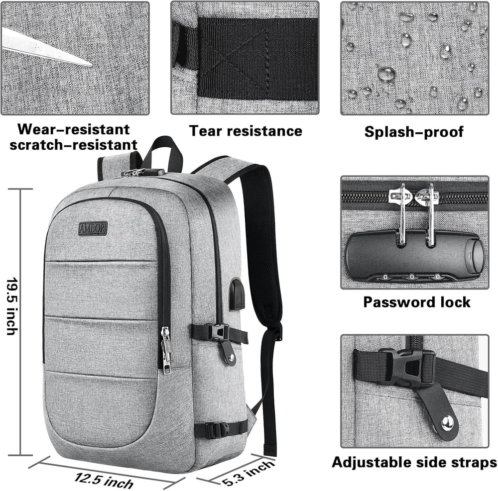 Travel Laptop Backpack, 15.6-17.3 inch Anti Theft Business Laptop Backpack with USB Charging Port and Headphone Interface, Backpack for Men & Women, Grey Dimensions: This backpack fits up to 17.3" laptop. Exterior dimensions (L*W*H):19.5x 12.5 x 5.3 inch. Simple and practical, lightweight and comfortable, very suitable for travel, and it also work well as business or work backpack, computer bag, hiking bag, daily bag Anti-theft Design: This backpack apply anti-theft design techology. Includes a theft proof combination lock durable metal zippers, no thief can open your backpack easily. Provide security for your journey External USB Charger Port & Headphone Jack: USB charging backpack with charging cable is convenient to charge smart phone, tablet, other devices. Headphone Jack: you can listen to your favorite music when you are carring the backpack on road. Note: Not Include Power Bank Comfortable Back Support System: Ergonomic design of S-shape padded shoulder straps and padding back design, made from high elastic and breathable sponge and fabric, equipment with adjustable chest buckle and ring type adjustable hasp, adjust the strap length freely, reduce the burden of weight, protect the back and shoulder effectively, more comfortable for your life
