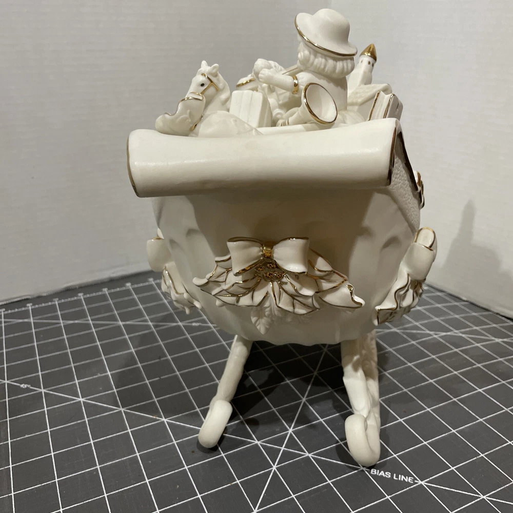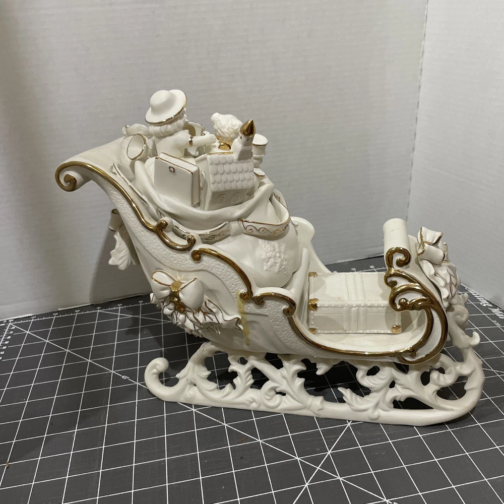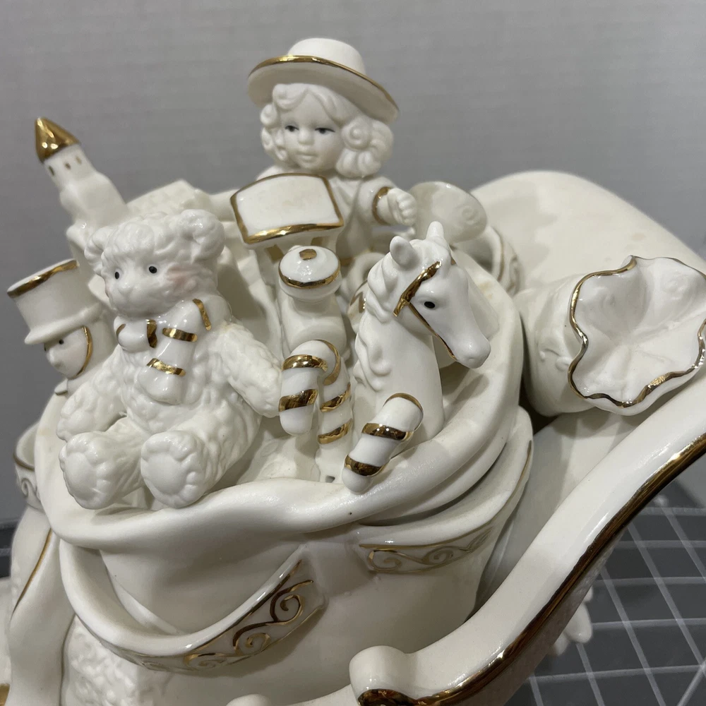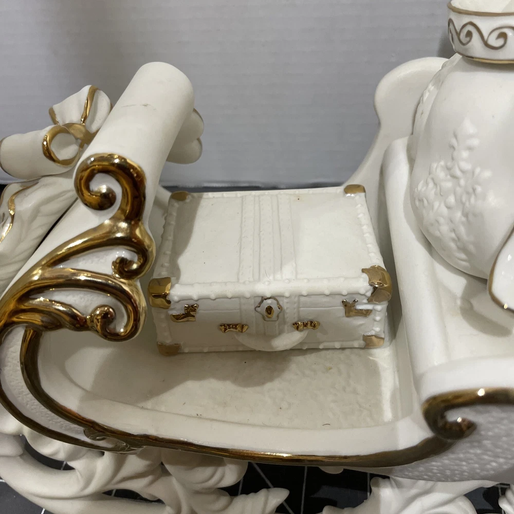 Add a touch of holiday magic to your home with this beautiful Grandeur Noel porcelain sleigh. This 2001 collectors edition set features a stunning white sleigh with gold accents and is perfect for any room in your home. Whether you're looking to decorate your living room or add a special touch to your children's bedroom, this set is sure to This traditional style is an original piece from the 21st century and is manufactured in China. Bring the joy of the holiday season into your home with this gorgeous Grandeur Noel porcelain sleigh.