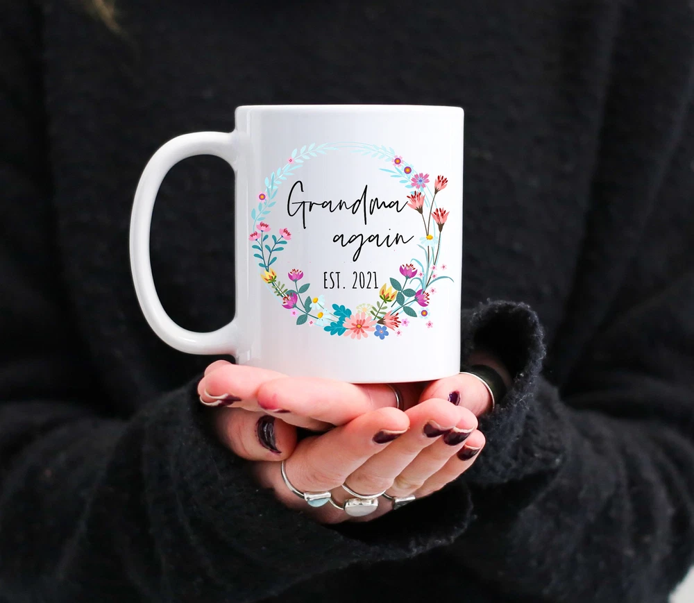 Grandma Again Est 2021 Mug Grandma Gifts Personalized Grandma Mug Second Baby Product Details.. This high quality 11oz. ceramic white mug has a premium hard coat that provides crisp and vibrant color reproduction sure to last for years. Perfect for all hot & cold beverages. The highest quality printing possible is used. It will never fade no matter how many times you wash it. Material: 100% Ceramic. Print both sides. Dishwasher and Microwave Safe. High Gloss + Premium White Finish. Printed in the U.S.A. Personalized & Custom. We support personalized and custom mug to add custom, when placing an order, you can add notes to the "order note" in shipping address section. Also you can contact us directly via message. Shipping Info. Ready to ship in 1 to 2 business days, All products are made-to-order and proudly printed in the United States. Shipped by USPS and DHL, You will receive your order in 5-7 days. Replace & Refund. All products are defective during shipping broken, chipped will be replaced free of charge. You are not satisfied with the product, we will refund 100% money to you. If any other issues arise, please do not hesitate to message, we would be more than happy to assist you.