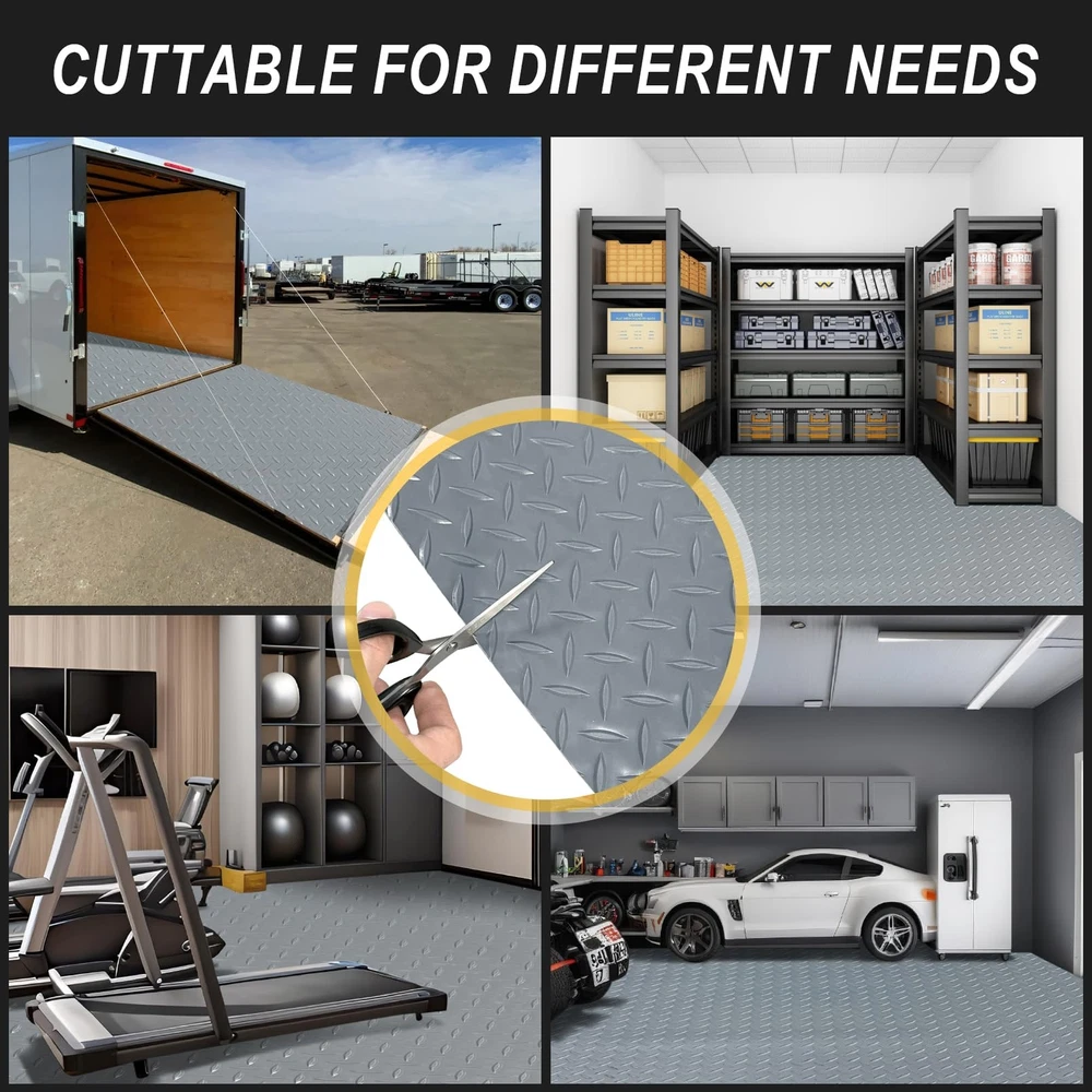 Premium PVC Rubber Material: Our Garage Floor Mat crafted from high-quality PVC rubber, ensuring durability and resistance to wear. The material is not only non-slip but also provides excellent protection against daily wear and tear.Low temperature will affect the paving of the floor mat, recommended for indoor use.Tips:If there is a slight bulge, it is recommended to place at room temperature for a few days. Anti-Slip Design: The under car mat engineered with a diamond plate texture for superior slip resistance, ensuring safety for both foot traffic and parked vehicles even in damp conditions.In order to make the mat does not slip, you can use double-sided tape on all sides(not included in the package) Generous Dimensions: Boasting a spacious 4x6ft coverage, totaling 24 square feet, this floor mat is designed to accommodate a variety of garage spaces. The ample size eliminates concerns about mismatched dimensions during installation. Thickness for Heavy-Duty Use: The floor mat is thickened to 2.8mm, providing robust stability and durability. Ideal for heavy-duty applications, it safeguards your floors and offers a comfortable walking surface. Versatile Application: Perfect for a range of spaces, including garages, gyms, warehouses, basements, and trailers. Its heavy-duty construction makes it suitable for diverse environments.