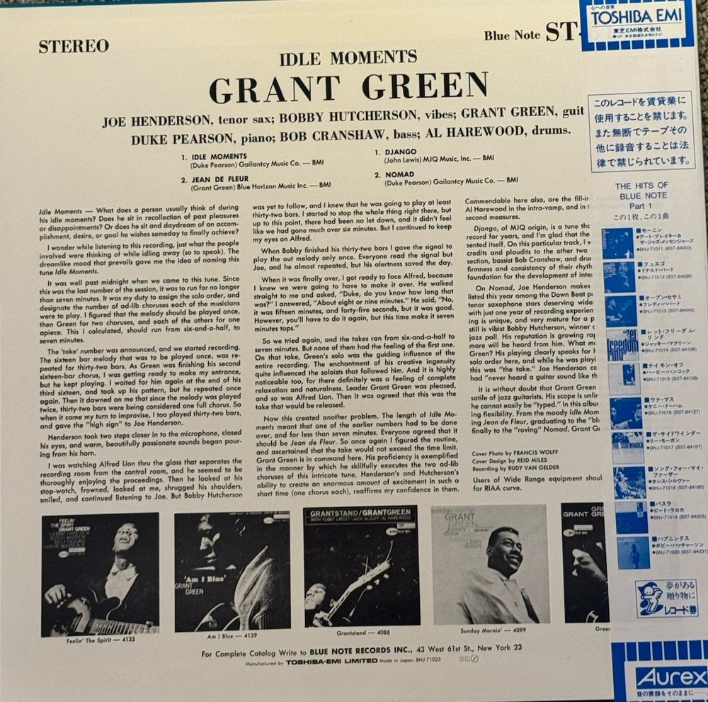 Excellent condition vinyl Grant Green - Idle Moments Sleeve - NM Media VG+ (conservative grade, closer to near mint)