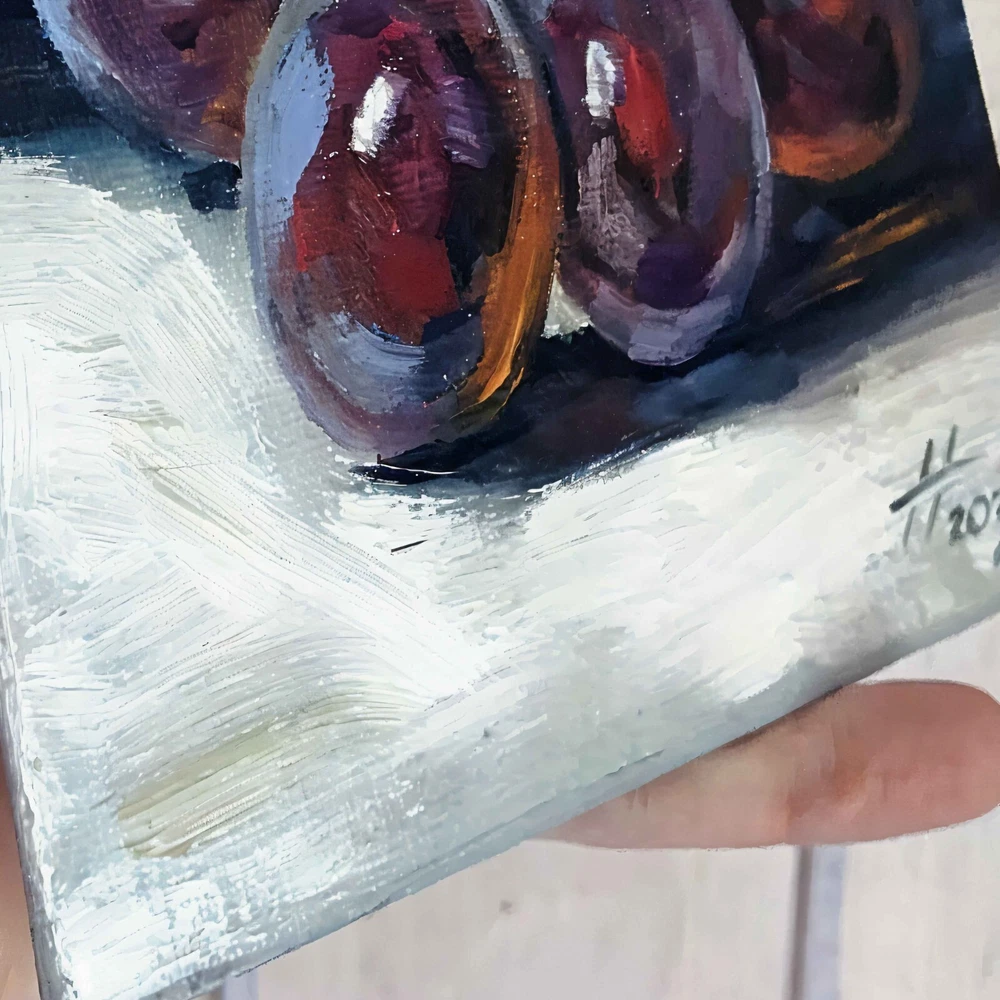 Oil painting «Plums», size approximately 6.00 x 6.00 inch. See more in my store: This painting features a fruity still life with ripe blue plums, created with oil paints on canvas stretched on cardboard. The rich plum purple tones stand out, making it a great addition to your interior. This oil painting combines the charm of classical paintings with a modern still life touch, making it a classy wall art piece. Whether you appreciate a traditional oil still life or a modern fruit painting, this violet color art will fit right in. Perfect as a square painting, it brings a touch of elegance to any space. This still life painting is a timeless still life artwork. ♥ Click here to view all of my original art. - https://www.ebay.com/str/artnekrasovaolga —————————— ONE OF A KIND - READY TO SHIP Title: «Plums» Medium: Сanvas Stretched On Cardboard , Oil Paints , Brushes, Palette Knife, Light Texture. Size: 5.90 W x 5.90 H inch (15.00 W x 15.00 H cm) 100% HAND PAINTED: Original painting from my art studio. A frame is required (supplied without frame) —————————— FREE SHIPPING * will be carefully packaged and shipped with tracking number. * INTERNATIONAL friends, If you are interested in this painting, please me for info. —————————— Pay attention, actual colors may vary due to differences in monitors. Consider a unique art painting as an exceptional gift for your mother, sister, father, or significant other. It serves as a wonderful housewarming gift for couples and an excellent choice for a colorful room decor or wall decor in your home gallery. Indulge in the beauty of original artwork, and let it transform your living space in a remarkable way. If you have any questions please feel free to email me anytime… © ArtNekrasovaOlga All Rights Reserved ♥ Thank you for stopping by and viewing my art! ♥ Nekrasova Olga