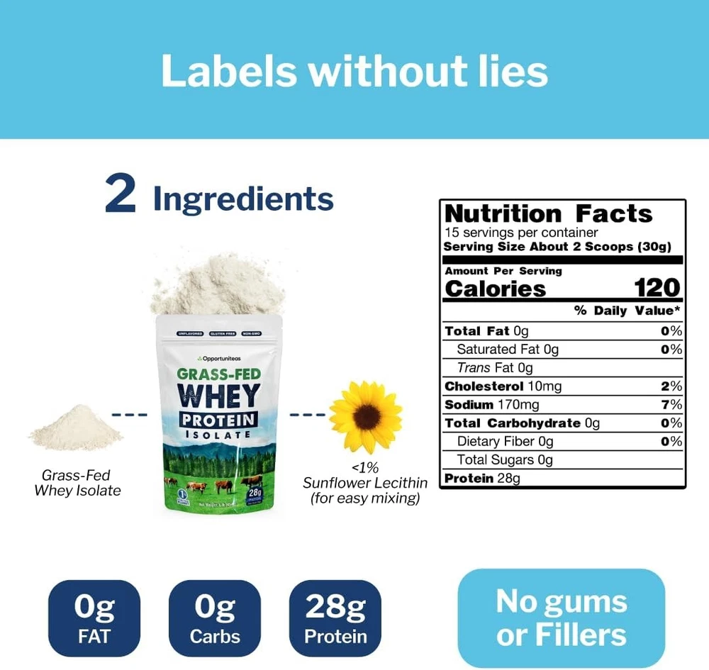 Opportuniteas Grass Fed Whey Isolate Protein Powder - 1 Pound (Pack of 1) Description Features: MADE FROM HAPPY GRASS-FED, HORMONE-FREE COWS - Whey protein derived from conventional dairy farming may contain harmful substances since the cows can be subject to hormonal and antibiotic use, which may be stored in the human body and can affect the overall nutritional composition of the whey. Our whey comes from completely hormone-free cows, who get to freely graze on pasture at least 350 days a year, producing high-quality, more nutrient-dense whey isolate protein. LOW-LACTOSE, UN-DENATURED, WITHOUT SUGAR OR PRESERVATIVES - Our unflavored 100% grass fed whey protein isolate powder is low lactose, un-denatured (pure, with properly functioning proteins without any structural deformation, intact with all bioavailable nutrients and constituents), it does not have any added sugar, sweeteners, preservatives, colors, or flavorings. Low-temperature drying techniques give it a better taste and texture compared to ordinary whey protein. NO UPSET STOMACH – Simple ingredients means no upset stomach! Our ingredient list is 99% pure isolate protein powder and less than 1% non-GMO sunflower lecithin for easy mixing. You're getting the essential nutrients your body needs to thrive without any artificial fillers or flavors to get in the way. 28 GRAMS OF DELICIOUS ISOLATE WHEY PROTEIN - Opportuniteas offers the highest protein concentrations ensuring you get the protein your muscles need. Isolate Whey is processed to reduce its fat and lactose content, leaving mainly protein. If you are striving to build lean muscle, recover faster, or simply live a healthier lifestyle, this is for you. Don't worry about clumps; mix it in hot or cold drinks, or add it to your cooking or baking recipes. Enjoy it and elevate your well-being. MADE THE RIGHT WAY - At Opportuniteas we make effective, transparent, and affordable products you can confidently recommend to your family. We are committed to making a positive impact on people and our planet. As a proud member of the 1% for the Planet network we donate 1% of our profits to help solve our planet’s most pressing issues. If you don't love our product, we offer a no-questions-asked full refund. Product Details: Is Discontinued By Manufacturer : No Product Dimensions : 7 x 2.5 x 11 inches; 1 Pounds Manufacturer : Opportuniteas Brand: Opportuniteas Flavor: Unflavored Servings per Container: 15 Item Weight: 1 Pounds Material Type Free: Grain Free Handling We will ship all orders within 1 business day of payment. Delivery We Do Not Ship Outside of the Continental US. Return Policy All items qualify for returns within 30 days of receipt. Buyer is responsible for return shipping on any item that is not damaged. Feedback We take our reputation seriously, we buy and sell online, so we understand the value of trust. If you are unsatisfied with your order, please contact us and we will work with you to resolve it to your satisfaction.