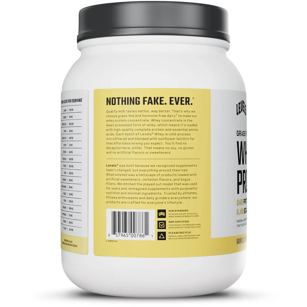 Real ingredients just taste better. That’s why we only use a blend of vanilla extract, natural sweeteners and hormone-free* whey. You’ll find no deception here either. That means no added sugars, no soy, no gluten, no artificial ingredients, and no bogus fillers. Made with minimal ingredients that don’t sacrifice on flavor. Whey concentrate is the least processed form of whey, which means it’s loaded with high-quality complete protein and essential amino acids. The branched-chain amino acids (BCAAs) found in whey protein can help build lean muscle and support post-workout recovery.‡ LEVELS WHEY PROTEIN: Each scoop of Levels Vanilla Bean Whey contains 24g Protein, 5.4g BCAAs (branched-chain amino acids), and no added sugars. Trusted by athletes, fitness enthusiasts and daily grinders everywhere, our whey is crafted for everyone’s lifestyle. NOTHING FAKE: Levels Whey is naturally delicious. That means no hormones, no GMOs, no added sugars, no soy, no gluten, no bleach, no fillers, and no artificial flavors or sweeteners. SIMPLE & CLEAN: No fake vanilla flavor here. Levels Vanilla Bean Whey is made with delicious Madagascar Vanilla Extract and lightly sweetened with monk fruit extract. QUALITY FIRST: Quality milk tastes better, way better. That’s why grass-fed hormone-free dairy is the only dairy we use to make our whey protein concentrate. Whey concentrate is the least processed form of whey, which means it’s loaded with high-quality complete protein and essential amino acids. Levels Whey Protein is undenatured to protect bioactivity and naturally occurring growth factors. Each batch is cold-process microfiltered and blended with non-gmo sunflower lecithin for that insanely easy mixing you expect. Ingredients Whey Protein Concentrate, Vanilla Extract, Sunflower Lecithin, Sea Salt, Stevia Leaf Extract, Monk Fruit Extract./div>