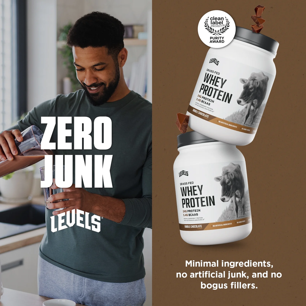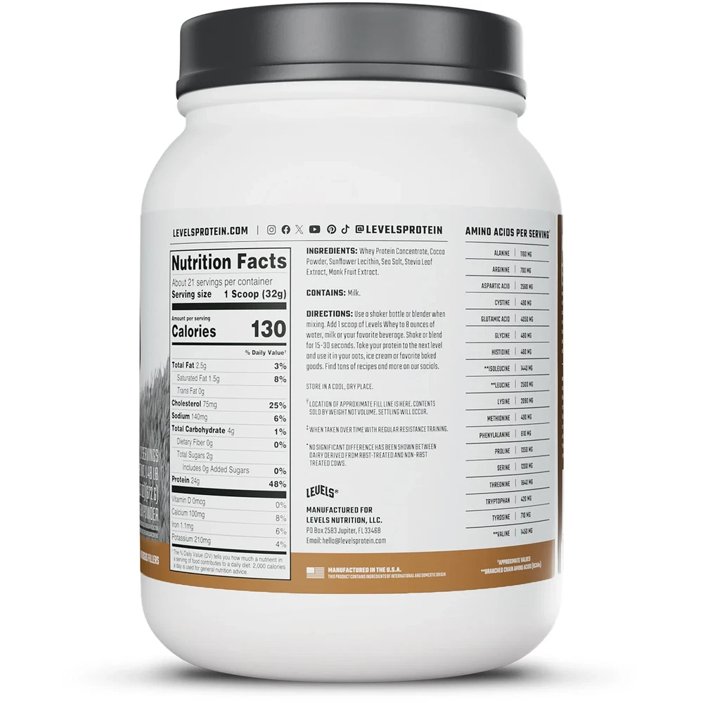 Real ingredients just taste better. That’s why we only use a blend of rich cocoa, natural sweeteners and hormone-free* whey. You’ll find no deception here either. That means no added sugars, no soy, no gluten, no artificial ingredients, and no bogus fillers. Made with minimal ingredients that don’t sacrifice on flavor. Whey concentrate is the least processed form of whey, which means it’s loaded with high-quality complete protein and essential amino acids. The branched-chain amino acids (BCAAs) found in whey protein can help build lean muscle and support post-workout recovery.‡ LEVELS WHEY PROTEIN: Each scoop of Levels Double Chocolate Whey contains 24g Protein, 5.4g BCAAs (branched-chain amino acids), and no added sugars. Trusted by athletes, fitness enthusiasts and daily grinders everywhere, our whey is crafted for everyone’s lifestyle. NOTHING FAKE: Levels Whey is naturally delicious. That means no hormones, no GMOs, no added sugars, no soy, no gluten, no fillers, and no artificial flavors or sweeteners. SIMPLE & CLEAN: No fake chocolate flavor here. Levels Double Chocolate Whey is made with deliciously rich cocoa and lightly sweetened with monk fruit extract. QUALITY FIRST: Quality milk tastes better, way better. That’s why we choose grass-fed and hormone-free dairy to make our whey protein concentrate. Whey concentrate is the least processed form of whey, which means it’s loaded with high-quality complete protein and essential amino acids. Each batch is cold-process microfiltered and blended with non-GMO sunflower lecithin for that insanely easy mixing you expect. Ingredients Whey Protein Concentrate, Cocoa Powder, Sunflower Lecithin, Sea Salt, Stevia Leaf Extract, Monk Fruit Extract./div>