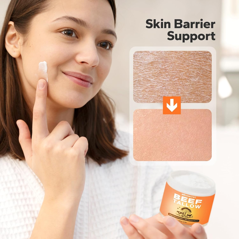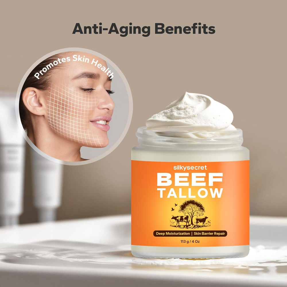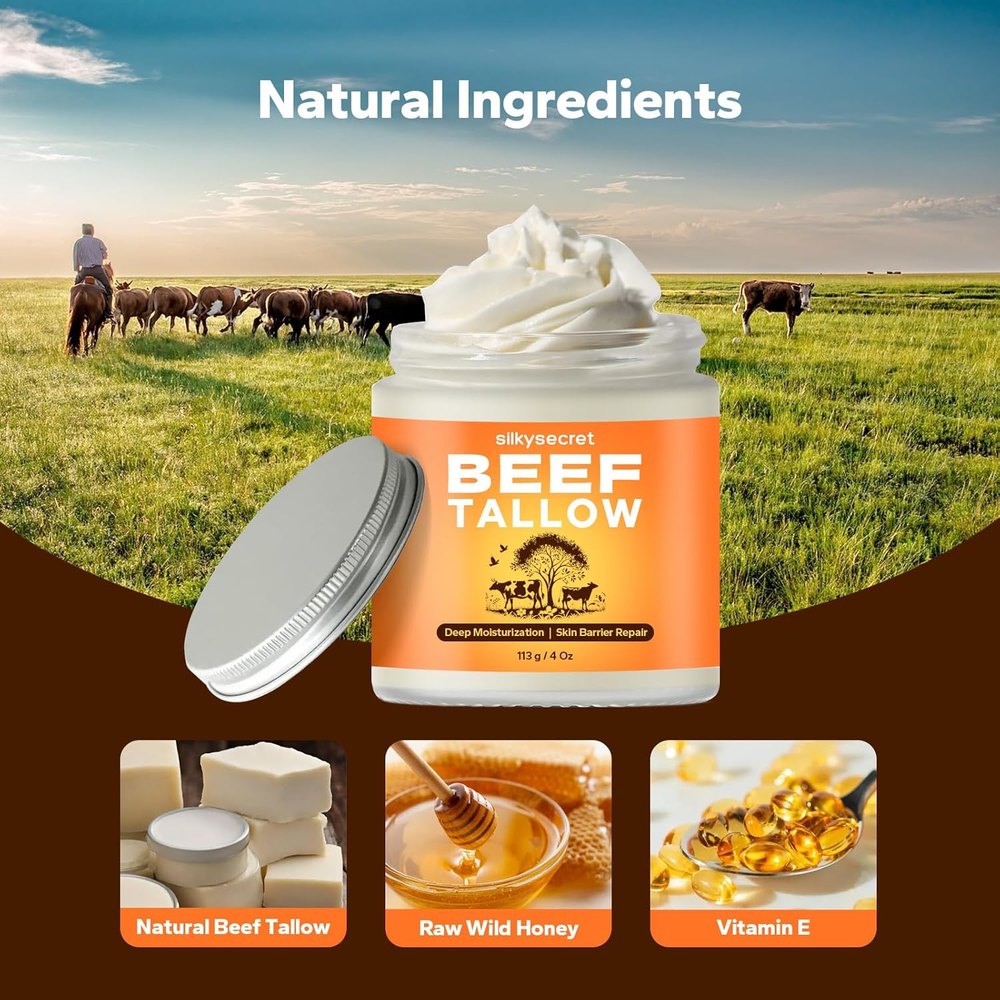 Beef Tallow for Face & Body (4 Oz), Grass-Fed Beef Tallow & Raw Wild Honey Blend Deep Moisturization: SilkySecret Beef Tallow Moisturizer deeply nourishes and hydrates the skin, providing long-lasting moisture. Rich in natural fatty acids and vitamins, it effectively locks in moisture, making it ideal for dry and sensitive skin. Skin Barrier Support: This tallow and honey balm helps repair and restore the skin's natural barrier, enhancing its protective capabilities and reducing sensitivity to environmental irritants. Natural Ingredients: Made with natural beef tallow and honey, SilkySecret Moisturizer is free from artificial additives and harmful chemicals. It’s gentle and safe for all skin types, including sensitive skin. Versatile Use: This moisturizer is not only perfect for the face but can also be applied to the entire body, including elbows, knees, and heels, to relieve dryness and roughness, leaving the skin soft and smooth. Anti-Aging Benefits: Rich in Vitamin E and antioxidants, this beef tallow moisturizer helps reduce the appearance of fine lines and wrinkles, promoting skin regeneration and maintaining youthful vibrancy. 2.76 inches x 3.03 inches x 2.68 inches. Weight: 9.14 oz Item Volume 0.07 Kilograms Active Ingredients Beef Tallow, Honey, Vitamin E Age Range (Description) Adult Special Feature Antibacterial Package Dimensions 3.03 x 2.76 x 2.68 inches; 9.14 ounces