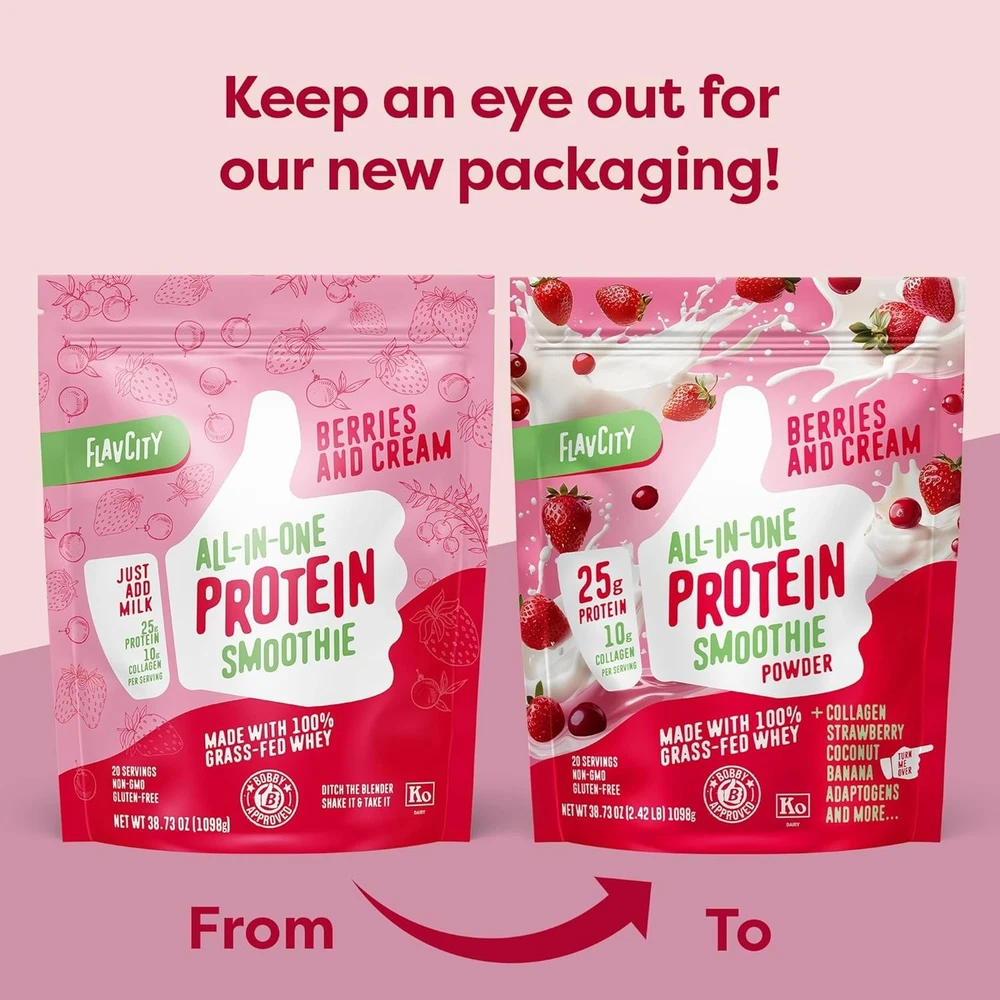 FlavCity Protein Powder Smoothie, Berries & Cream - 100% Grass-Fed Whey with Collagen (25g of Protein) - Gluten Free & No Added Sugars (38.73 oz) Flavor Berries and Cream Item Weight 38.73 Ounces Protein Source Whey Unit Count 38.73 Ounce About this item Ditch the Blender - FlavCity's creamy protein powder simplifies the smoothie-making process. Each scoop combines high-quality ingredients with a nutrient-dense powder blend of organic strawberries and cranberries, so you can simply scoop, shake and sip — no blending or extra add-ins required. 25g Protein & 10g Collagen - This grass fed whey protein powder combines non-GMO, minimally processed collagen, amino acids and undenatured whey protein. Meanwhile, organic Reishi and Cordyceps mushrooms help promote healthy focus and cognition. Functional Nutrition for Busy Lifestyles - We designed this whey protein powder for men and women who want to streamline post-workout recovery, meal prep and on-the-go fueling. This all-in-one formula is ideal for athletes, professionals and those who want to support their nutritional goals with whole-food ingredients. Just One Scoop - Add one scoop of this grass fed protein powder to 12 oz of your preferred milk, shake for 20 seconds and enjoy. Our formulas undergo stringent quality control and include thoroughly researched ingredients, so if it's "Bobby Approved" you know you're in good hands. I'd Scoop That - Since 2012, Bobby Parrish has helped people understand exactly what they're putting in their bodies so they can thrive. Now, with a following of more than 12 million community members, he's dedicated to creating protein smoothies derived from delicious whole foods and designed to help enhance your health journey. Product details Product Dimensions : 3 x 9.5 x 12.5 inches; 2.42 Pounds Date First Available : May 10, 2023 Manufacturer : FlavCity Country of Origin : USA Important information Ingredients Whey Protein Concentrate, Organic Banana Powder, Collagen, Organic Strawberry Powder, Organic Coconut Milk Powder, Unrefined Sea Salt, Organic Cordyceps Powder, Organic Reishi Powder, Organic Stevia Leaf Extract, Organic Monk Fruit Extract Legal Disclaimer Statements regarding dietary supplements have not been evaluated by the FDA and are not intended to diagnose, treat, cure, or prevent any disease or health condition. Product Description