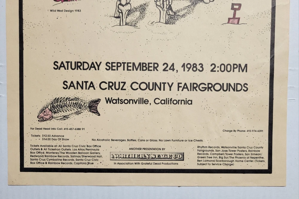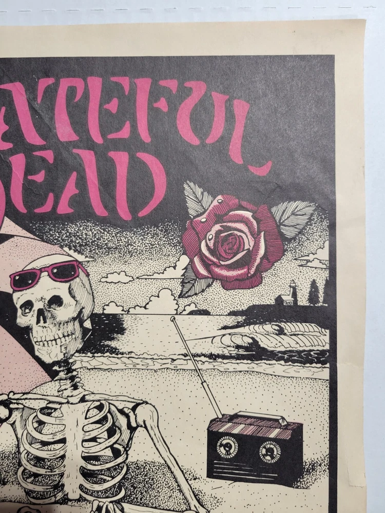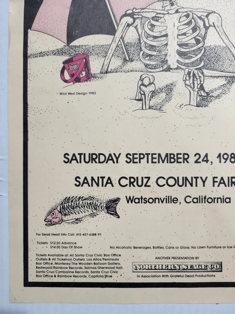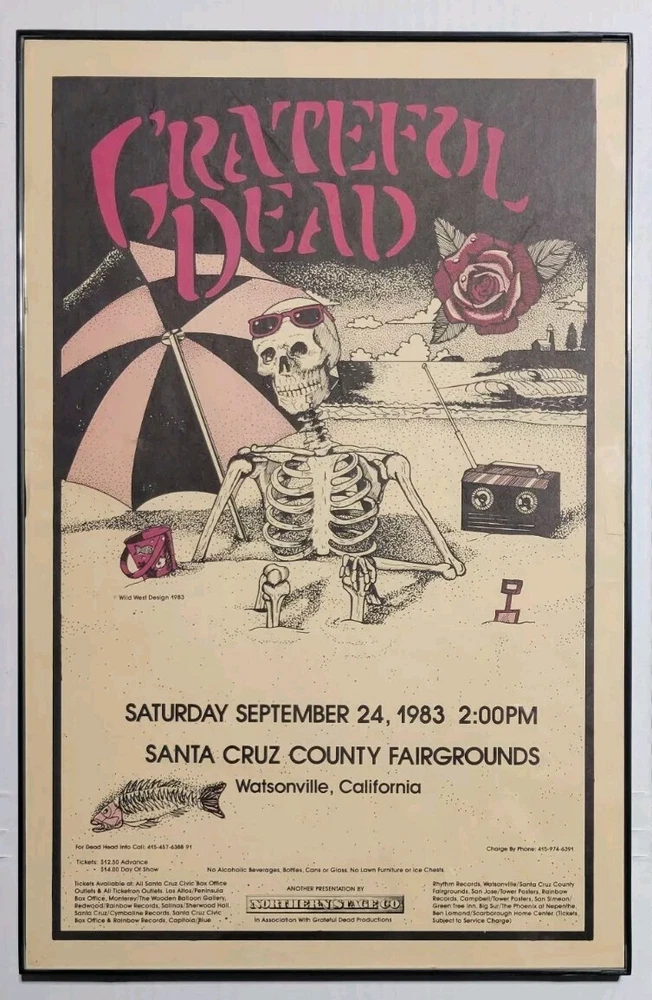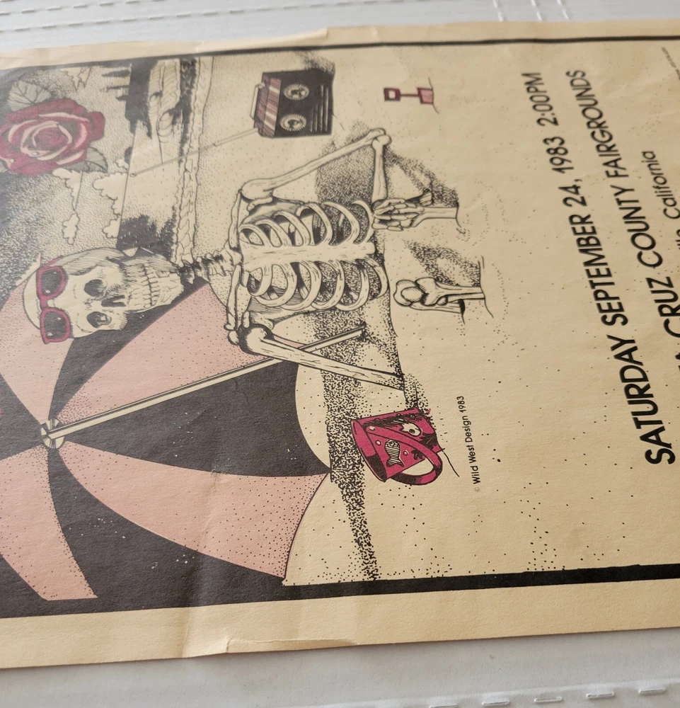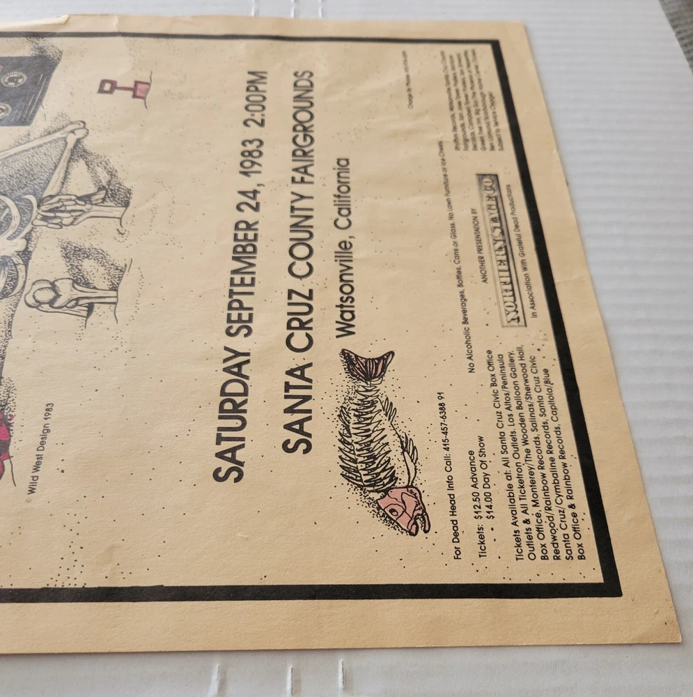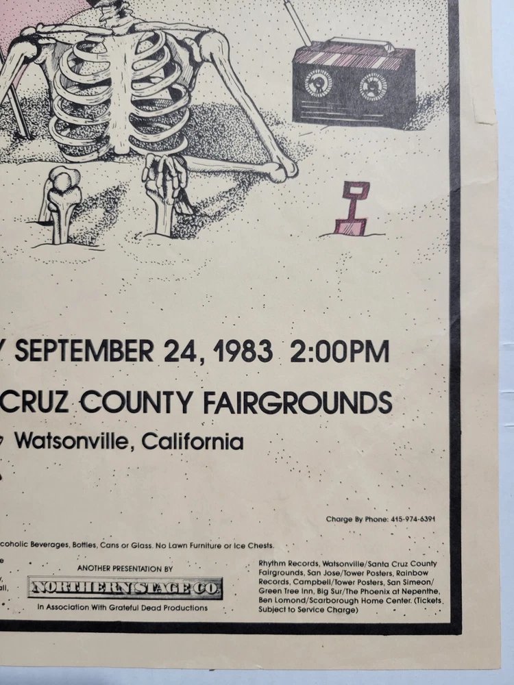 Please read the entire listing prior to bidding. Offered for sale is a very rare concert poster for the Grateful Dead's show on September 24th, 1983, at the Santa Cruz County Fairgrounds. The poster measures approx. 17" long and 11" wide. The poster does exhibit some wear and tear. It has some wrinkles/light creases on the top left, top right, center edges and lower right corner areas. On the center right edge, there's 2 tears approximately .5" in length. On the left center edge area, there's a few small tears that are .25" or smaller. The upper right edge has some light wrinkles. I would grade this poster Very Good. While not perfect, its impossible to find these in any condition, so consider yourself lucky to find or own one. The wrinkles may be able to be pressed out, I'm not an expert on that process, however. The graphics are nice and bright. The poster is in a frame. It is not framed and matted, but it is in a less expensive frame. I can ship without the frame, rolled up in a mail tube if you'd like, just let me know. The last poster like this sold earlier this year at auction for over $1500.00! Please examine the photos of the exact item you'll receive. U.S. shipping will be $39.00. It will be shipped inside its frame, UNLESS you request for it to be shipped without a frame and rolled up and placed in a tube mailer. Thanks for looking. All sales are final. No returns, refunds, or exchanges. By bidding, you agree that you have read and understand the terms stated in this listing.