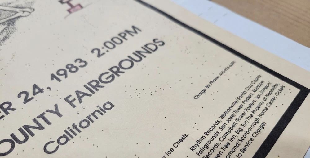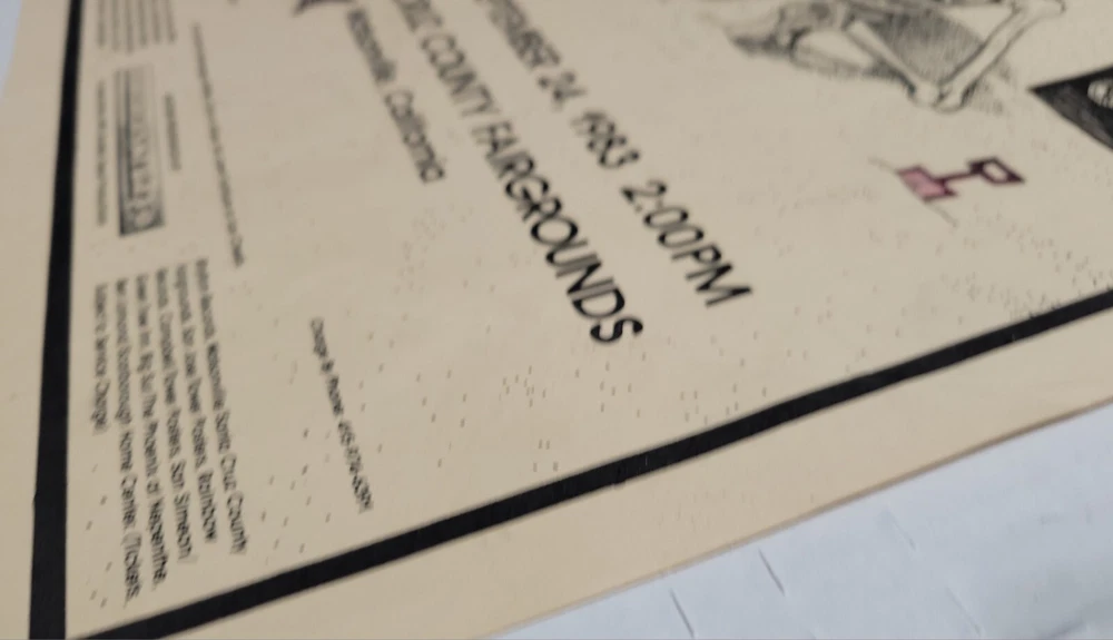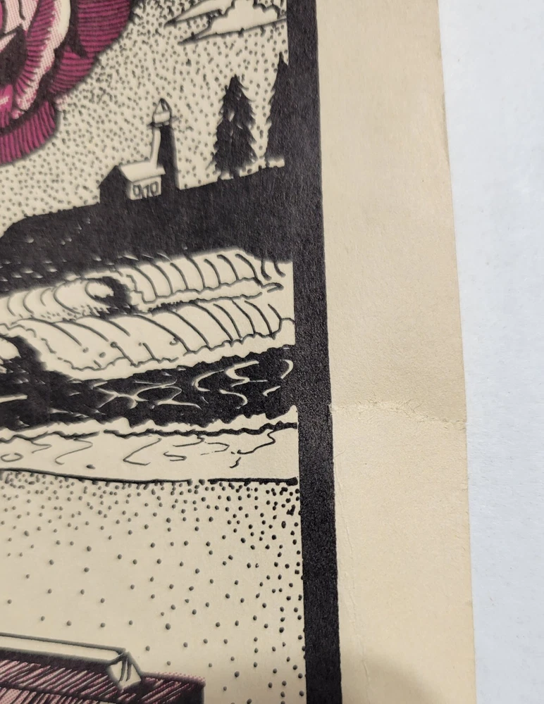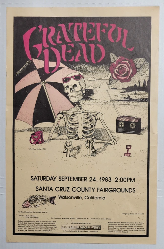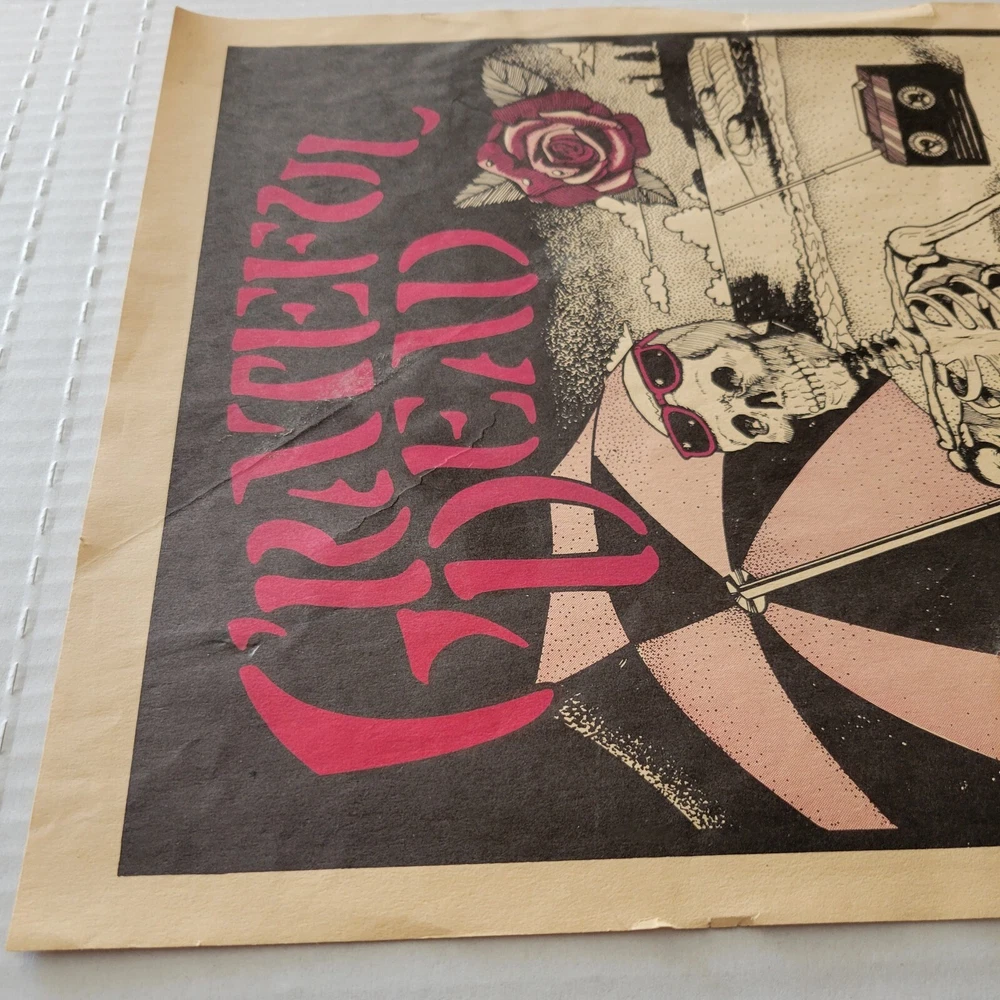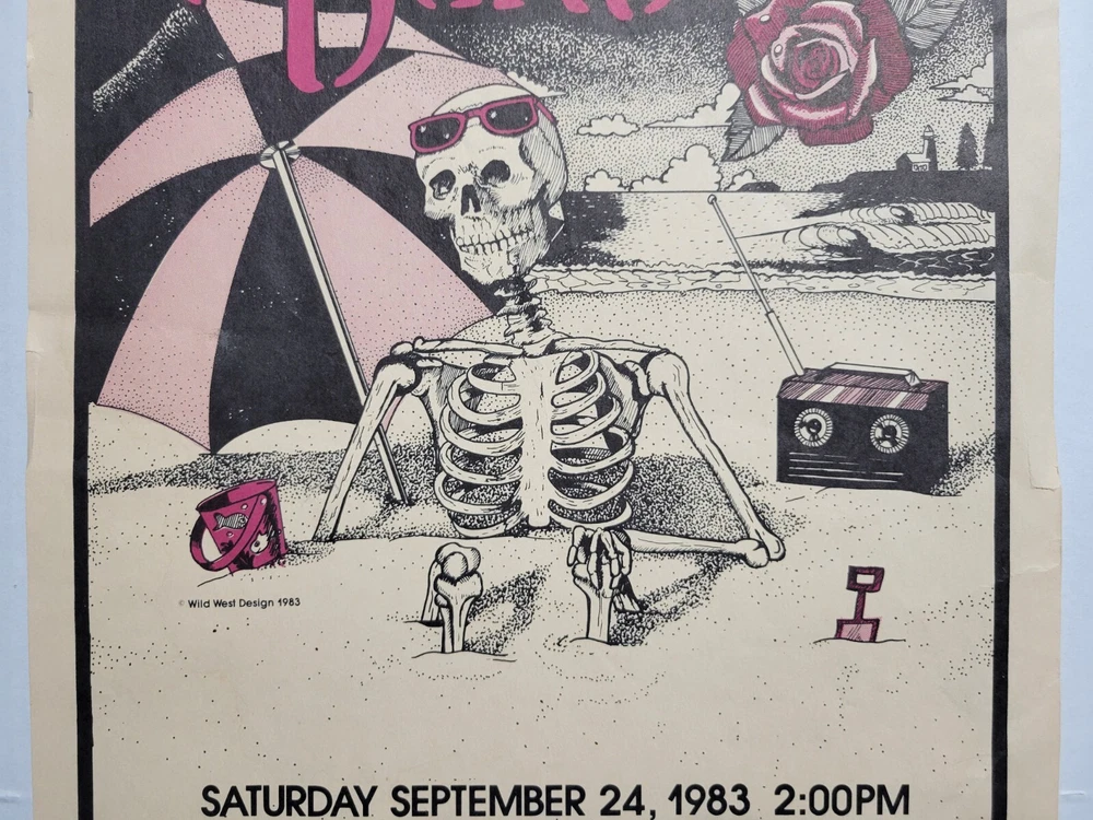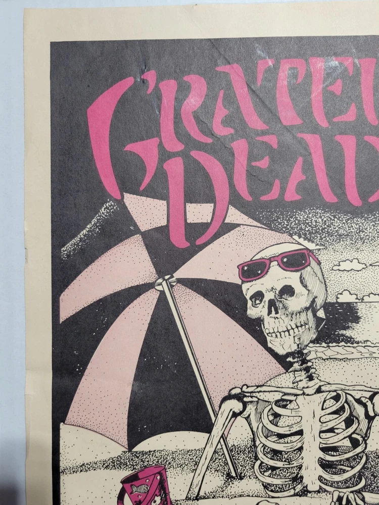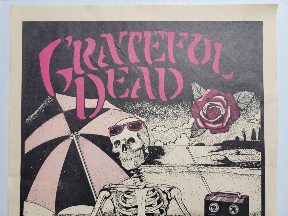 Please read the entire listing prior to bidding. Offered for sale is a very rare concert poster for the Grateful Dead's show on September 24th, 1983, at the Santa Cruz County Fairgrounds. The poster measures approx. 17" long and 11" wide. The poster does exhibit some wear and tear. It has some wrinkles/light creases on the top left, top right, center edges and lower right corner areas. On the center right edge, there's 2 tears approximately .5" in length. On the left center edge area, there's a few small tears that are .25" or smaller. The upper right edge has some light wrinkles. I would grade this poster Very Good. While not perfect, its impossible to find these in any condition, so consider yourself lucky to find or own one. The wrinkles may be able to be pressed out, I'm not an expert on that process, however. The graphics are nice and bright. The poster is in a frame. It is not framed and matted, but it is in a less expensive frame. I can ship without the frame, rolled up in a mail tube if you'd like, just let me know. The last poster like this sold earlier this year at auction for over $1500.00! Please examine the photos of the exact item you'll receive. U.S. shipping will be $39.00. It will be shipped inside its frame, UNLESS you request for it to be shipped without a frame and rolled up and placed in a tube mailer. Thanks for looking. All sales are final. No returns, refunds, or exchanges. By bidding, you agree that you have read and understand the terms stated in this listing.