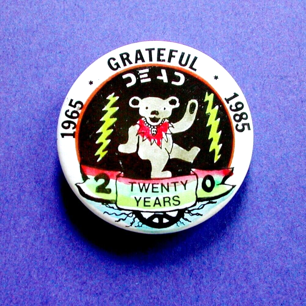 Grateful Dead Pin / Button : " Grateful Dead Twenty Years 1965 - 1985 " Dancing Bear !! ... Lightning Bolts ! & Peace Sign ! : Commemorative Pin ( Pinback / Badge ) : Rare !!! " Twenty 20 ! Years of Grateful Dead 1965-1985 !! " ... Dancin' Bear !! " Dancin' ! " - with Lightning-Bolts !! on both sides & also a Peace Sign !!! Check out this-one Dead Fans !! And all Grateful Dead " Pin Collectors " too, naturally ... nothing much to add on this one - as the photos just about say-it-all ! You've got a Dancin' Bear !! - with what looks like a Skeleton Necklace !?! boogieing-away ( paws & all ) on top of a multi-colored " Twenty 20 Years " banner ! Yellow Lightning-Bolts !! on both-sides - with a portion of a Peace Sign ! down below ... and it looks like it is either growing into the ground - or shattering the Earth ! ... depending on how you look at it, I suppose !! And as All-Ye'-Fellow-Dead-Fans know - '85 G.D. more than speaks for itself ! In a matter of fact 1965 through 1985 aren't too bad either - Ha ! ... Enjoy !!!!! I tem Condition : This Grateful Dead 1965-1985 Twenty Years 20 ! Dancing Bear Authentic ' Replica ' Pin / Button ( Pinback / Badge ) is Brand New ( never used / never worn ) - and the actual condition is ' Like New ' overall, with only the slightest bit of surface wear on the outer plastic (please see photos provided). It has only been " Collected Only ! " - stored safely in protective plastic - and has never been used or attached to anything. Please see all photos provided. Photos included are of the actual item you will receive. Grateful Dead 1965-1985 ! ... Dancin' Bear style !! - " 20 Years So Far !!! ". Size : Pin measures approximately 2 1/2" across - any which way ! - Very Cool ... Enjoy !! Please ask any questions before bidding/buying & Best of Luck ! ( also ... please feel free to click the 'see other items' button above to check out my other related live listing - Thanks ! ) U.S. & International buyers welcome (additional shipping charges & delivery time will apply for international destinations). Shipping charges include delivery confirmation on every item. Returns accepted within 14 days of purchase if item is returned unused & undamaged. Buyer pays return shipping. All items will be shipped as merchandise with the winning bid entered as item value (2025-2026).