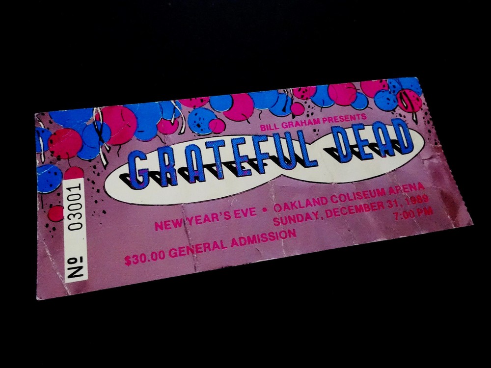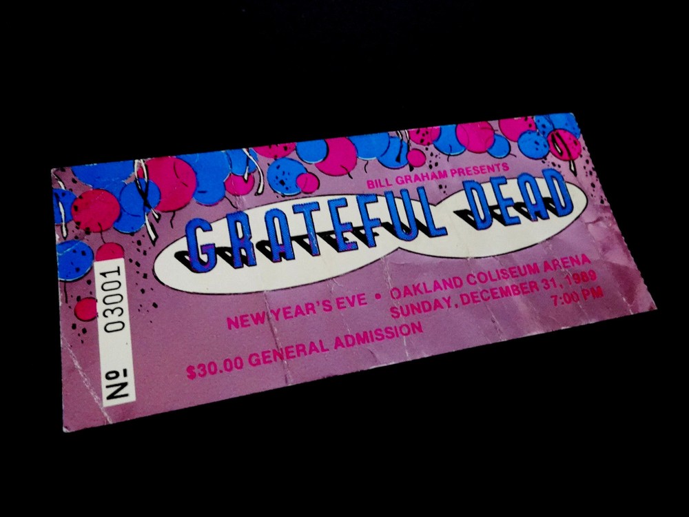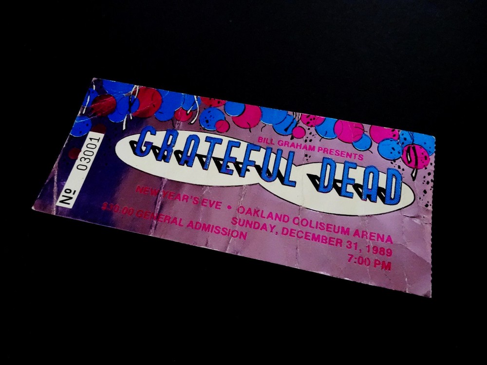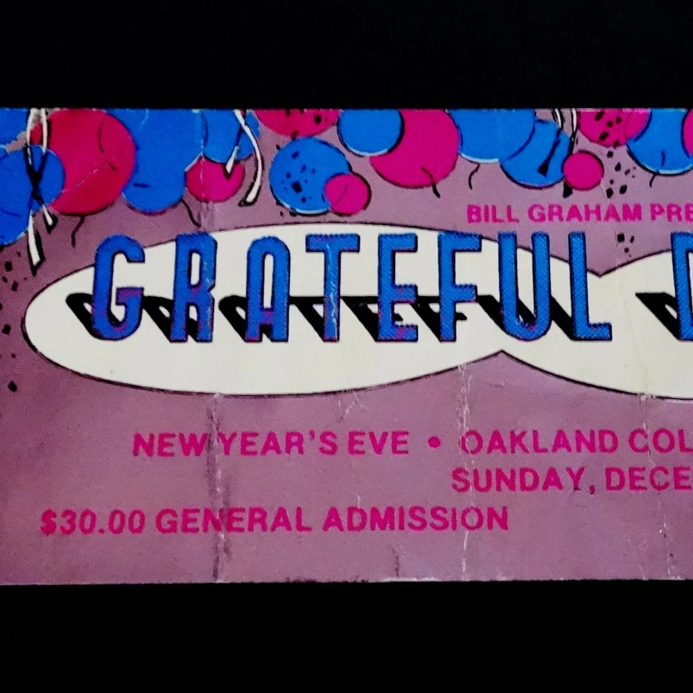 Grateful Dead Ticket Stub : New Years Eve 1989 - 1990 ! : December 31, 1989 ( 12/31/1989 ) : Oakland Coliseum Arena - Oakland, California ( CA ) : 1989 Grateful Dead Productions, Inc. / Grateful Dead Ticket Service, Inc. ( GDP / GDTS ) : Used GDP, Inc. GDTS Mail Order Ticket ! ( No. 3001 ) : The 1989 ! New Year's Eve Show !! - at the Oakland Coliseum !!! Grateful Dead " New Years Eve ! " Ticket Stub ! ... for the 1989 - 1990 New Year's Eve Show !! at the Oakland Coliseum !!!!! Dead Fans !!! Talk about an over 35-Year-Old ! " New Years Eve ! " Dead Ticket !! that is All ! Grateful Dead > Oakland Coliseum > New Years Eve ! in it's design ... as This-One ! is all about the ' Balloons ' !!!!! An ' Artistic ' notice to all Dead Fans - showing them images of just exactly what's going to be falling right on top of their Dead " Heads ! " - once that Clock strikes 12 !!!!! " Happy New Year " !!! ... and in the case of this Show - it's Iko Iko time !!! Yeah ! A Shiny-Foil ! G.D. New Years Eve GDTS Mail Order Ticket ! ... which Rocks Balloons !!! And ... Wow ! - as what a " Celebration " this Show was, for sure ... offering the last & final notes, tones & songs ... for the ' Beyond-Description ! ' 1989 Grateful Dead " Monster !! " Touring-Year - right in Oaktown ! at the Deadhead's one & only Oakland Coliseum !!! Wow ... I mean 1989 Grateful Dead !!!!! Could never-ever say enough about it, and I still can't - as heck ... I'm just still getting started ! Well, how's this for starters ... Jerry Garcia !!!!!!! As This-Guy was on a straight-up Mission ! to bring the G.D. Live Heat ! in '89, and just kept on doing it - Spring Tour, Summer Tour, Fall Tour, Winter Tour ... I mean you name it. I'm sure some of it had to be the whole ' near-death ' thing in '86, obviously ... but Jerry was 47 here, and he was playing like he was 27 again - but ... no joke, even Better !!! I mean you only get better in Rock & Roll really, if you are truly one of the Greats ! And ... just how many Guitar Players really had the ideal ' chance ' to deliver for that long, for so many Rock & Roll, and Rock & Roll " Business " type reasons ... my point being something like this --- Jimmy Page got to play like what ? ... only 12-years with Zeppelin ? And, how many years did Iommi really-get, when you account for all of the on & off ' breaks ' ( & break-ups ) by the Black Sabbath(s) - including the Ozzy unit, the Dio unit, and also the ' other ' units. And Jerry ? - well, he got 30-Years ! with the G.D., and as far as I'm concerned ... this Spring 1989 through Summer 1990 Touring pocket, was indeed a Grateful Dead " Prime ! " Era - the tail-end of the " Brent-Era "... and arguably, in many ways you can easily argue - it " Was " the Ultimate-Prime ! of the Grateful Dead, from a holistic standpoint - with ' all ' things considered. And, the simply fact is ... Jerry ! knew-it, as he got after it Harder ! in 1989 then in any other recent Dead Touring Year ... as you'd really have to go back all the way to 1985, and the " Twenty Years So Far " G.D. Tour ... and the Push ! Just think ... 6/30/85 ! Ha !! So yeah ... as this Ticket ! most-definitely represents this 1989 G.D. Touring-Year ... as it indeed ran - just like a Train running down the Track - well until 1990 ! Until 7/23/90, to be exact ... and then some too, after ... but Spring '89 to Summer '90 was indeed " King " ! With, this 1989-90 " New Years Eve " Show basically falling right in the midst of this Late Grateful Dead " Magic " Era !!! And too ... let's not even forget it either - being right around the corner, and all ---> Spring 1990 !!! Whoa !?!! This Band was " ON " my fellow Dead Fan Friends !! Believe it ... So yeah ... " Sugar Mag " came Straight ! out of the starting-gate ( for Bill ! ) ... and into > Touch ! Just-like Bill liked it ... well done Boys ! With a Women Are Smarter, and Memphis Blues in there too ... with - Yep ! ... a Big Boss Man !!! jamin' his way into the 4-spot, and then ... Shakedown Street !!!!! closing-up Set I !?!! Killer ... and if you have yet to hear it ? Change-that ... Fast ! Wow ... and after-this ... just Look-Out Below ! - or, even above too - for those Fallin' Party Balloons !!! >>> Set II : Iko Iko > Victim > Dark Star !!! ( of-course ! ... '89 !!! ) > Drums / Space > Fantasy > Jude ! > GDTRFB > Throwin' Stones > NFA !!! With ... Brokedown > SunShine DayDream !!! for the 1st ' Encore ' ... and as for the ' 2nd ' ? >>> The Midnight Hour !!!!!!! Holy-Smokes !!! A G.D. " New Years Eve " Show - of " New Year's Eve " Shows !!! Bringin' The Live G.D. Heat ! - and Never ! letting off of that Rock & Roll throttle !!! Grateful Dead !!! - New Year's Eve '89-'90 !!! - in Oaktown !!! ... Enjoy !!!!! Grateful Dead : New Year's Eve '89 - '90 : 12/31/1989 : Oakland Coliseum Arena - Oakland, California ( CA ) : Setlist >>> Set I : Sugar Magnolia > Touch Of Grey > Women Are Smarter, Big Boss Man, Memphis Blues, Shakedown Street Set II : Iko Iko, Victim Or The Crime > Dark Star > Drums > Space > Dear Mr. Fantasy > Hey Jude Finale > GDTRFB > Throwing Stones, Not Fade Away Encore 1 : Brokedown Palace > Sunshine Daydream Encore 2 : Midnight Hour > * = with Bonnie Raitt / ** = with Taro Hart / *** = with Airto Moreira > Show opened by New Grass Revival, and Bonnie Raitt > FM Broadcast on KPFA-Berkeley ( Radio Broadcast ) > Bill Graham rides in dressed as a Chicken - landed on, and cracked another Chicken Egg - with Two (2) Baby "New Years" hatched... with one being Bill Graham's son Alex Graham. Item Condition : This Vintage Original ( Genuine / Authentic ) Grateful Dead ( GDTS ) Used Mail Order Ticket for the 1989-1990 New Year's Eve Show on December 31, 1989 ( 12/31/1989 ) at the Oakland Coliseum Arena in Oakland, California ( CA ) is in Good condition - showing heavy show-used creasing & wear (please see all photos). Ticket is torn on the perforated edge, and has significant creasing & medium surface / edge wear (please see photos). This Ticket saw the Sh