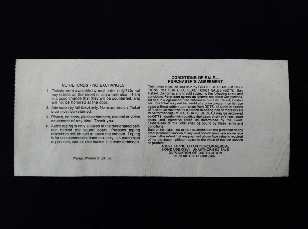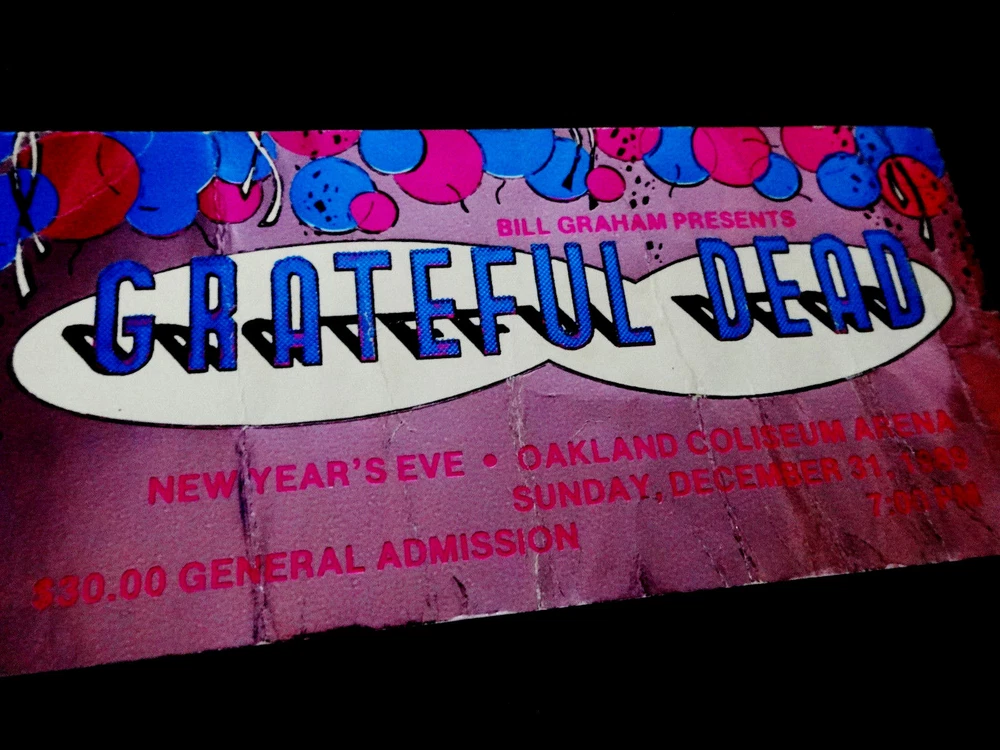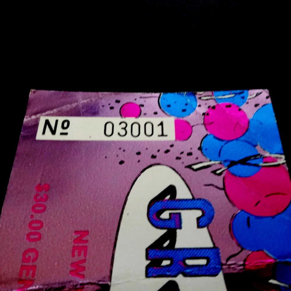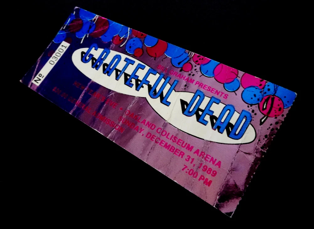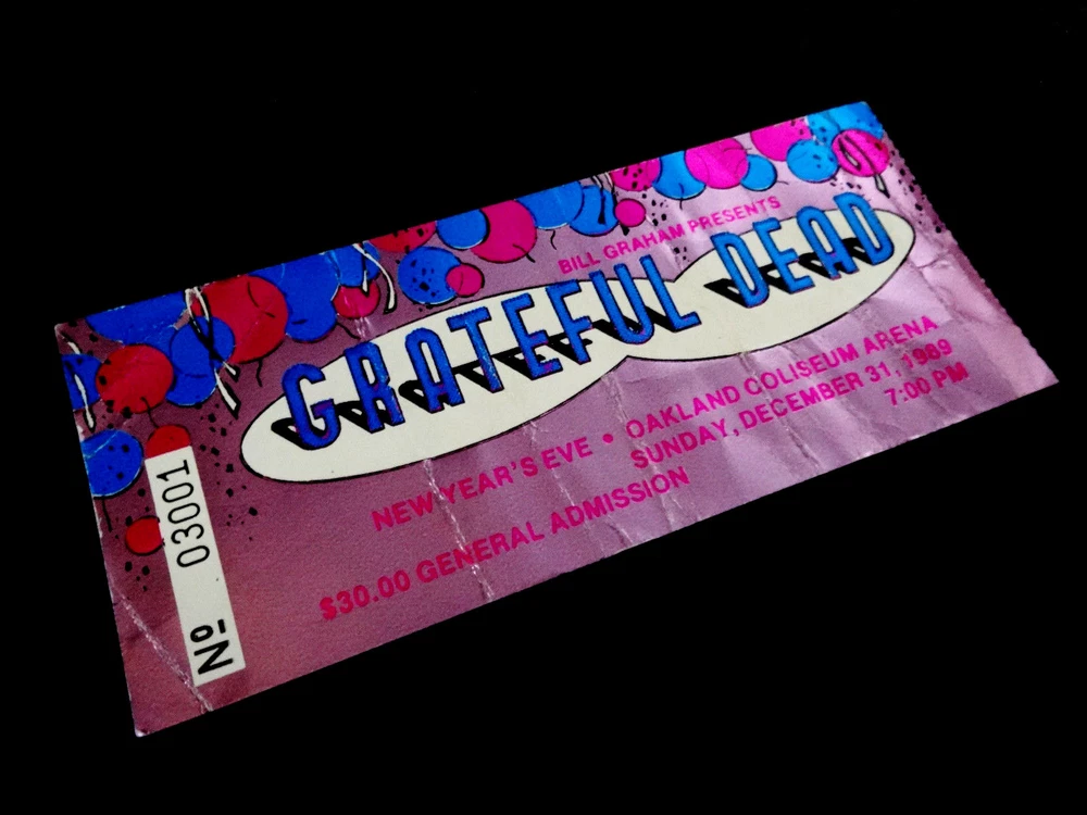 Grateful Dead Ticket Stub : New Years Eve 1989 - 1990 ! : December 31, 1989 ( 12/31/1989 ) : Oakland Coliseum Arena - Oakland, California ( CA ) : 1989 Grateful Dead Productions, Inc. / Grateful Dead Ticket Service, Inc. ( GDP / GDTS ) : Used GDP, Inc. GDTS Mail Order Ticket ! ( No. 3001 ) : The 1989 ! New Year's Eve Show !! - at the Oakland Coliseum !!! Grateful Dead " New Years Eve ! " Ticket Stub ! ... for the 1989 - 1990 New Year's Eve Show !! at the Oakland Coliseum !!!!! Dead Fans !!! Talk about an over 35-Year-Old ! " New Years Eve ! " Dead Ticket !! that is All ! Grateful Dead > Oakland Coliseum > New Years Eve ! in it's design ... as This-One ! is all about the ' Balloons ' !!!!! An ' Artistic ' notice to all Dead Fans - showing them images of just exactly what's going to be falling right on top of their Dead " Heads ! " - once that Clock strikes 12 !!!!! " Happy New Year " !!! ... and in the case of this Show - it's Iko Iko time !!! Yeah ! A Shiny-Foil ! G.D. New Years Eve GDTS Mail Order Ticket ! ... which Rocks Balloons !!! And ... Wow ! - as what a " Celebration " this Show was, for sure ... offering the last & final notes, tones & songs ... for the ' Beyond-Description ! ' 1989 Grateful Dead " Monster !! " Touring-Year - right in Oaktown ! at the Deadhead's one & only Oakland Coliseum !!! Wow ... I mean 1989 Grateful Dead !!!!! Could never-ever say enough about it, and I still can't - as heck ... I'm just still getting started ! Well, how's this for starters ... Jerry Garcia !!!!!!! As This-Guy was on a straight-up Mission ! to bring the G.D. Live Heat ! in '89, and just kept on doing it - Spring Tour, Summer Tour, Fall Tour, Winter Tour ... I mean you name it. I'm sure some of it had to be the whole ' near-death ' thing in '86, obviously ... but Jerry was 47 here, and he was playing like he was 27 again - but ... no joke, even Better !!! I mean you only get better in Rock & Roll really, if you are truly one of the Greats ! And ... just how many Guitar Players really had the ideal ' chance ' to deliver for that long, for so many Rock & Roll, and Rock & Roll " Business " type reasons ... my point being something like this --- Jimmy Page got to play like what ? ... only 12-years with Zeppelin ? And, how many years did Iommi really-get, when you account for all of the on & off ' breaks ' ( & break-ups ) by the Black Sabbath(s) - including the Ozzy unit, the Dio unit, and also the ' other ' units. And Jerry ? - well, he got 30-Years ! with the G.D., and as far as I'm concerned ... this Spring 1989 through Summer 1990 Touring pocket, was indeed a Grateful Dead " Prime ! " Era - the tail-end of the " Brent-Era "... and arguably, in many ways you can easily argue - it " Was " the Ultimate-Prime ! of the Grateful Dead, from a holistic standpoint - with ' all ' things considered. And, the simply fact is ... Jerry ! knew-it, as he got after it Harder ! in 1989 then in any other recent Dead Touring Year ... as you'd really have to go back all the way to 1985, and the " Twenty Years So Far " G.D. Tour ... and the Push ! Just think ... 6/30/85 ! Ha !! So yeah ... as this Ticket ! most-definitely represents this 1989 G.D. Touring-Year ... as it indeed ran - just like a Train running down the Track - well until 1990 ! Until 7/23/90, to be exact ... and then some too, after ... but Spring '89 to Summer '90 was indeed " King " ! With, this 1989-90 " New Years Eve " Show basically falling right in the midst of this Late Grateful Dead " Magic " Era !!! And too ... let's not even forget it either - being right around the corner, and all ---> Spring 1990 !!! Whoa !?!! This Band was " ON " my fellow Dead Fan Friends !! Believe it ... So yeah ... " Sugar Mag " came Straight ! out of the starting-gate ( for Bill ! ) ... and into > Touch ! Just-like Bill liked it ... well done Boys ! With a Women Are Smarter, and Memphis Blues in there too ... with - Yep ! ... a Big Boss Man !!! jamin' his way into the 4-spot, and then ... Shakedown Street !!!!! closing-up Set I !?!! Killer ... and if you have yet to hear it ? Change-that ... Fast ! Wow ... and after-this ... just Look-Out Below ! - or, even above too - for those Fallin' Party Balloons !!! >>> Set II : Iko Iko > Victim > Dark Star !!! ( of-course ! ... '89 !!! ) > Drums / Space > Fantasy > Jude ! > GDTRFB > Throwin' Stones > NFA !!! With ... Brokedown > SunShine DayDream !!! for the 1st ' Encore ' ... and as for the ' 2nd ' ? >>> The Midnight Hour !!!!!!! Holy-Smokes !!! A G.D. " New Years Eve " Show - of " New Year's Eve " Shows !!! Bringin' The Live G.D. Heat ! - and Never ! letting off of that Rock & Roll throttle !!! Grateful Dead !!! - New Year's Eve '89-'90 !!! - in Oaktown !!! ... Enjoy !!!!! Grateful Dead : New Year's Eve '89 - '90 : 12/31/1989 : Oakland Coliseum Arena - Oakland, California ( CA ) : Setlist >>> Set I : Sugar Magnolia > Touch Of Grey > Women Are Smarter, Big Boss Man, Memphis Blues, Shakedown Street Set II : Iko Iko, Victim Or The Crime > Dark Star > Drums > Space > Dear Mr. Fantasy > Hey Jude Finale > GDTRFB > Throwing Stones, Not Fade Away Encore 1 : Brokedown Palace > Sunshine Daydream Encore 2 : Midnight Hour > * = with Bonnie Raitt / ** = with Taro Hart / *** = with Airto Moreira > Show opened by New Grass Revival, and Bonnie Raitt > FM Broadcast on KPFA-Berkeley ( Radio Broadcast ) > Bill Graham rides in dressed as a Chicken - landed on, and cracked another Chicken Egg - with Two (2) Baby "New Years" hatched... with one being Bill Graham's son Alex Graham. Item Condition : This Vintage Original ( Genuine / Authentic ) Grateful Dead ( GDTS ) Used Mail Order Ticket for the 1989-1990 New Year's Eve Show on December 31, 1989 ( 12/31/1989 ) at the Oakland Coliseum Arena in Oakland, California ( CA ) is in Good condition - showing heavy show-used creasing & wear (please see all photos). Ticket is torn on the perforated edge, and has significant creasing & medium surface / edge wear (please see photos). This Ticket saw the Sh