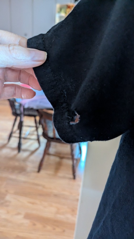 There is a small hole in the right sleeve. Thanks for looking! Please ask any questions you may have. Items are used unless listed as new. Shipping is either priority or ground advantage. I ship within 1 day. Return within 30 days, I pay for return shipping. Check out my store for clothing and collectibles. I have VS bra's, Lefton, Josef, Japan, crystal items, vintage linens, collectible Christmas, religious collectibles and much more. Thank you for shopping with me!