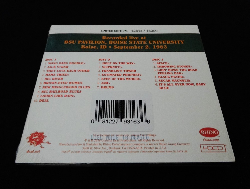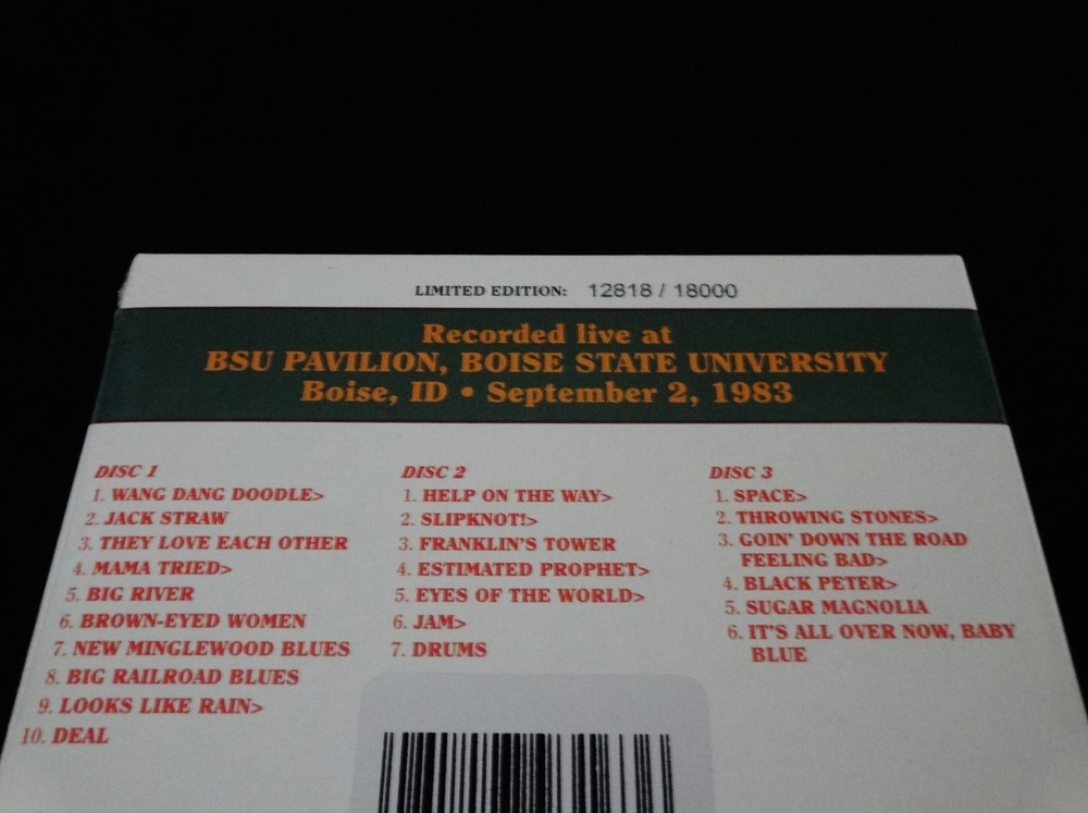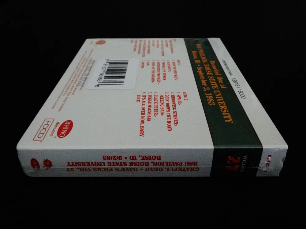 Grateful Dead : Dave's Picks 27 Volume Twenty Seven : BSU Pavilion - Boise State University - Boise, Idaho ( ID ) : September 2, 1983 ( 9/2/1983 ) : 1983 Late Summer / Early Fall Tour ! : 3 CD : 2018 (1983/2018) Grateful Dead Productions, Inc. / Rhino ( GDP / Rhino ) - R2 565021 : Rare ! Limited Edition ' Individually-Numbered ' CD Set ( of # 18,000 ) : Brand New / Factory Sealed ! : 1983 ! ' Live-Dead ' !! - in Idaho !!! The nothing-short of Legendary ! Mid-'80's !! 1983 Summer / Fall Tour stop at BSU ! ... Boise State ! - the Proud Home of the Broncos ! - even in a " Brand New " Outdoor Music Shed too ! The " 1st ! " & " Only !! " Grateful Dead Show " Ever !!! " in Idaho ! And my oh my ... because if you are just going to get " 1 " - then yeah ... Wish-For-This !!! The Good Ol' ( Mid-'80's ! ) Grateful Dead just Building ! on their Legend ... Delivering ! Rock & Roll ! and the Blues !! - they way they are Meant ! to be played properly ' Live ' - and yeah ... Taking " No ! " Prisoners !!! As every ( Lucky ! ) Deadhead was so-fortunate to even get out of here alive ... as this is a Live-Dead Attack !!! Oh my goodness ?!? ... Oh My Grate!-ness !!! Did we just get a " Mid-'80's ! " ... " 1983 !! " Dead Show from the Dave's-Picks Series ??! I mean ... it's in my hand right-now - so ... I know that we did ! So-yeah ... " Thank~You ! " ( x 1,000,000 !!! ). Because yeah ... This-Show is Dirty ! - Nas~ty !! & Completely ! ... Beautiful !!! Words do absolutely ' nothing ' here my fellow Fans - so just Hit-Play ! I mean ... This ! is the " 1st ! " Dead Show Ever ! in Idaho !! - from 1965 to 1983 ! And then ... it's even a " One & Done " ??! So ... just what did Phil ! have to say to the Boise State ! Dead Fan Faithful ?? >>> " Citizens Of Boise ... Submit !! or Perish ! - You Are A Conquered People !!! ". Ha ! And, I mean ... just like they say - ' Words ' are one-thing, and " Proving-It ! " is entirely another. Well, damn ... as that sure didn't take long. " Proven ! " right-away with a Droning ! - Tone-Fat !! & Killer !!! Wang Dang Doodle !!!! ... to straight-up ' Open ' This-Show !!!!! And, let me just say this super-quickly ... just think " 7/8/90 " - as there are some serious ' parallels ' here, right off the top of my Dead-Head memory ... because " On-Paper " these Shows might " Look " like 5's & 6'es - but, if you put on the headphones & ' listen ' - or, even better yet ... You ! were " There !? " ... well, yes indeed - as these are " On-Paper " Setlist-disguised Shows ( which ' appear ' to be maybe a 5 or a 6 ) - but, in reality ... Straight-Up ! 8's - 9's - and no-jokes ... maybe even 9.5's !! So, keep this in mind ( for sure ). Which, you'll really only even need to contemplate during ahhh ... like the very-beginning of Jack Straw ? Because You ! are right-in the Crosshairs ! of what soon-becomes a Furious ! Jerry Garcia Blues-Fired ! Rock & Roll Attack !!! And trust me ... no-one's off the hook here - because you've also got to deal with Bobby !! - Phil ! - Brent ! ... BK ! & Mick ! I mean ... " Wang Dang Doodle " and it is On !!! -- " All-Night-Long !!! " I mean hell, I've already decided that This ! is the Hottest ! release ( or, you know - here in today's times ... " re-release " ) in 2018 thus far - by Any-Band !! Nothing tops this Aggressive ! & Attack-Heavy !! 1983 Live-Dead !!! And, if you happen to doubt me here at all ... just play the ' Wang Dang ' ( & listen to Bob, Phil & Jerry ! ) - play the ' Big River ' ( & listen to Jerry ! ) - play the Minglewood ( listen to Bob & Jerry ! ) - play the ' Big RxR ' ( & listen to Jerry !! ) - play the Deal ( & listen to Jerry !!! ) ... play the " Massive ! " Help > Slip ! > Frank " ( & Listen-To-Jerry !!!!! ). You'll likely be begging for just at least a little-bit of mercy, at this point - but, The Boys aren't going to give you Any ! ... None !! As you'll soon see that Phil's claim was no-joke at all ... & they are ' Making ' You " Submit !!! ". And, when it comes to ' Tone !?! ' - just forget about it ... ahhhhh ... how should I say this - well, for starters ... how about = " Completely-Filthy !!!!! ". Phil = 6-String ! Moddy ... Ace = Black Graphite ! Moddy ... Garcia ... yeah, right - Position-3 Switch on the ' Dual ' DiMarzios + Unity-Gain Buffer " forging the path for this Heavenly-Piercing ! Jerry-Tone " Magic !!! " ... ' Mac !! Your Face ! ' - right-off Our ! Heads !! This is Jerry at his flat-out Best ! on the fret board, and frankly ( yet, also ' politely ' ) - I don't care what anyone else says. Go & read or listen to a few of his ( own ) ' Interviews ' from this " Magical " Dead Era - and yep ... he'll tell you all by himself >>> '79 ! > '80 ! > '81 !! > '82 !! > '83 !!! > '84 !! > '85 !!! > '89 !!! Hah ! - or, you know what I'm saying ... something-like-that. All right ... and so now it's ' Time ' to Talk-About ... the " Help > Slip ! > Franklin's " ! ... because this one can't-even be talked about - it's SO-HOT !!!!!!! And plus, we already touched on the clear ( & clearly-audible ) Unity-Gain Buffer advantage here ... ( no boost pre-amp, protecting Tiger's ! tone from ( Any ! ) high-end loss ) - and frankly, this is like an " Exhibit-A " here - just like Garcia himself did once say ( Ha ! ). And too ... just look at it this-way - this is like the 10th or 11th ( can't remember exactly-which ) Help > Slip ! > Frank during this Glorious ! '83-'84 revival-period - so, you know pretty much what I'm saying here ( hopefully ? ) - like ... " Right ! " in the fresh & ready ... Sweet-Spot !! And, another thing too - History-Wise ! - this is actually the Classic '83 Tour ! where ... Phil actually " Drove-Himself " ! I mean ... Frost ? > Portland Memorial ? > Seattle Center ? > Eugene Hult ! > Boise, Idaho ! > Park West ?! ... Red Rocks !!! ... Santa Fe, NM ! - Manor Downs - Austin ! TX ! ... ( drum-roll .. .. .. ) > Grass Valley !!!! & Watsonville !!!!! Holy~Dead~Tour !?!?!?!?! What else can you say other-than ... Phil's a Really-Smart