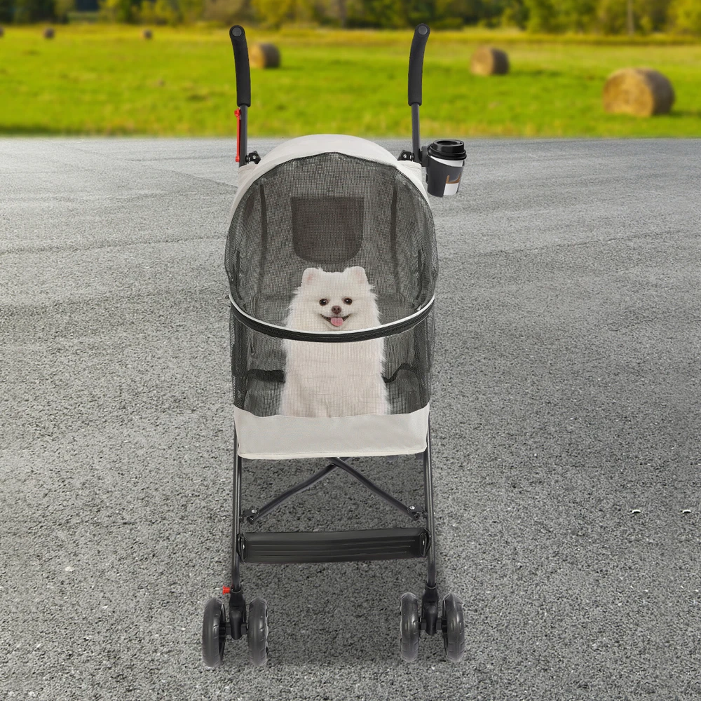 Pet Dog Stroller Travel Carriage 4 Wheels With Cup Holder & Rear Pocket, Gray Description On a sunny afternoon, traveling with your beloved pet and enjoying the charming scenery is such a pleasant thing! Our pet stroller is made of high-quality materials to ensure durability. The stable structure, comfortable seat cushion, and breathable window greatly improve the comfort of pet riding. The built-in safety rope makes your pet's travel safer! What are you still hesitating about? Let this lightweight pet stroller bring you a relaxed and comfortable travel experience! Key Features Sturdy and Durable: It is mainly made of high-quality Oxford cloth and iron, and the surface is treated with a spray molding process, which is waterproof, rust-resistant, scratch-resistant, sturdy, and durable to ensure a long service life. Good Load-bearing Capacity: The triangular construction and sturdy frame can safely hold up to 22 lbs, allowing your pet to ride with confidence. Comfortable Ride: It comes with a comfortable cushion and spacious seating space(15*13 inches) to ensure your pet's comfort while traveling. The breathable mesh window not only satisfies the pet's curiosity about the outside world but also promotes air circulation to keep them cool and comfortable. Safety Design: It has a built-in safety rope to prevent your pet from accidentally breaking free, and the zip closure design prevents your pet from jumping out during movement, so you can travel safely with your pet. User-Firendly: The zipper can open 180 degrees, making it easy for pets to interact intimately with owners and enhance their relationship. The Oxford cloth cover has a certain degree of waterproofing, so you don't have to worry about your pet getting wet from the rain. Easy to Carry and Store: It is designed with a quick folding mechanism, allowing you to easily fold it into a compact size by simply removing the folding buckle and pressing down on the frame, making it convenient to store in the trunk of your car or in the corner of your home. The lightweight design makes transportation easier. Flexible Movement and Fixation: The two front wheels that can rotate 360 ° make the trolley move smoothly and flexibly, and the rear wheels with brakes are easy to fix at any time, enhancing the convenience of use. Ready to Use: Our product is mostly assembled, and once received, you only need to install the casters, saving time and effort. Easy to Clean: The smooth surface and simple construction allow you to easily wipe away dust with a rag. The removable and washable cushion saves time and effort. Details Round Corners: The rounded and smooth corners can effectively protect pets from scratches and improve the safety of use. Cup Holder: It can securely hold water cups or bottles(not included), making it easy for you to travel. Rear Pocket: It is convenient for you to carry some tissues, food, and other small items on the go. Comfortable Handle: The high-density foam tube design provides a soft and comfortable grip, reducing hand fatigue for long-term outdoor use. Application It is suitable for carrying small and medium-sized dogs or cats under 22 lbs and is suitable for various occasions such as walking, shopping, traveling, etc., to meet the needs of different scenarios. Specifications Color: Blue/Pink/Black/Gray Material: Oxford Cloth, Iron, Foam Tube Process: Spray Molding Load-bearing Capacity: Within 10kg/22 lbs Applicable Pets: Small & Medium-sized Dogs/Cats Age Range (Description): All Life Stages Assembly Required: Yes Cockpit Size: 37*32*53cm/15*13*21in Product Size(Folded): 103*20*22cm/41*8*9in Product Size(Unfolded): 55*45*97cm/22*18*38in Package Size: 76.5*41*13cm/30.12*16.14*5.12in Gross Weight: 5kg/11.02 lbs Net Weight: 4.3kg/9.48 lbs Package Included 1*Pet Stroller 2*Casters Notes 1.Please confirm the size of the product before purchasing. 2.Please use it within the load-bearing range of the product. 3.Please allow the slight color difference caused by the shooting light and 1-3 cm error due to manual measurement, and make sure you do not mind before ordering. Brand CNCEST Feature! Stable performance, durable Feature ❤ ❤Premium Material❤Long Service Life❤Creative Design❤ Feature ★ ★Good Quality Guarantee★ Type Pet Stroller Dog Size Small & Medium-sized Dogs/Cats Dog Breed Cats and dogs under 10 kg Material Oxford Cloth, Iron, Foam Tube Process Spray Molding Load-bearing Capacity Within 10kg/22 lbs Age Range (Description) All Life Stages Assembly Required Yes Cockpit Size 37*32*53cm/15*13*21in Product Size(Folded) 103*20*22cm/41*8*9in Product Size(Unfolded) 55*45*97cm/22*18*38in Package Size 76.5*41*13cm/30.12*16.14*5.12in Gross Weight 5kg/11.02 lbs Net Weight 4.3kg/9.48 lbs Tip❤ If you have any question , please contact us ★Feature★ ★★★Reliable Quality★★★Easy installation★★★Ideal Gift★★★ color grey