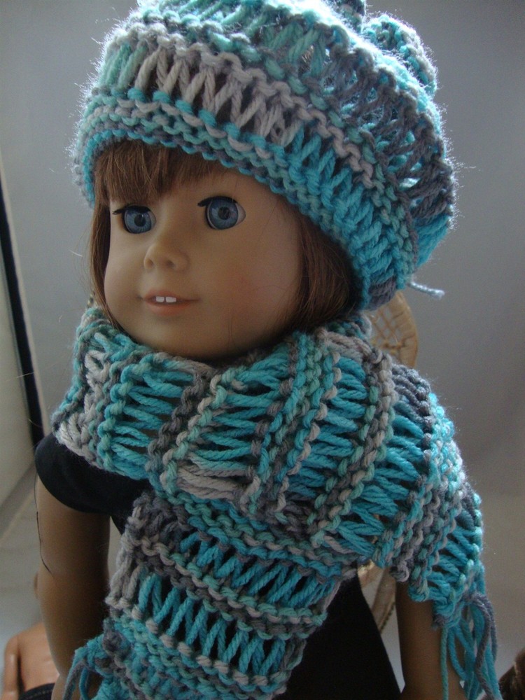 HANDMADE HAND KNIT Gray and Blue Shades Beanie Hat and matching scarf with fringe FITS 18" DOLL such as the American Girl The doll and any other accessories are not included This was made from a pattern from Marinda Creations - Beanies & Scarves. It can be purchased through Pixie Faire. Powered by SixBit's eCommerce Solution