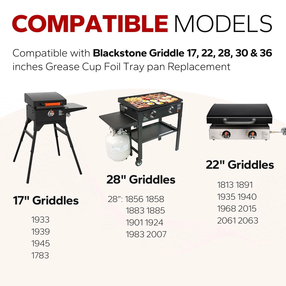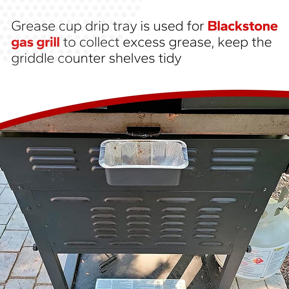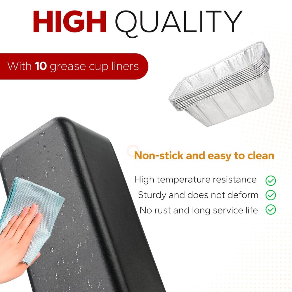 Grease Catcher Cup for Blackstone Griddle with 10 Aluminum Foil Drip Pans Features: 【Compatible Models】Black grease trap specially designed for Blackstone 17", 22", 30" & 36" inches griddle, Perfect fit for Blackstone griddle accessories 【High Quality】griddle oil grease catcher is made of high quality coated steel material, the griddle grease trap with wear and high temperature, durable, not easy to break 【Function】Grease cup drip tray is used for Blackstone gas grill to collect excess grease, keep the griddle counter shelves tidy and the griddle oil catcher has a smooth surface for easy cleaning 【Easy to Install】Grill collection pan simply hangs on the side rack or the furnace mouth to collect grease without any tools. with 10 pc grease cup liners can be replaced at any time to prevent hot hands when cleaning the grease trap 【Note】Please confirm the grease tray size before purchasing 🌻 If you need more quantity than shown available - just send me a message and I'll increase the purchased limit for you 🌻 SHIPPING We are always working hard to ensure your package arrives as soon as possible. Please understand that some factors like weather, high postal traffic, and the performance of shipping companies are outside of our control. We offer free shipping to the lower 48 states. We do not accept P.O. Boxes. Please provide a physical address. Thank you 🌻 TRANSLATE with x English Arabic Hebrew Polish Bulgarian Hindi Portuguese Catalan Hmong Daw Romanian Chinese Simplified Hungarian Russian Chinese Traditional Indonesian Slovak Czech Italian Slovenian Danish Japanese Spanish Dutch Klingon Swedish English Korean Thai Estonian Latvian Turkish Finnish Lithuanian Ukrainian French Malay Urdu German Maltese Vietnamese Greek Norwegian Welsh Haitian Creole Persian