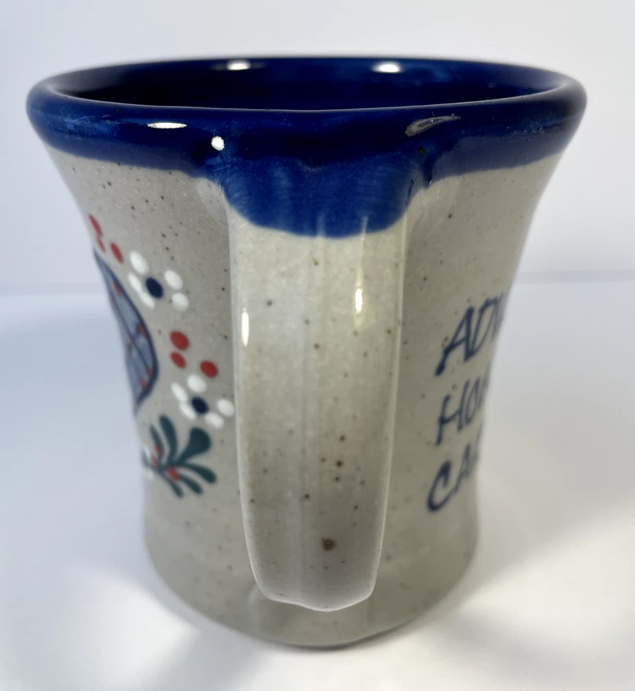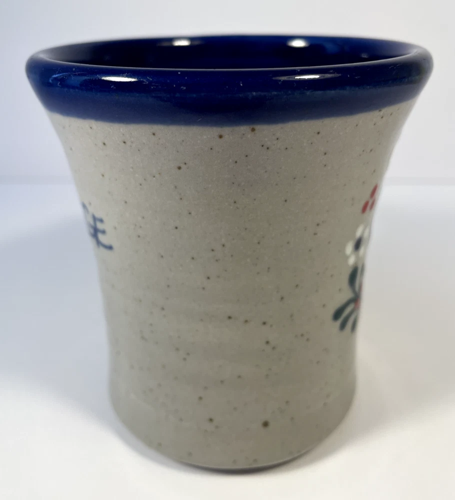 This Great Bay Pottery mug from North Hampton, NH is handmade from stoneware and features a round shape with a glossy finish. The mug is adorned with a heart theme, making it suitable for all occasions, including Valentine's Day. It has a printed back stamp and a 4-inch diameter, standing at 4.375 inches tall and weighing 13.5 oz. This original coffee cup is a piece of art pottery, showcasing the craftsmanship and creativity of the United States-made product.