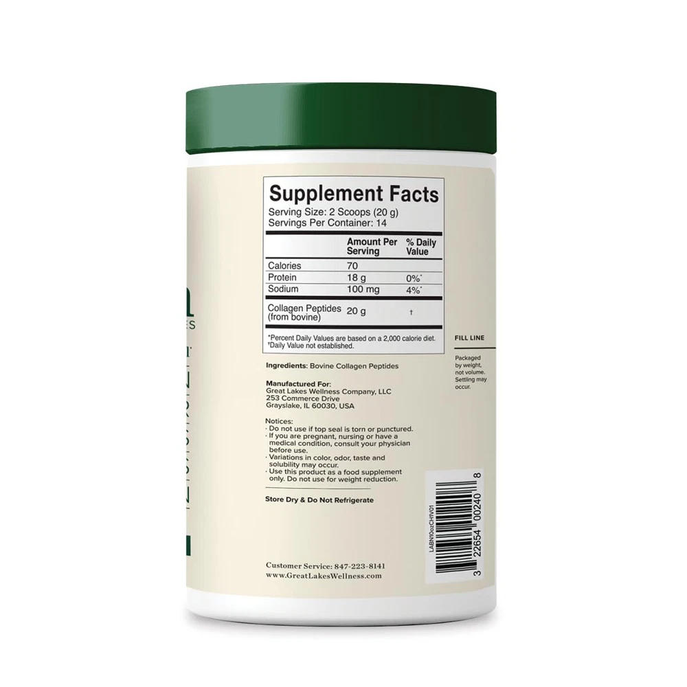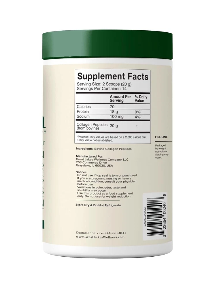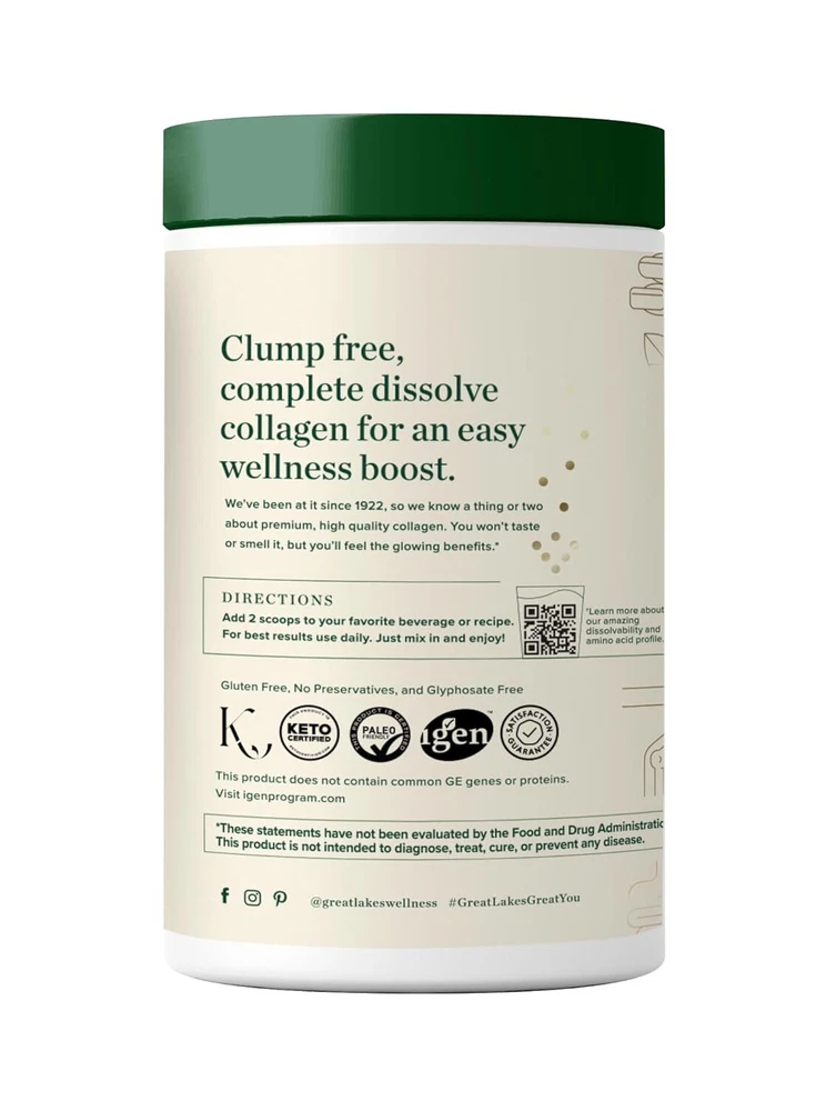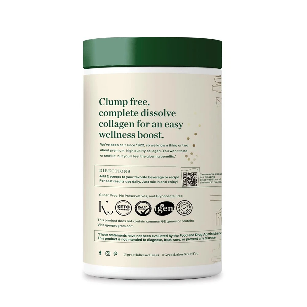 DAILY WELLNESS: For your daily routine, 12 grams of unflavored collagen hydrolysate per serving. Types I and III hydrolyzed collagen provide the amino acids necessary to support hair, skin, nail, and joint health.* HYDROLYZED FORMULA: An easy way to supplement collagen into your diet. Great Lakes Wellness Collagen Peptides Powder provides support for collagen production as we age. Good for men and women. QUICK DISSOLVE: Collagen Peptides Powder is sourced from grass-fed bovine. Easily digested and absorbed by the body quickly for maximum benefits. EASY TO USE: Daily Wellness Quick Dissolve Collagen Peptides is easy to add to hot or cold liquids. Perfect for coffee, tea, smoothies, or recipes. MADE FOR YOU: iGen Non-GMO Tested, Paleo-Friendly, KETO-Certified, Gluten-Free, No Preservatives, Glyphosate Free and Kosher. No added dairy, sugars, or sweeteners. Flavorless and odorless. Product Description