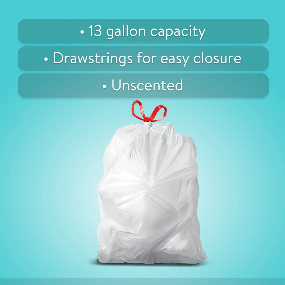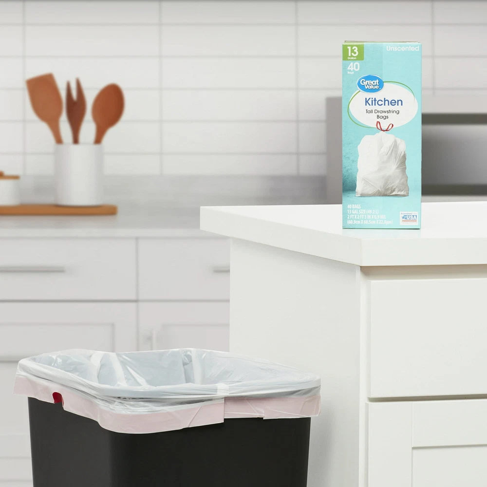 Keep your kitchen clean and organized with these Great Value 13-gallon drawstring trash bags. These large, white plastic bags are perfect for holding kitchen waste and come with a convenient drawstring closure. With 40 bags included, you can stock up and always have a bag on hand for any kitchen mess. These unscented trash bags are designed for easy use and disposal, making them a great addition to any kitchen. The bags are made of durable plastic and can hold up to 13 gallons of waste. The drawstring closure ensures that the bag stays securely in place, while the convenient size makes it easy to carry out for disposal. Add these Great Value trash bags to your kitchen supplies today and keep your space clean and clutter-free.