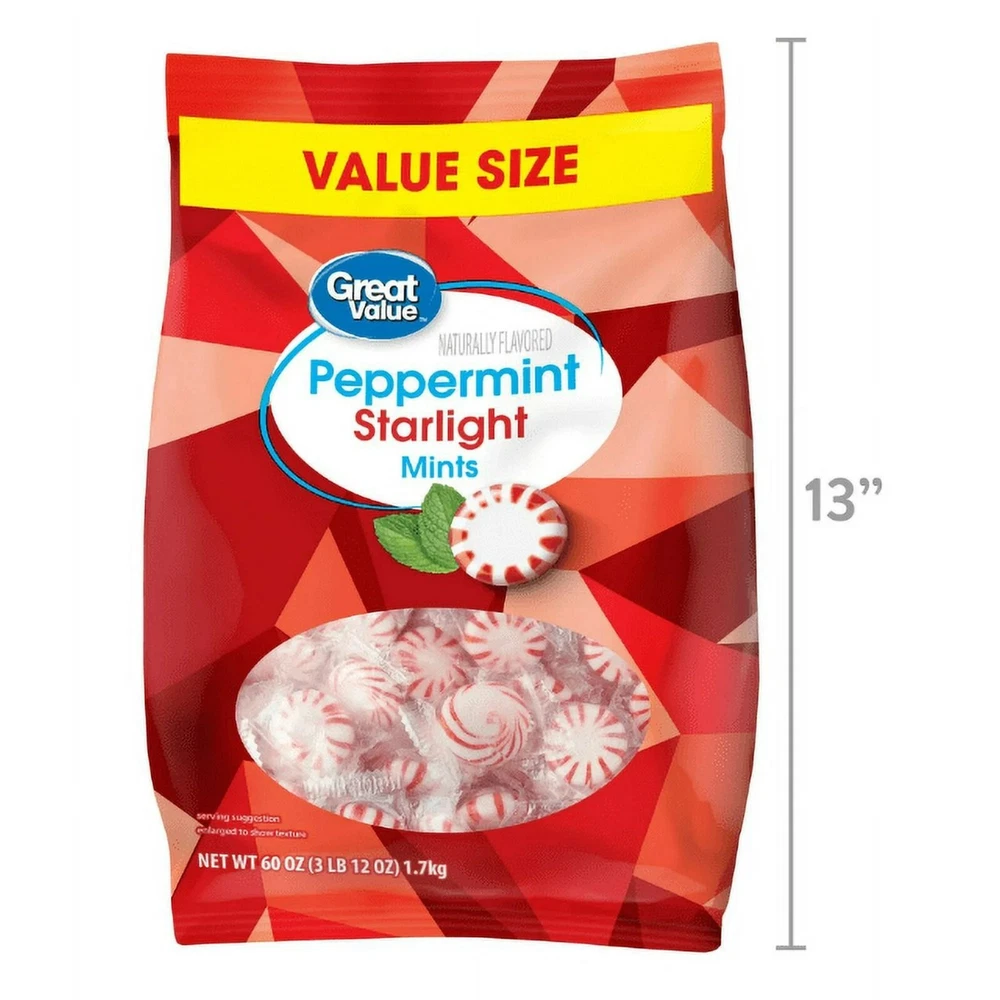 About this item Nutrition information Product details Great Value Peppermint Starlight Mints Hard Candy, 60 oz Peppermint 60oz Specifications Food Allergen Statements Contains bioengineered food ingredients Brand Great Value Allergen-Free Statements Gluten-Free