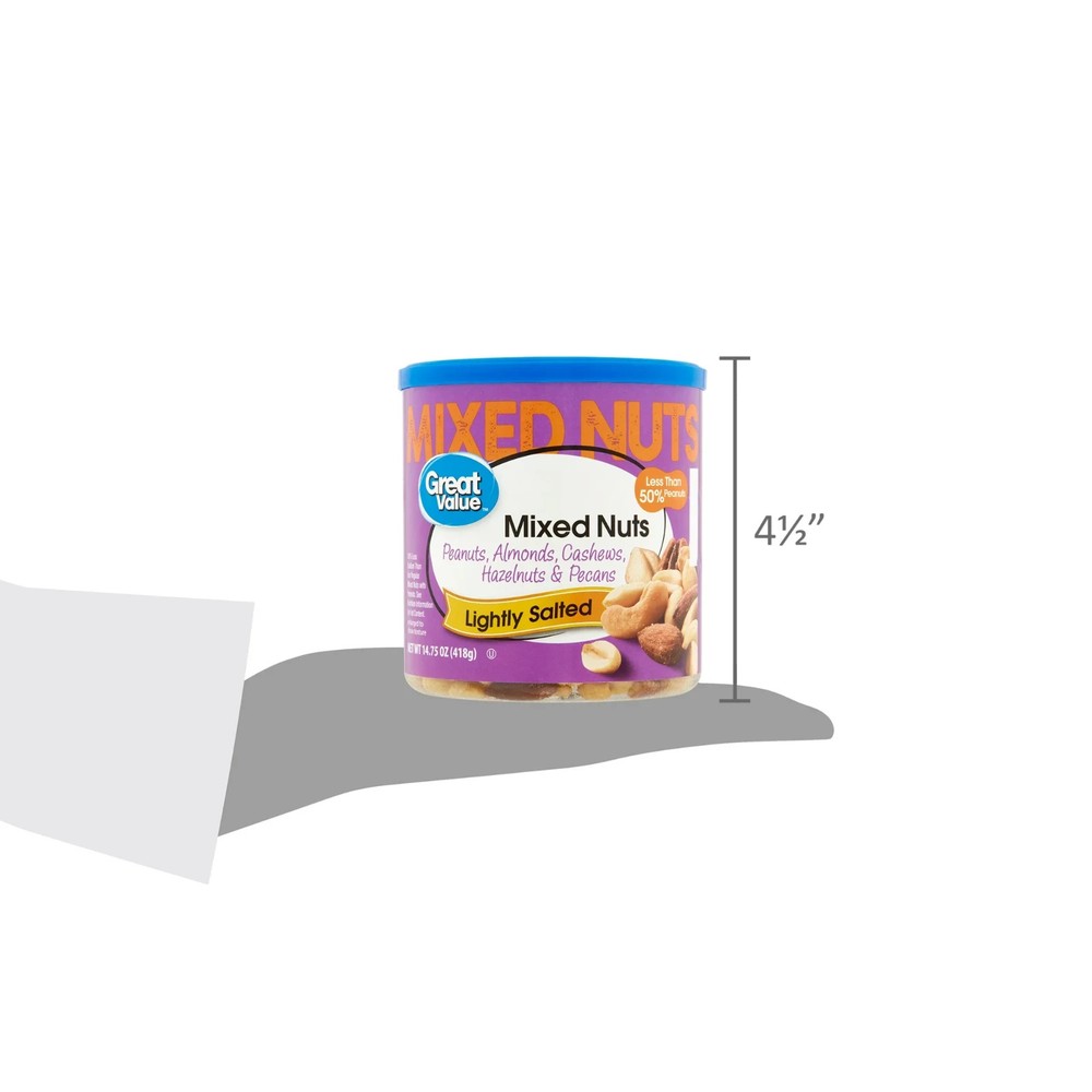 Great Value Roasted & Lightly Salted Mixed Nuts, 14.75 oz — Short Description A convenient snack mix of roasted and lightly salted nuts including peanuts, cashews, almonds, Brazil nuts and pecans, packed in a 14.75 oz resealable container. This blend offers a satisfying crunch with a simple, delicious flavor and is a good source of protein and several vitamins and minerals, making it ideal for everyday snacking, adding to recipes, or enjoying with friends and family.