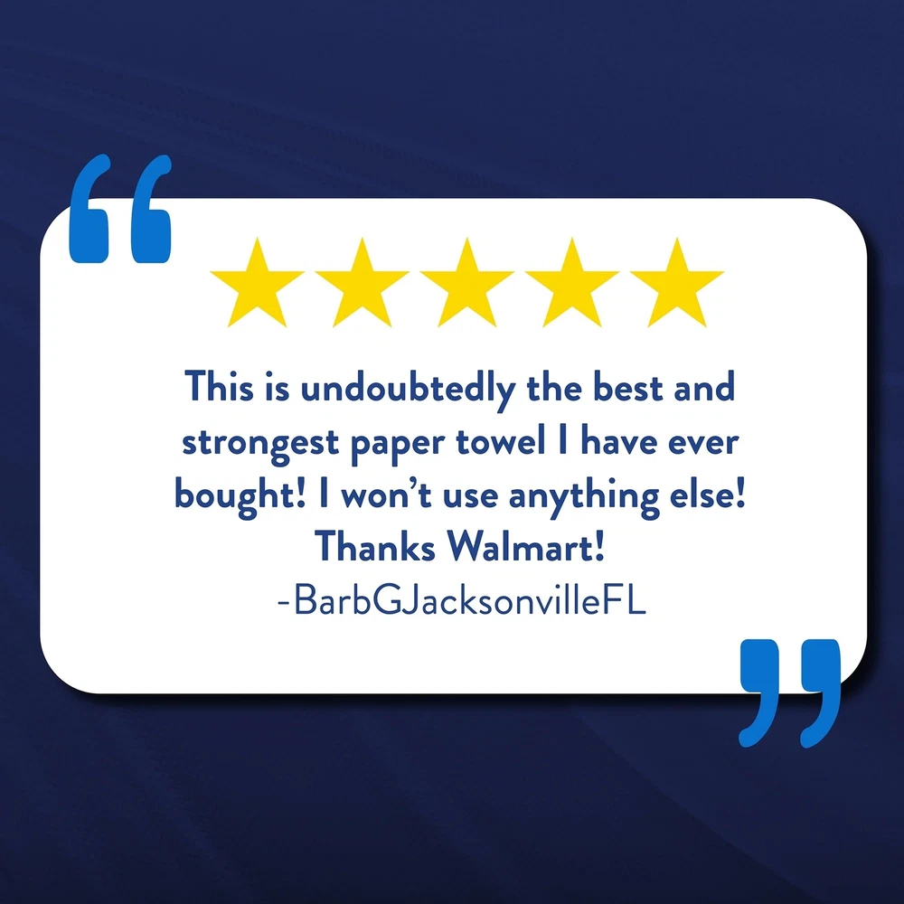 Great Value Ultra Strong Paper Towels feature premium 2-ply sheets that are super strong and absorbent making them the ideal paper towel for your home. Our towel has the right combination of soft texture with durable strength that you've been looking for. This pack contains 12 double rolls which gives you two times as many sheets as regular rolls, so you can tackle two times as many messes. The split sheets give you the option to choose the amount you need when cleaning up spills, dirt, grime, food waste, and more. The rolls are conveniently sized to easily fit in any kitchen, bathroom, workspace, and more. Each roll includes 110 sheets with a lovely embossed pattern. Experience the difference with Great Value Ultra Strong Paper Towels. Great Value products provide families with affordable, high-quality grocery and household consumable options. With our wide range of product categories spanning grocery and household consumables, we offer you a variety of products for your family's needs. Great Value Ultra Strong Paper Towels, White, 12 Double Rolls This 12 double roll pack is equivalent to 24 regular rolls (when compared to regular-size rolls with 55 sheets) Each roll features 110 split size sheets, which gives you two size options for cleaning various messes Great Value Ultra paper towels are SFI? certified ? which supports sustainable forests and healthy habitat Our absorbent paper towels have soft texture with durable strength you can trust Total Area: 594.9 sq ft (55.2 m) Sheet Size: 11 in X 5.9 in (27.9 cm X 14.9 cm) Backed by the Great Value Guarantee