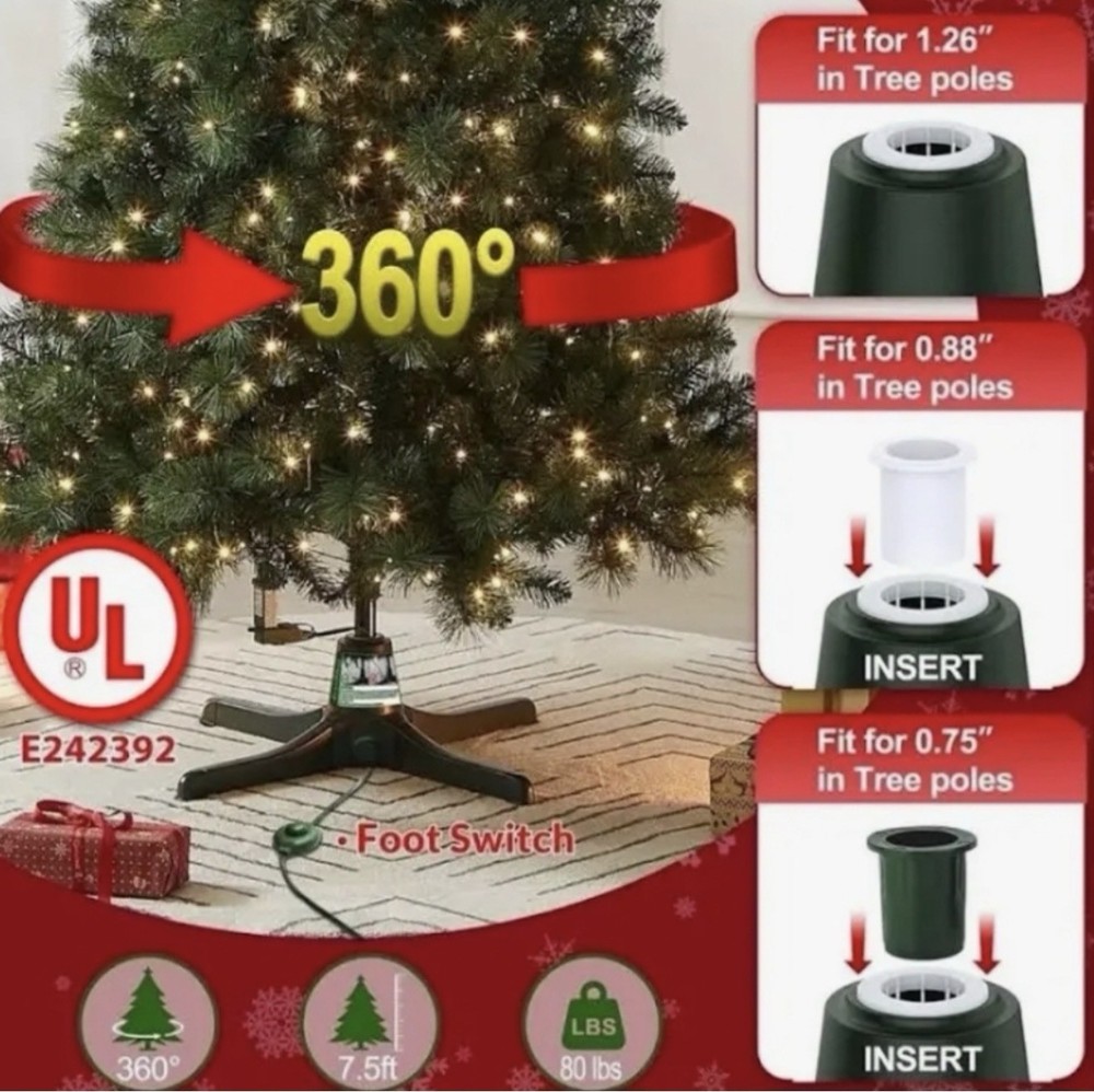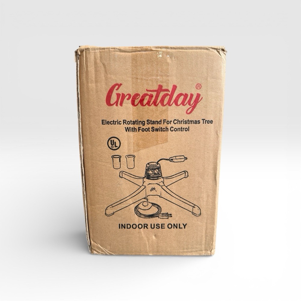 CONDITION New – Open Box Box shows visible wear and damage from storage. Item itself is unused and in new condition. All components included. Please review all photos carefully for exact condition. –––––––––––––– DESCRIPTION Greatday Electric Rotating Stand for Christmas Tree with Foot Switch Control. Designed to slowly rotate your Christmas tree 360° for full display visibility. Perfect for showcasing ornaments and lighting from every angle. Features: • 360° rotating base • Foot switch on/off control • UL certified for safety • Indoor use only • Supports trees up to approximately 7.5 feet tall • Weight capacity up to 80 lbs • Adjustable inserts fit multiple tree pole sizes: – 1.26” – 0.88” – 0.75” Includes: • Rotating tree stand • Foot switch power cord • Pole size inserts (as shown) Tree and decorations not included.