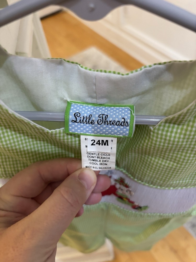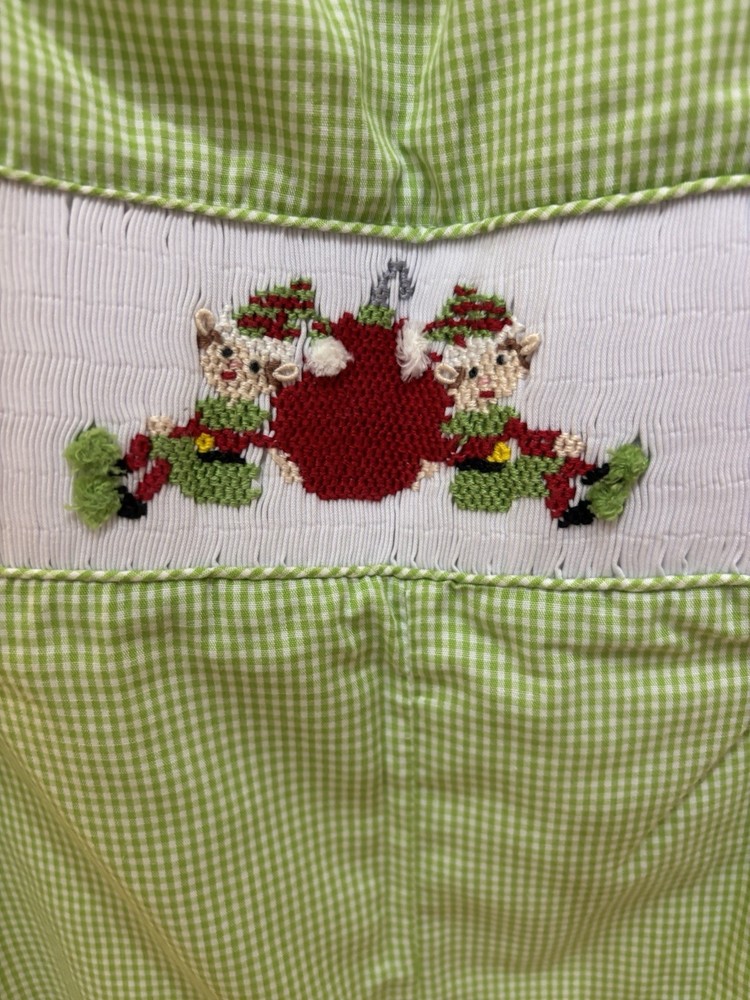 This Green and White Checkered Smocked Christmas Romper in size 24 months is a perfect outfit for the holiday season. Made of soft cotton, this one-piece romper features a button closure and a cute Christmas theme. The green color and checkered pattern add a festive touch, while the smocked details give it a unique look. Easy to care for with machine washable instructions, this romper from little threads is a stylish choice for your little one's winter wardrobe.