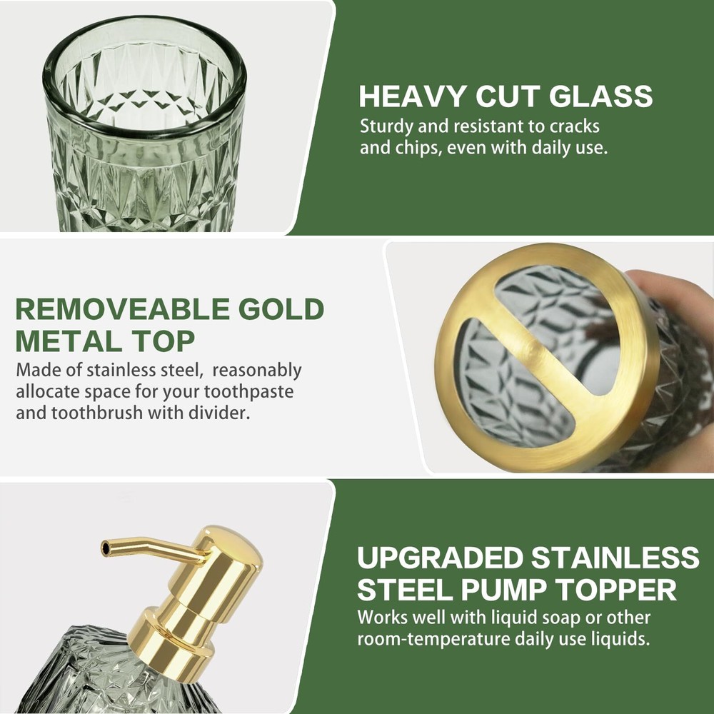 【WONDERFUL BATHROOM STORAGE SOLUTION】Do you want to an elegant and elevating storage solution for bathroom countertops? Our green bathroom accessories include a soap dispenser and toothbrush holder, soap dish, tumbler, and cotton swab jar, perfect for storing your toiletries or cosmetics, and keeping your bathroom counter fully organized and neatly . 【DURABLE HEAVY CUT GLASS】Unlike other fragile ceramic and inferior plastic bathroom accessories on the market, this set is made from high-quality glass material, which is sturdy and resistant to cracks and chips, even with daily use. It also has an easy-to-clean surface, making it simple to maintain and keep looking like new. 【STYLISH BATHROOM SET WITH UNIQUE DESIGN】This green bathroom decor features a unique design that is both stylish and functional. The green soap dispenser is suitable for hand soap, dish soap, conditioner, lotion, etc. The cotton swab jar comes with a lid that effectively prevents dust and water stains from entering, keeping cotton swabs, and cotton balls clean. The glass material and green color add a touch of sophistication to any bathroom decor. 【DECORATIONS FOR HOME OR BATHROOM】The bathroom set is versatile and can fit various styles from traditional to contemporary. It's suitable for modern, rustic, farmhouse and western styles, making it ideal for use in the bedroom, bathroom, kitchen decor, etc. It also can be a great christmas bathroom decor with green. 【ELEGANT GIFT SET FOR ANY OCCASION】This bathroom accessories set is not only a valuable addition to any home, but also a perfect gift for any occasion. It's an excellent choice for housewarming&new home gift, wedding gift, birthday gift, mother’s day gift, valentine’s day gift, Christmas gift, etc. 【PACKAGING UPGRADE&No BREAKING】Adopting high-quality pearl cotton internal packaging to reduce the risk of transportation breakage. Refuse to break the lid! PLEASE ATTENTION! After receiving the item, please open the packaging and check if the glass is broken. If so, please feel free to us and we will make it right immediately. Thanks for your patience. 【WARM TIPS】 Due to the strong or weak reflection of light in the bathroom, it may cause certain color differences in glass bathroom accessories. The brighter the light, the brighter the color of glass products. The weaker the light, the darker the color of the glass products.