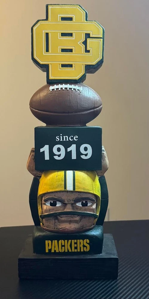 The "Green Bay Packers Vintage Garden Statue" is a solid green polystone ornament featuring the official logo of the Green Bay Packers. Measuring 18 inches in length, 6 inches in height, and 7 inches in width, this statue is designed for outdoor use in a garden or yard. It is a officially licensed product from Team Sports America, making it a great addition for any Green Bay Packers fan to display their team pride in their outdoor space.