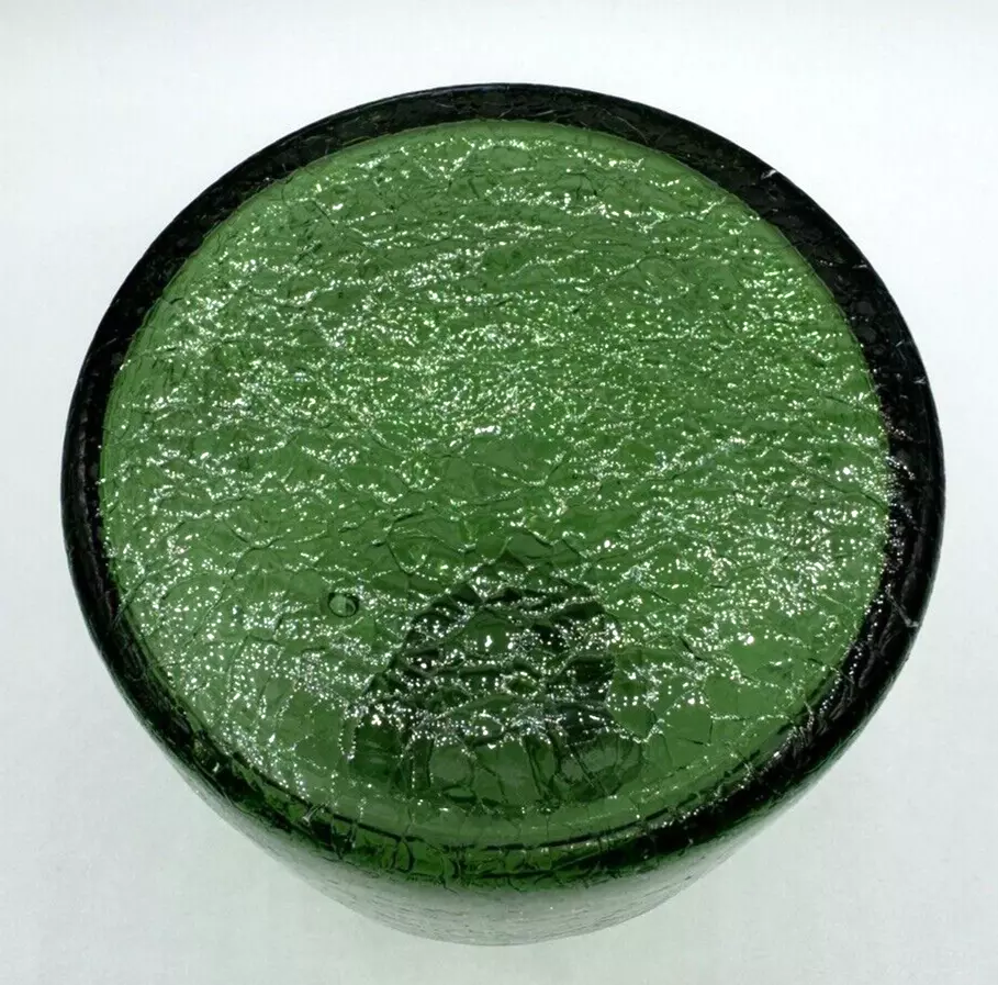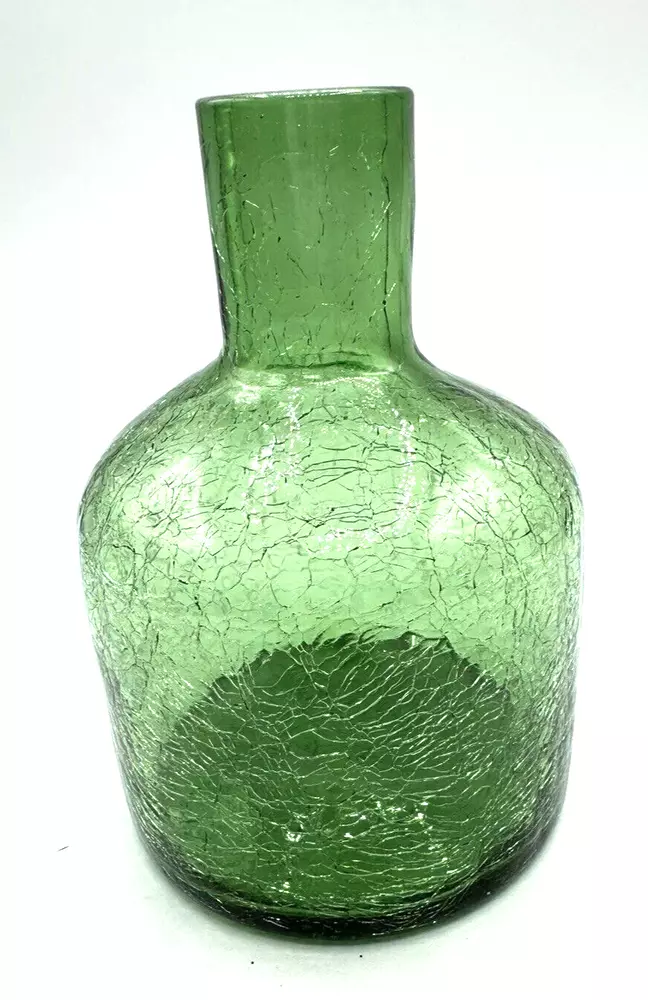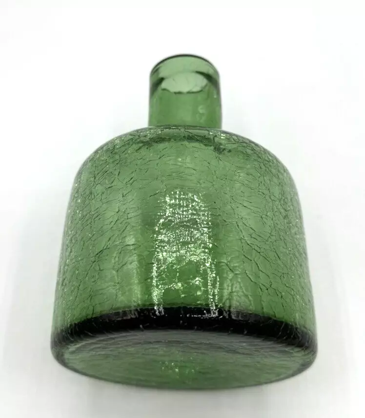 Green Crackle Art Glass Bud Flower Vase 6" tall, 4" wide mouth of bottle is 1.5" across no chips or cracks