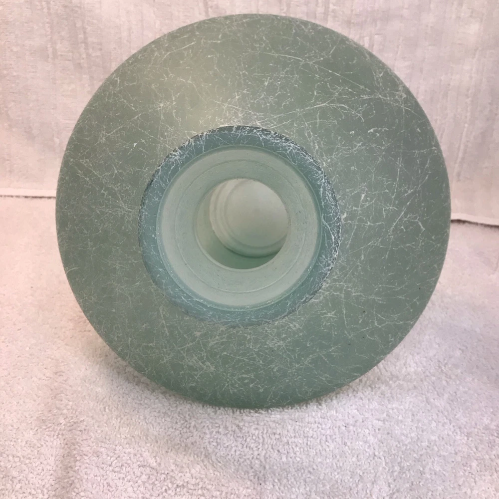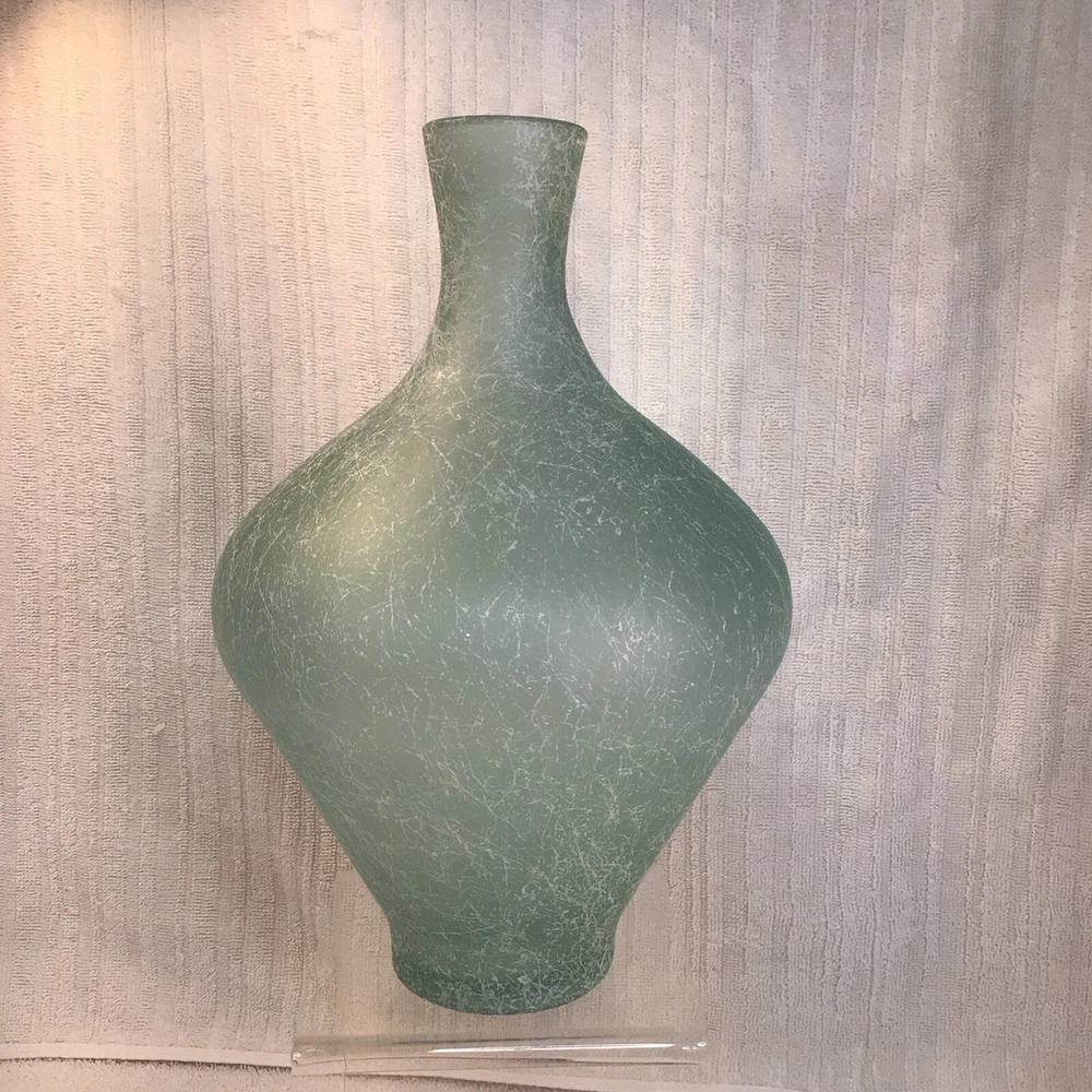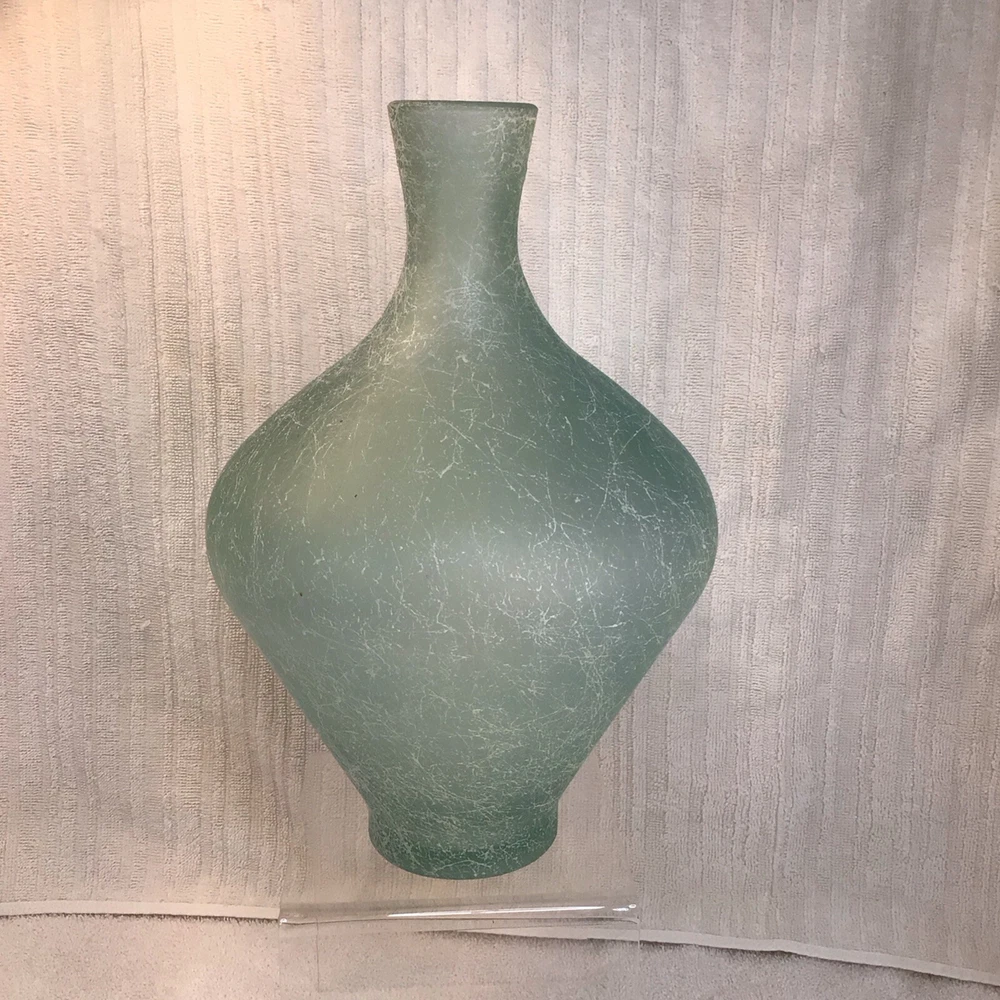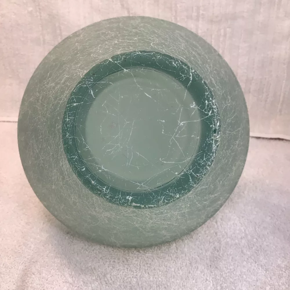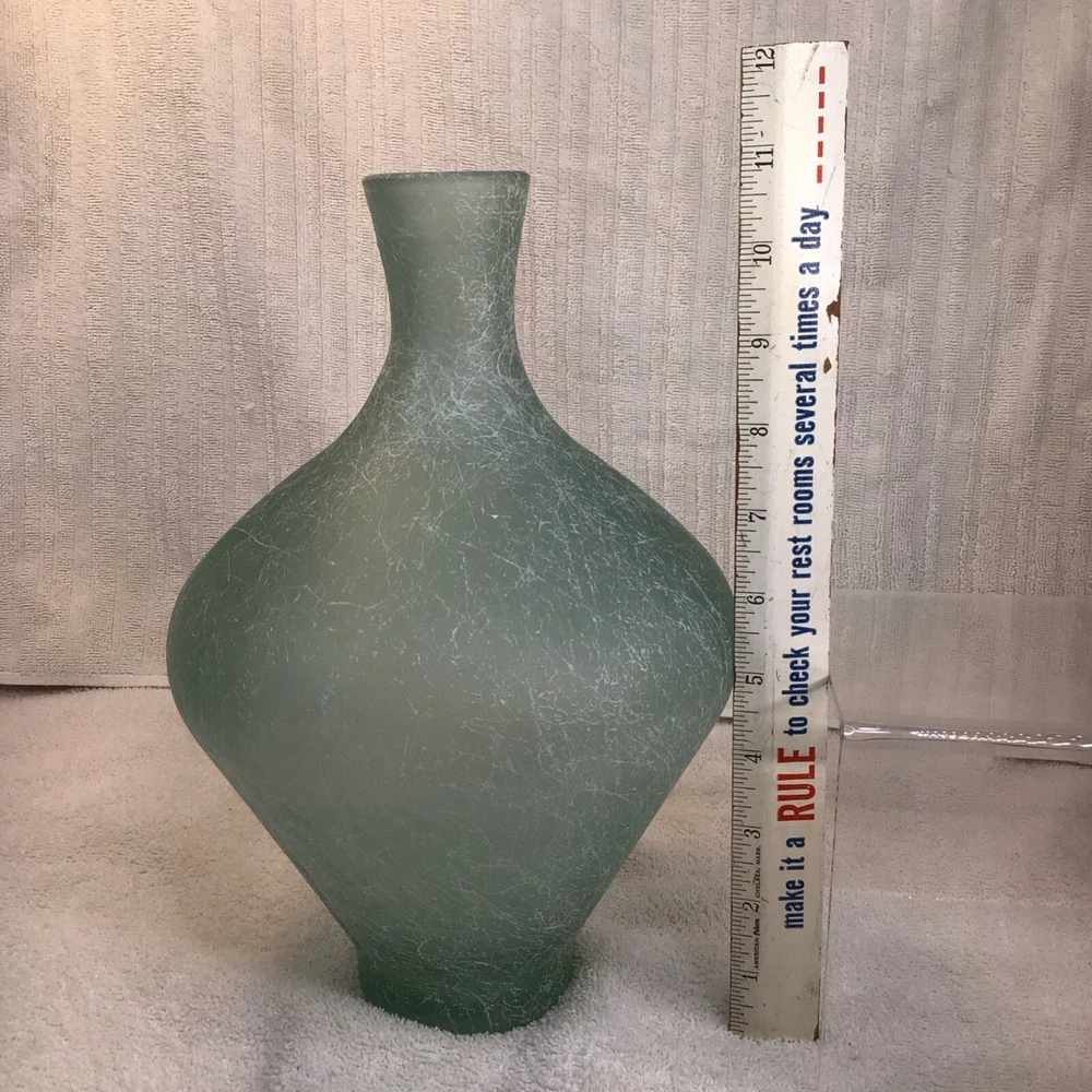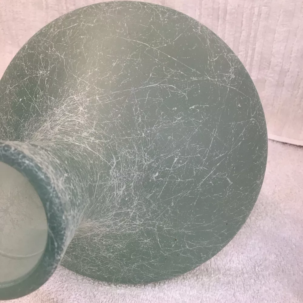 This is an unmarked Mid-Century Modern (MCM) vase made of green crackle glass. The crackle glass production style gives it a unique and eye-catching textured appearance. Perfect for adding a touch of retro charm to any decor, this vase would certainly stand out as a decorative piece in a home or office setting. Unknown age or origin. In great condition, no chips or cracks. Please look at the pictures closely, as this is the item that you will receive.