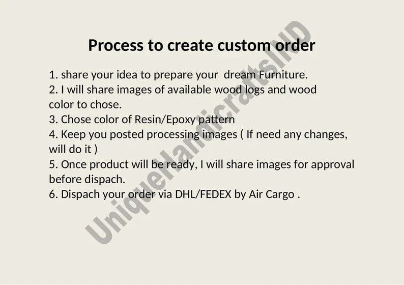 Welcome To Our Shop Unique-Handicrafts Description Used Material: Epoxy Wooden And Resin Handmade Arts Size: According To Size Variations Color: As Photo Shape: Rectangle Pattern: Handmade Room: Bedroom, Dining Room, Hallway, Home Office/Study, Kid’s Bedroom, Kitchen, Laundry/Utility Room, Living Room, Patio, Playroom Packaging: Wood & Foam Export Packing Shipping: Air Process of Making Epoxy Table This is a Epoxy Resin Gaming or Trading Desk made with Walnut which is beautified with colored pigment . The resin river table is brand new and the contemporary design would be a unique addition to your home. With its perfect combination of style and function this piece of furniture is sure to be the star of any room. This modern table will also make for an awesome gift for your friends or relatives. Each one is created with high quality resin and individually handcrafted. Resin is a highly reflective medium which will catch anyone’s eye walking into the room. All tables are finished to the highest standard. The epoxy resin is very strong & durable with specialised UV resistance. The tables are delivered flat packed. Simply bolt the legs. This listing is for a custom Live edge Wooden Table. We have access to thousands of live edge slabs of domestic and exotic species that are imported from around the globe. We use only the highest quality of hardwoods and materials in our work, and believe only in perfection. Kindly Note: As raw wood is used in its natural form and shape to make the table, the table shown in the photos has already been purchased so actual product may vary from the picture shown.Can be Customize, Please message your desired shape and size . We welcome your personalization request (custom request) as per your size, shape and design but you have to pay spare money. This is only table top which does not include any wooden, marble legs/base/stand if you like to buy marble or wooden legs/base/stand you need to spend spare money for it. We are unable to ship to a PO Box address & for Russia, Brazil country we need firm entity name or business name parcel will not go to individuals name. If you have any query please feel free to contact us. NOTE : Only table top leg is not included. Kindly Note: Please contact me if you have any kind of query.Buyers are liable for any customs and import taxes that may apply. I'm not liable for delays due to customs. Buyers are liable for any customs and import taxes that may apply. I'm not liable for delays due to customs. Please contact me if you have any kind of query.