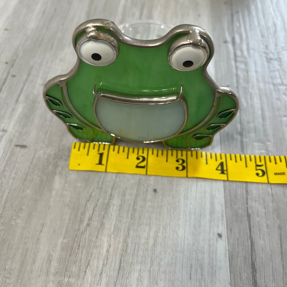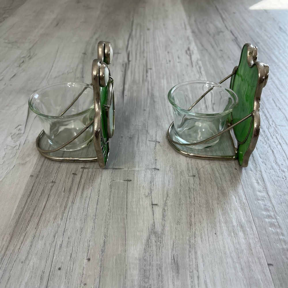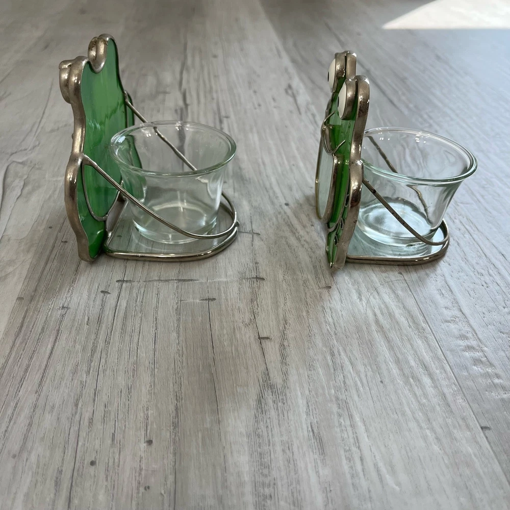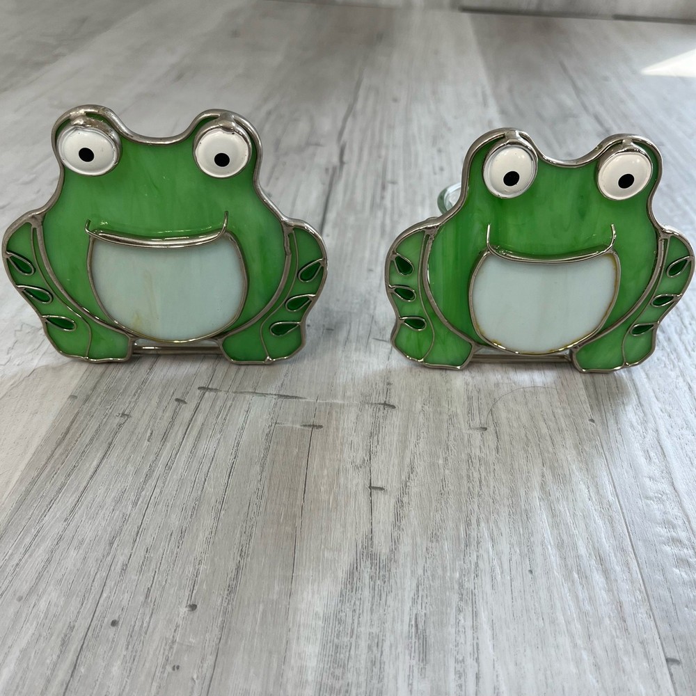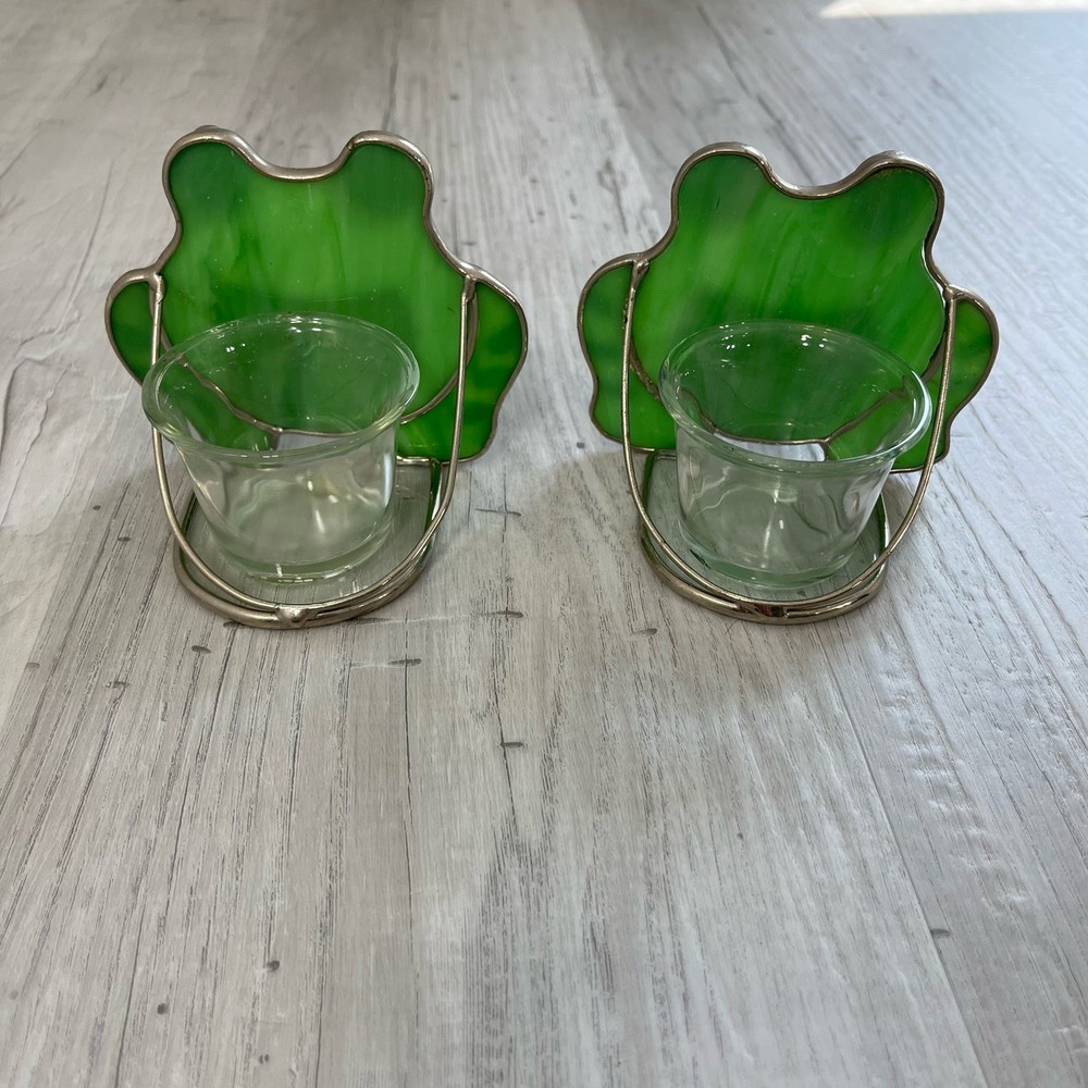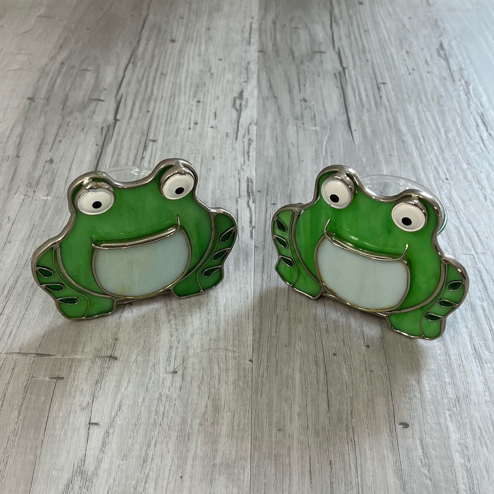 Pair of stained glass frog tea light votive candle holders Stained glass outlined with metal Glass candle holder is attached The mouths of the frogs use to be yellow but has worn off Still in great condition Approximately 3.5" W 3.75" H Measurements are approximate Colors may differ based on others computer/phone/etc settings