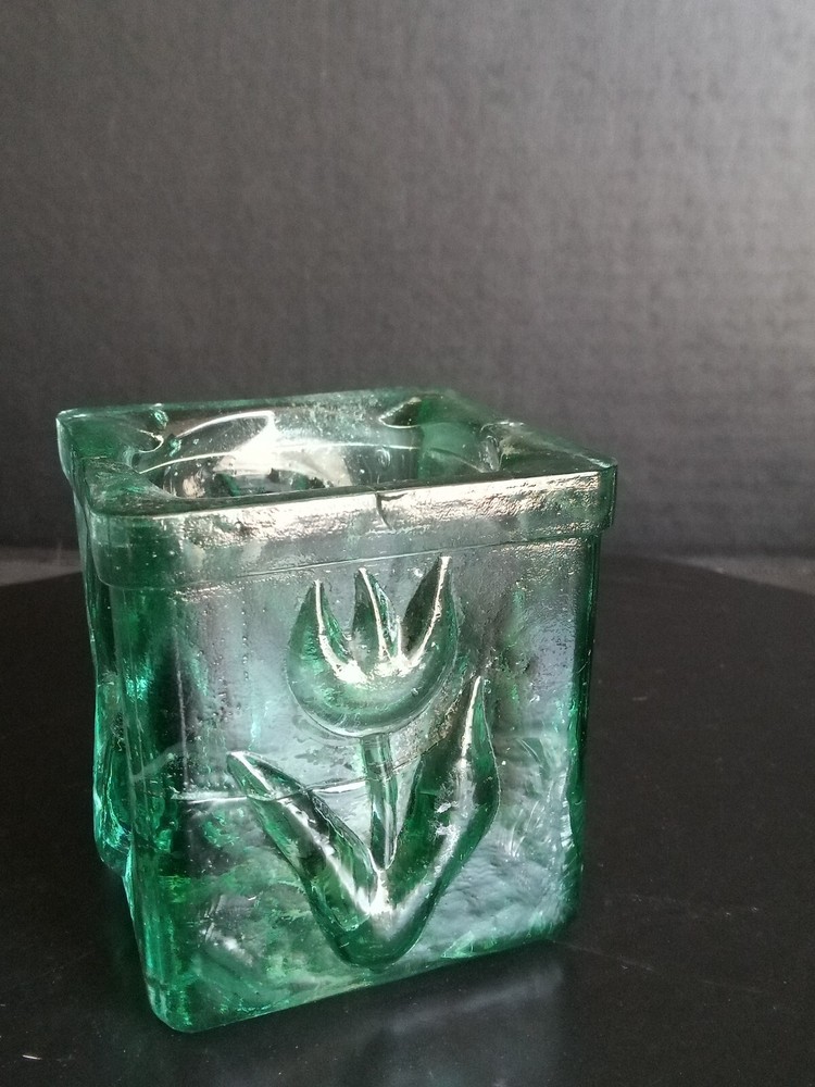 Green Glass Tealight Candle Holder Tulip Pattern Chunky Heavy 3" Tall