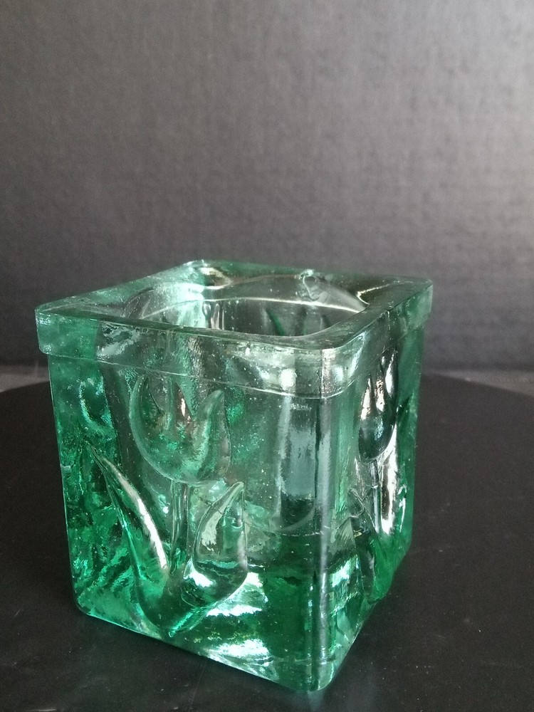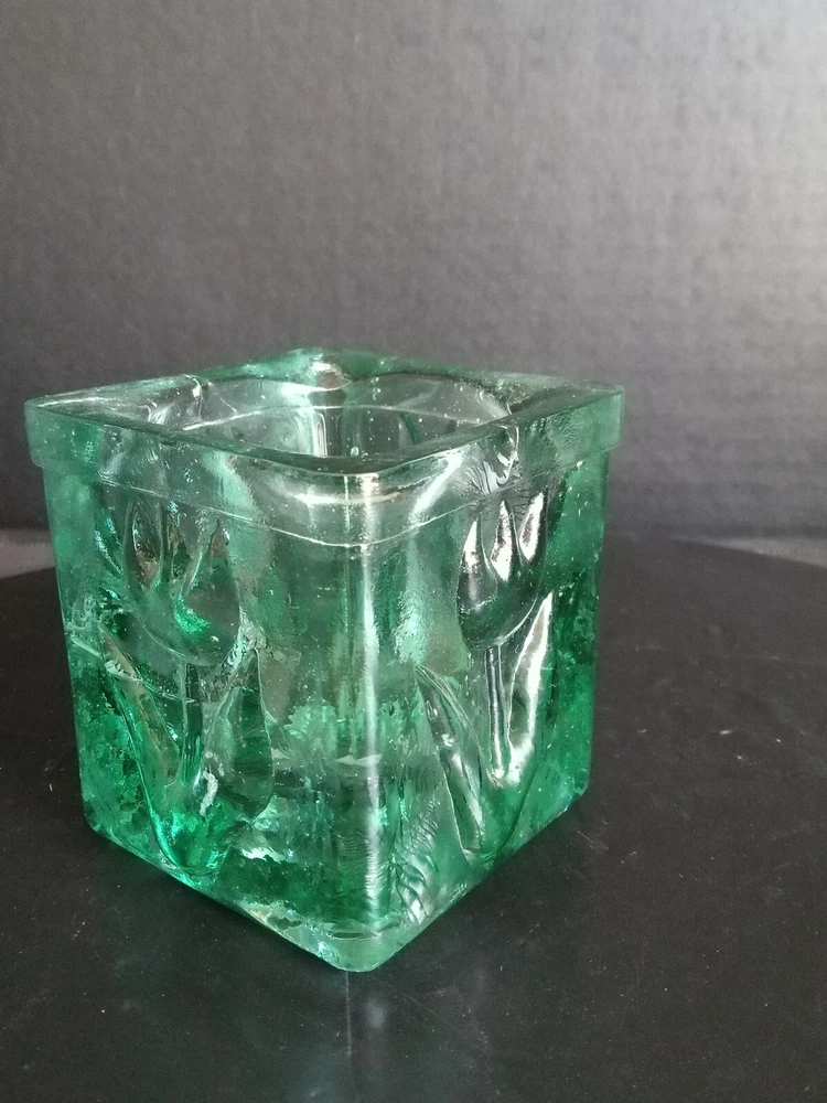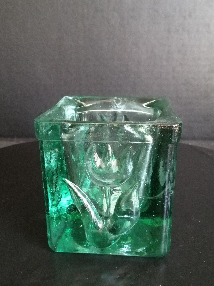 Green Glass Tealight Candle Holder Tulip Pattern Chunky Heavy 3" Tall Pre-owned.