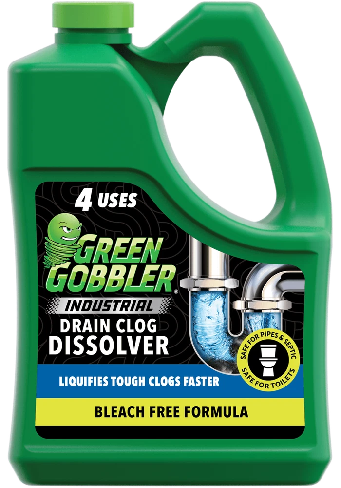 Say hello to our strongest clog remover and goodbye to slow-moving drains. Our Green Gobbler Industrial Strength Hair & Grease Clog Remover formula effectively dissolves hair, grease and toilet paper with a proprietary blend of alkalinity and surfactants. That means it clears clogs and removes hard water and mineral deposits. This 64-ounce container of Industrial Strength gel is 3X thicker to stick to clogs in toilets, sinks, showers and more. It’s safe for all pipes and septic systems, and it’s free of odors and fumes. That’s right. No bleach or sodium hydroxide. Break through the toughest clogs with Green Gobbler Industrial Strength Gel. EASY TO USE: Forget the plumber. Pour Green Gobbler in standing water and it will do the rest. The Industrial Strength gel is 3X thicker than our standard formula to better cling to clogs and keep your pipes flowing properly. ELIMINATE THE TOUGHEST CLOGS: Liquefy hair, grease, toilet paper, soap scum, organic material, flushable wipes and more. It uses a proprietary chelating agent to clear clogs and remove hard water and mineral deposits. WORKS ON: Toilets, sinks, showers, tubs, and drains. It's safe for all pipes and septic tanks.